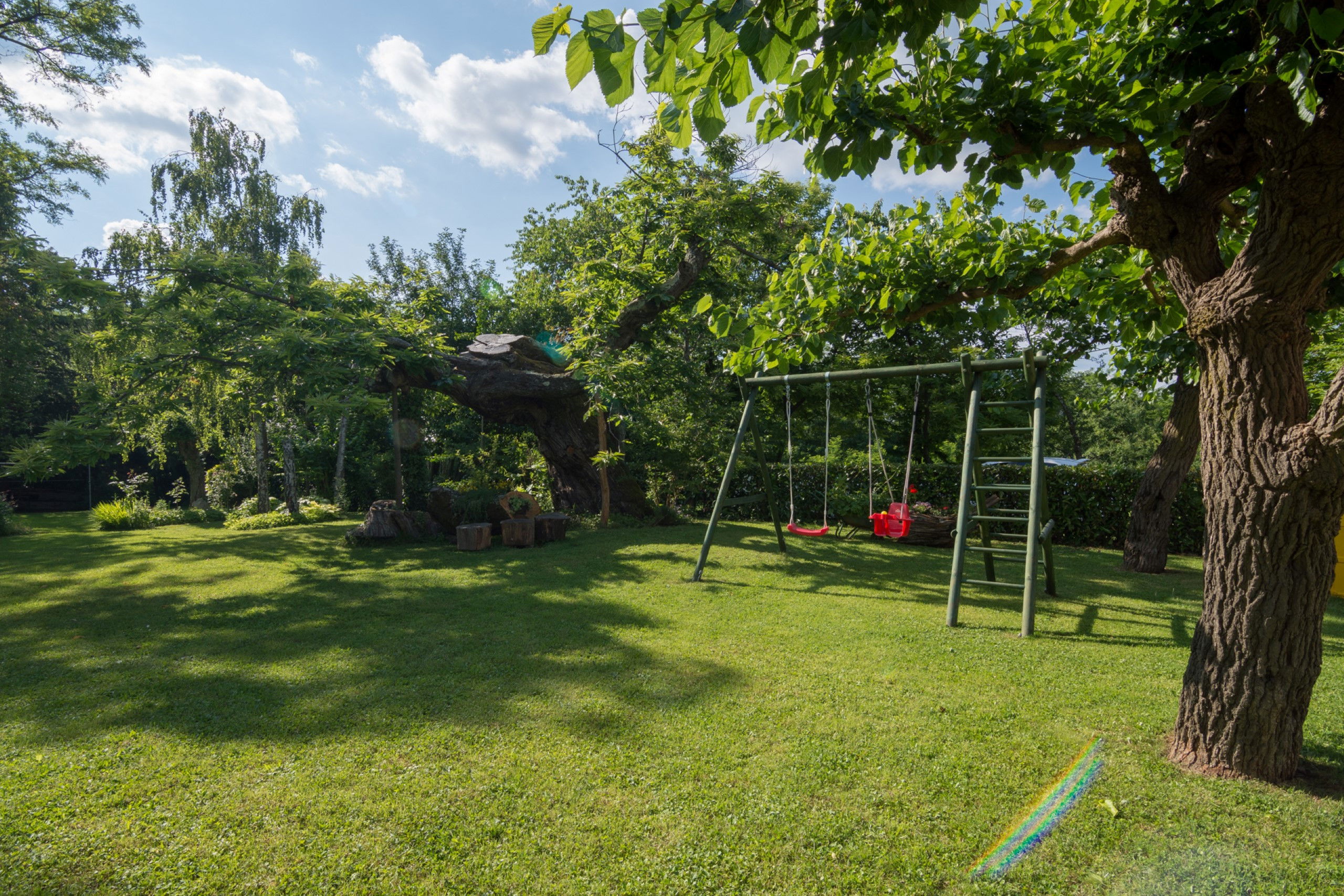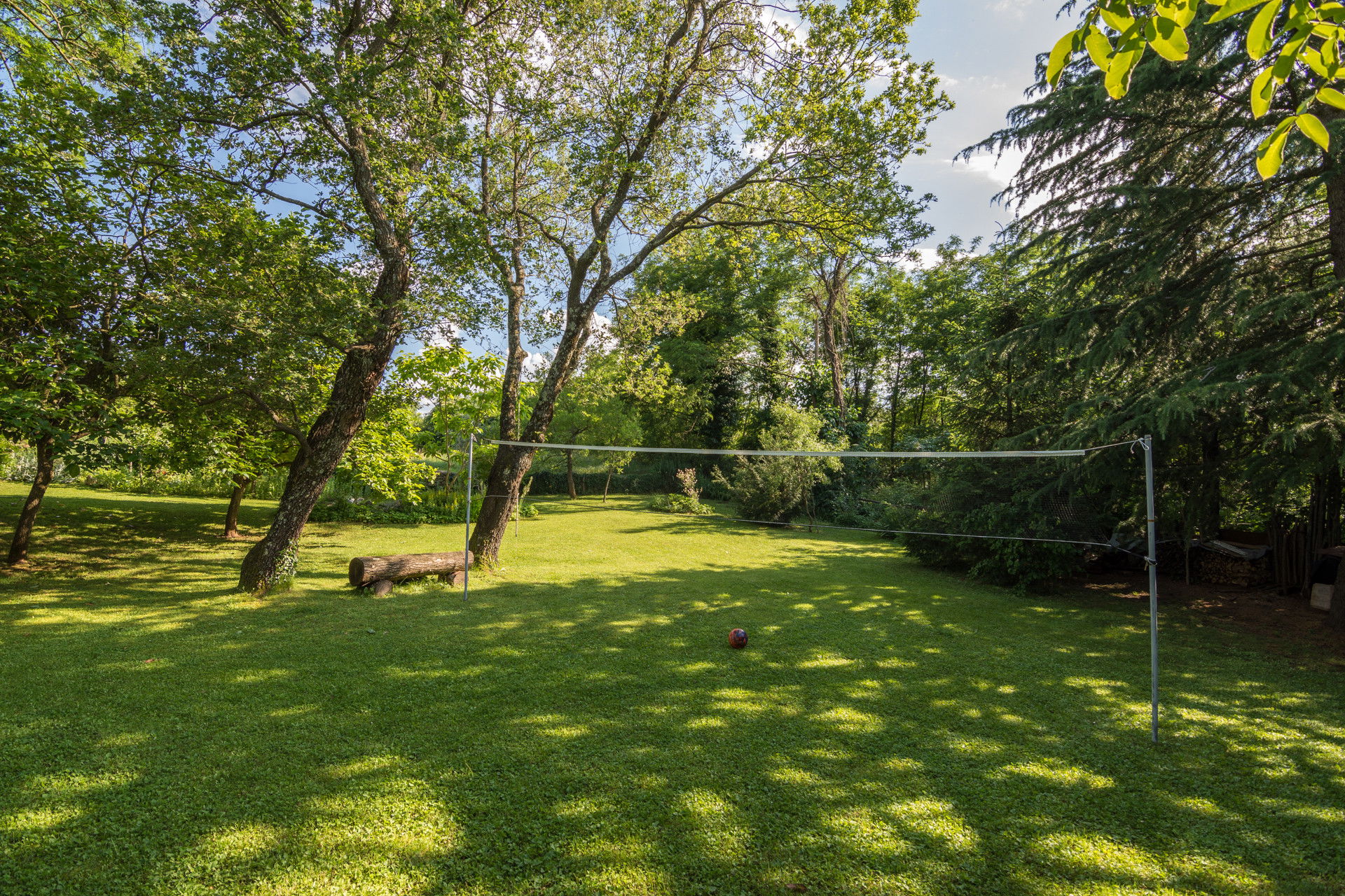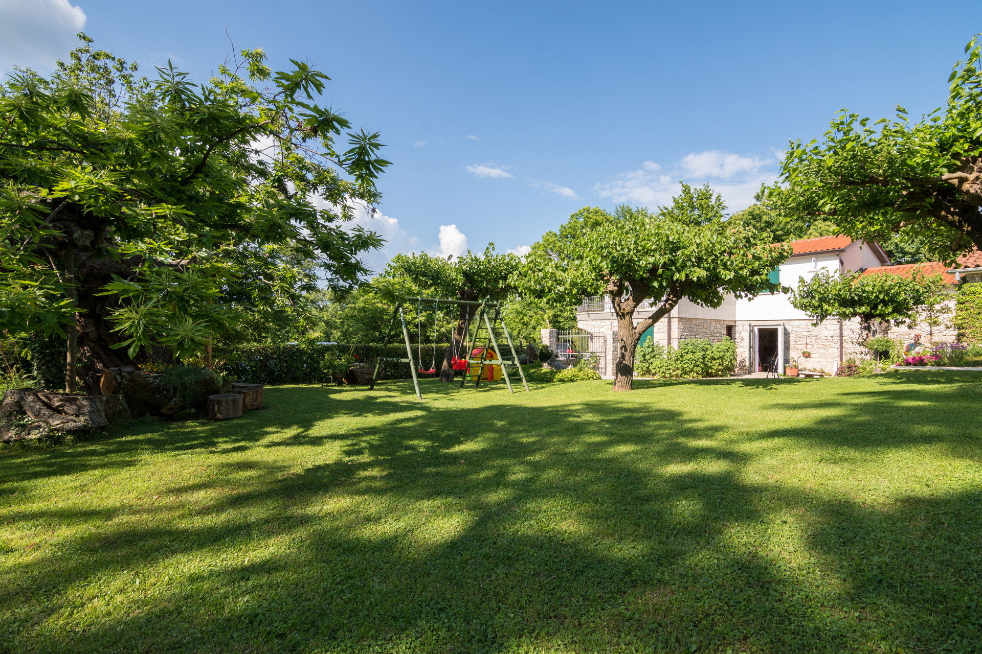 - **Children’s play area** with **swing**, **slide**, and **volleyball net**