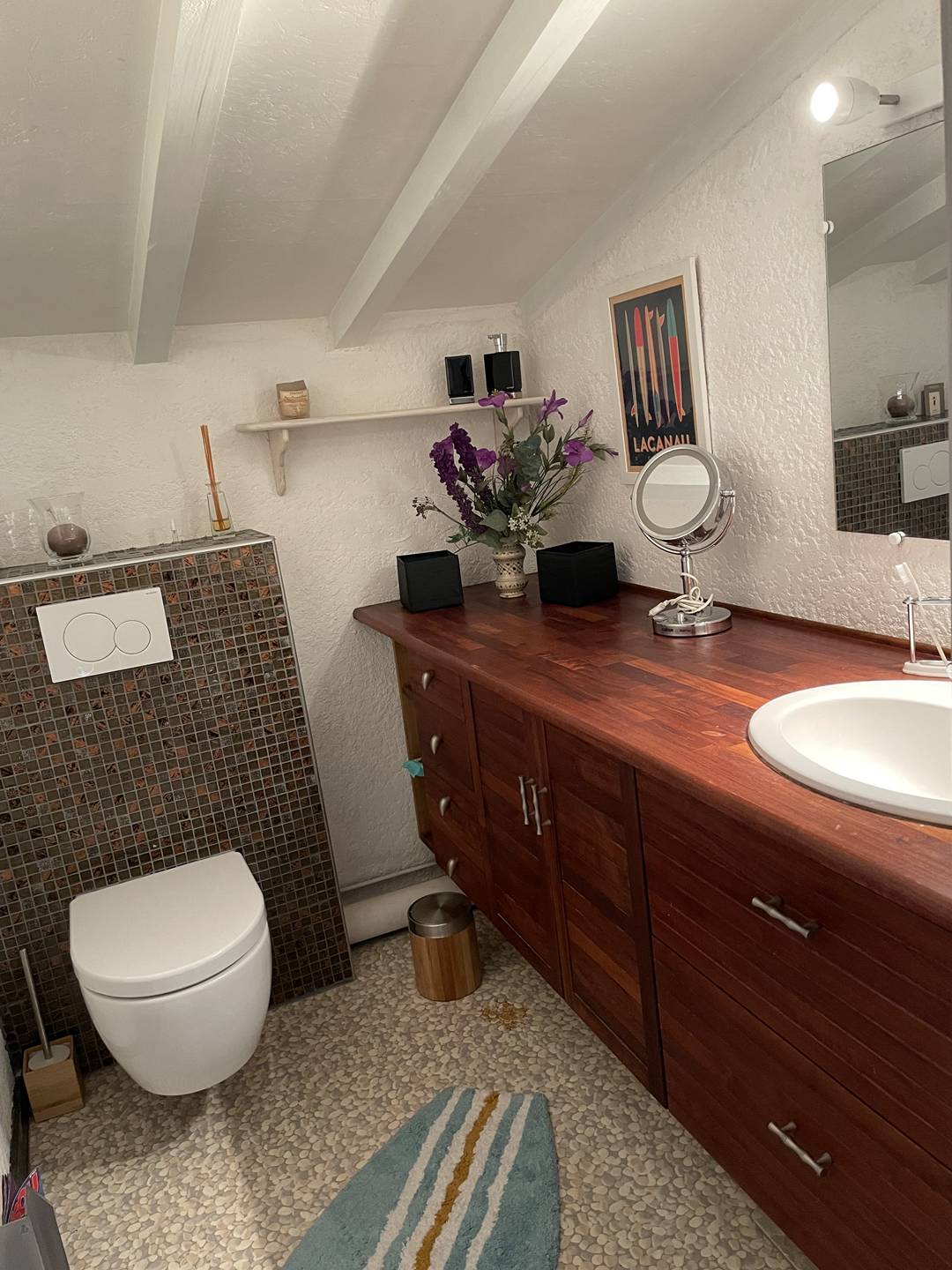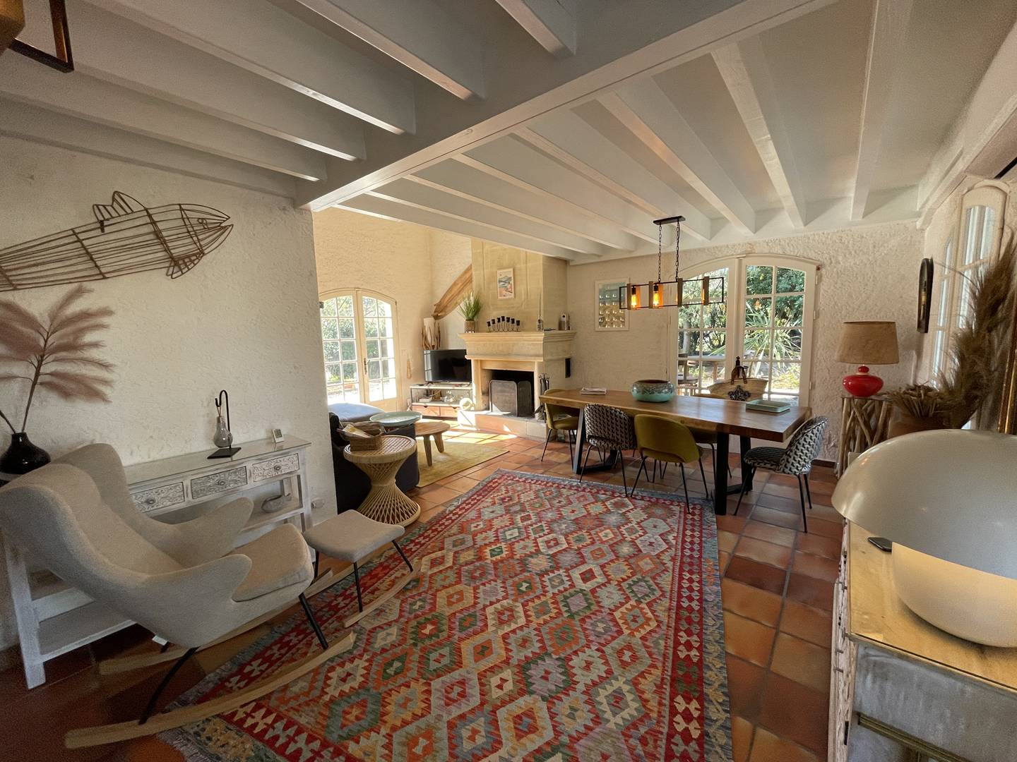 On the ground floor, entrance on a large living room of 32m² with living area with fireplace and a dining area. Wifi included and good quality throughout the house. Corridor leading to a bedroom with a double bed 180 cm, a bathroom with walk-in shower, separate toilet and a laundry and dressing area. The kitchen is equipped with central island leading by glass door to a south-facing terrace with garden furniture and electric awning.