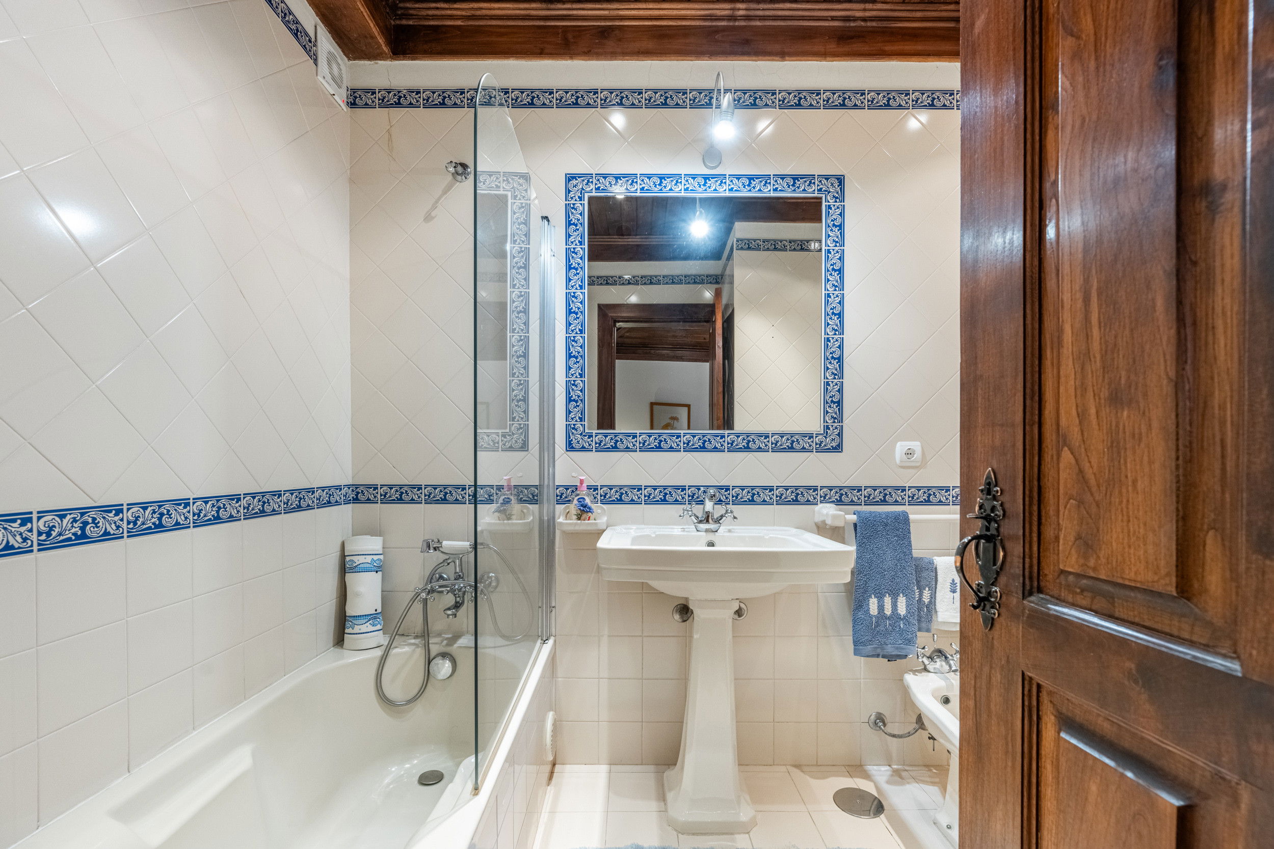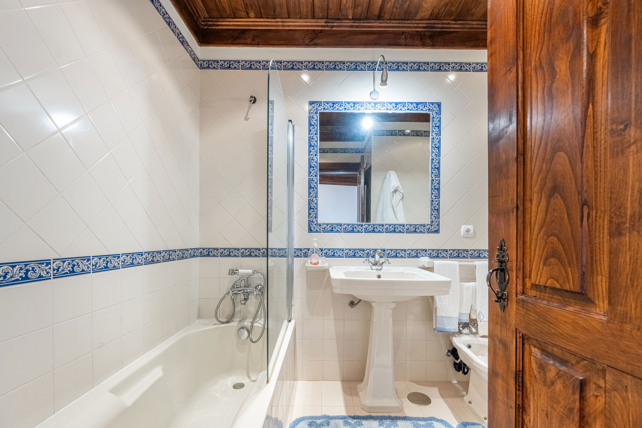 Upper floor: Master double bedroom with ensuite bathroom. Door opening onto covered balcony. Living room with sofas, open fireplace, cable TV, DVD player and music centre. Doors leading onto covered balcony overlooking the patio and two bedroom cottage. Couple of steps leading up to bedrooms wing - three twin bedrooms with ensuite bathrooms and doors leading onto the balcony that runs the full length of the house. Delightful views over the valley. Steps leading down to the pool area. Covered terrace with table and chairs.