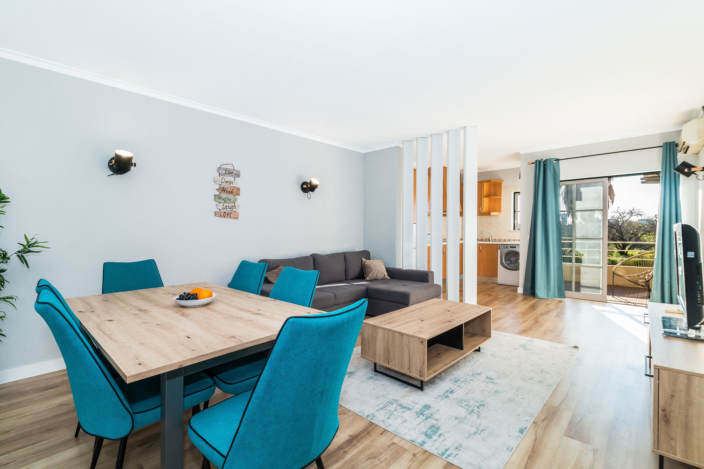 ✔ Living room with Smart TV, dining area, and access to the balcony