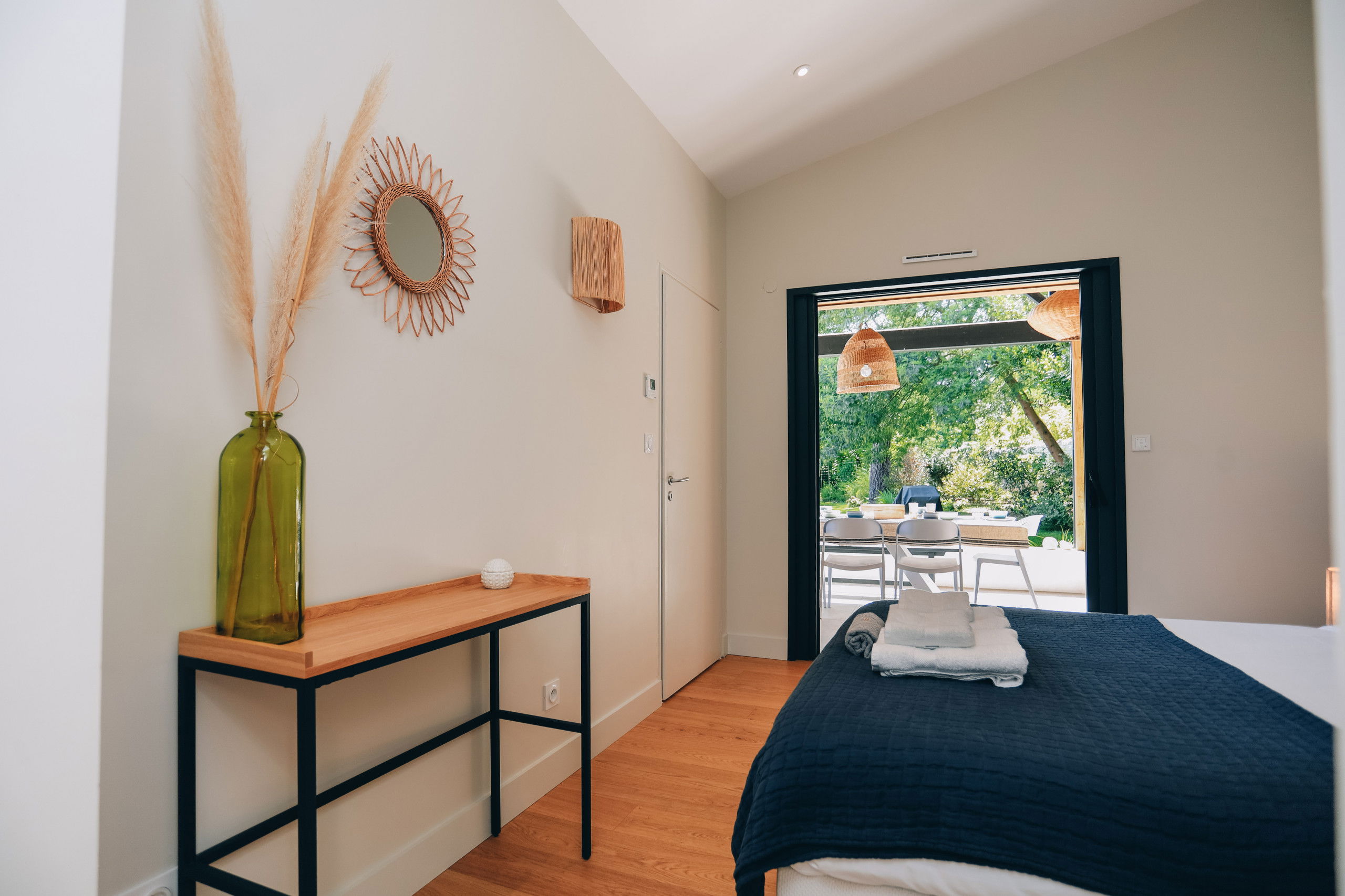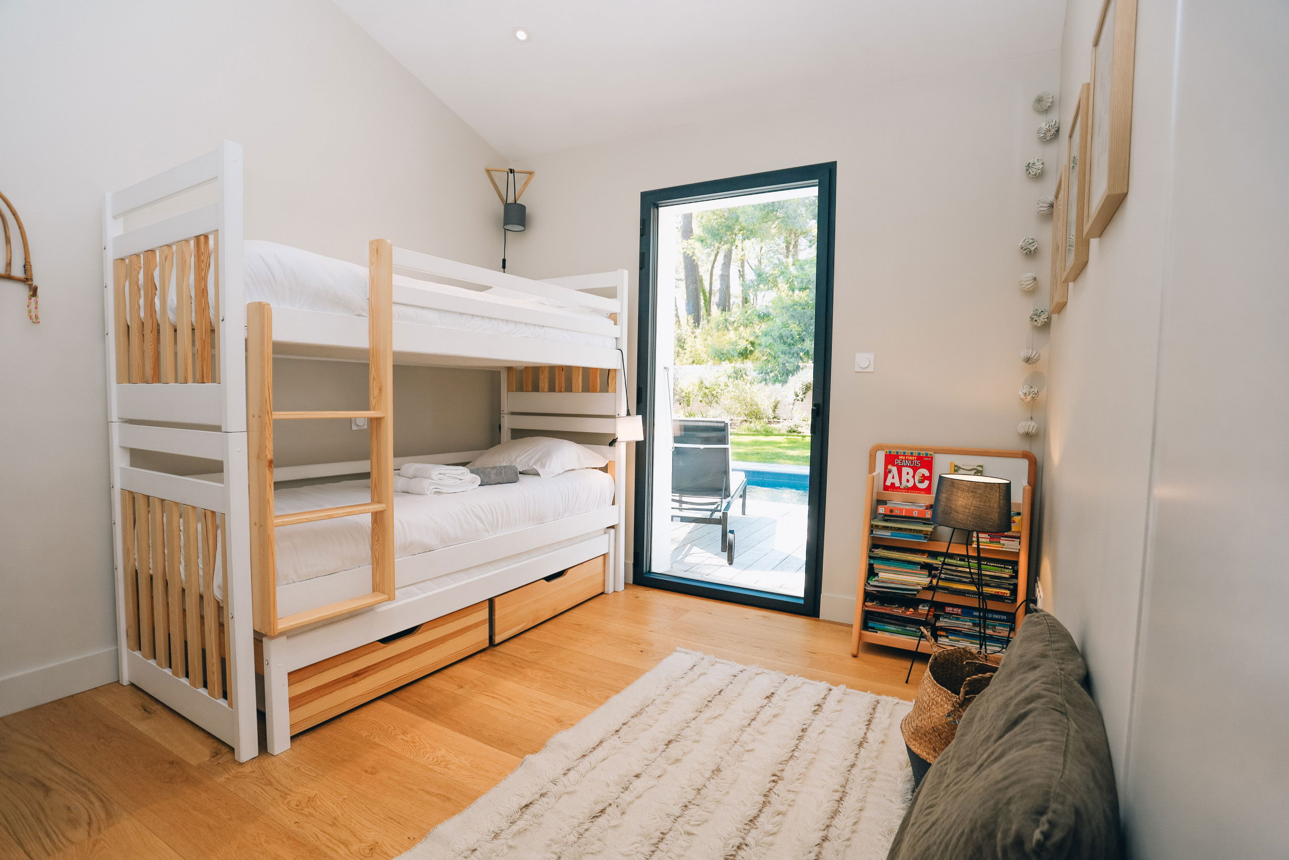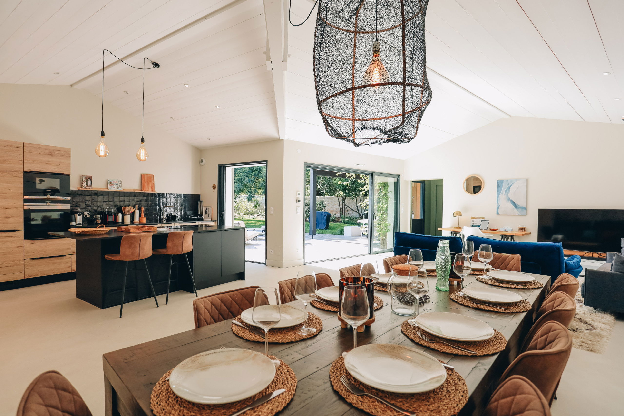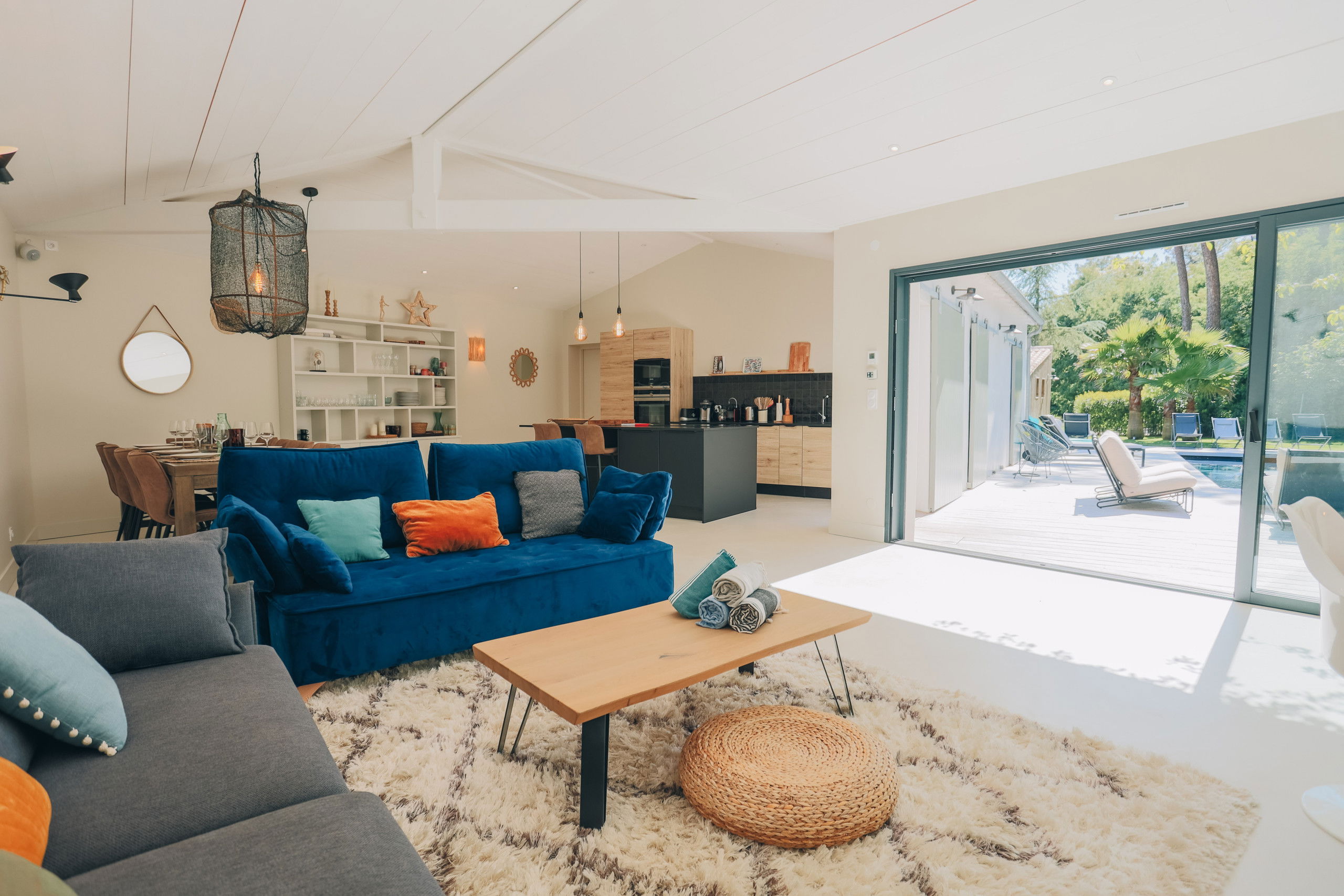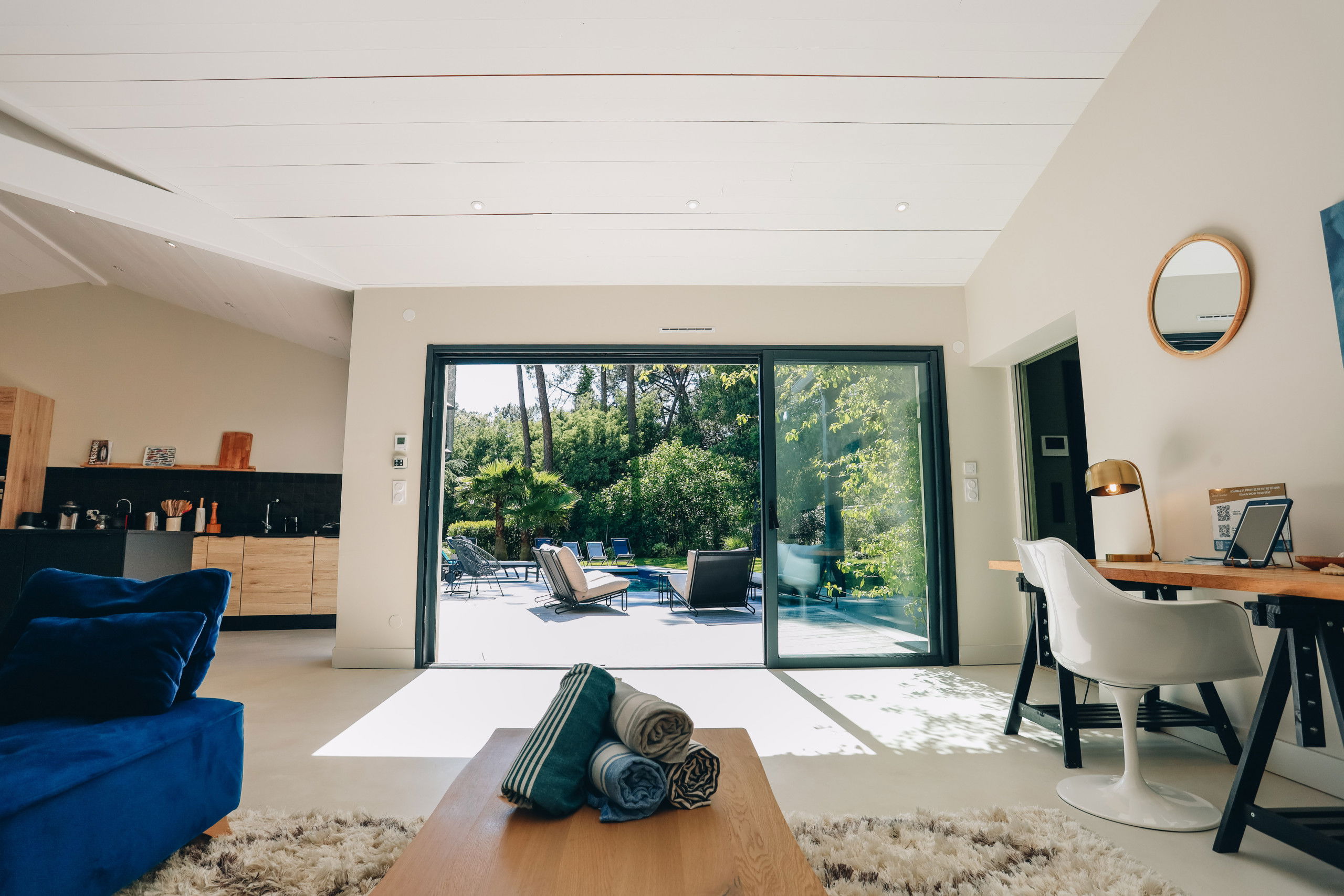This new house from 2022, on one level, has large living spaces bathed in light. The layout of the bedrooms and living spaces makes it an ideal home for several families or for a stay with friends.