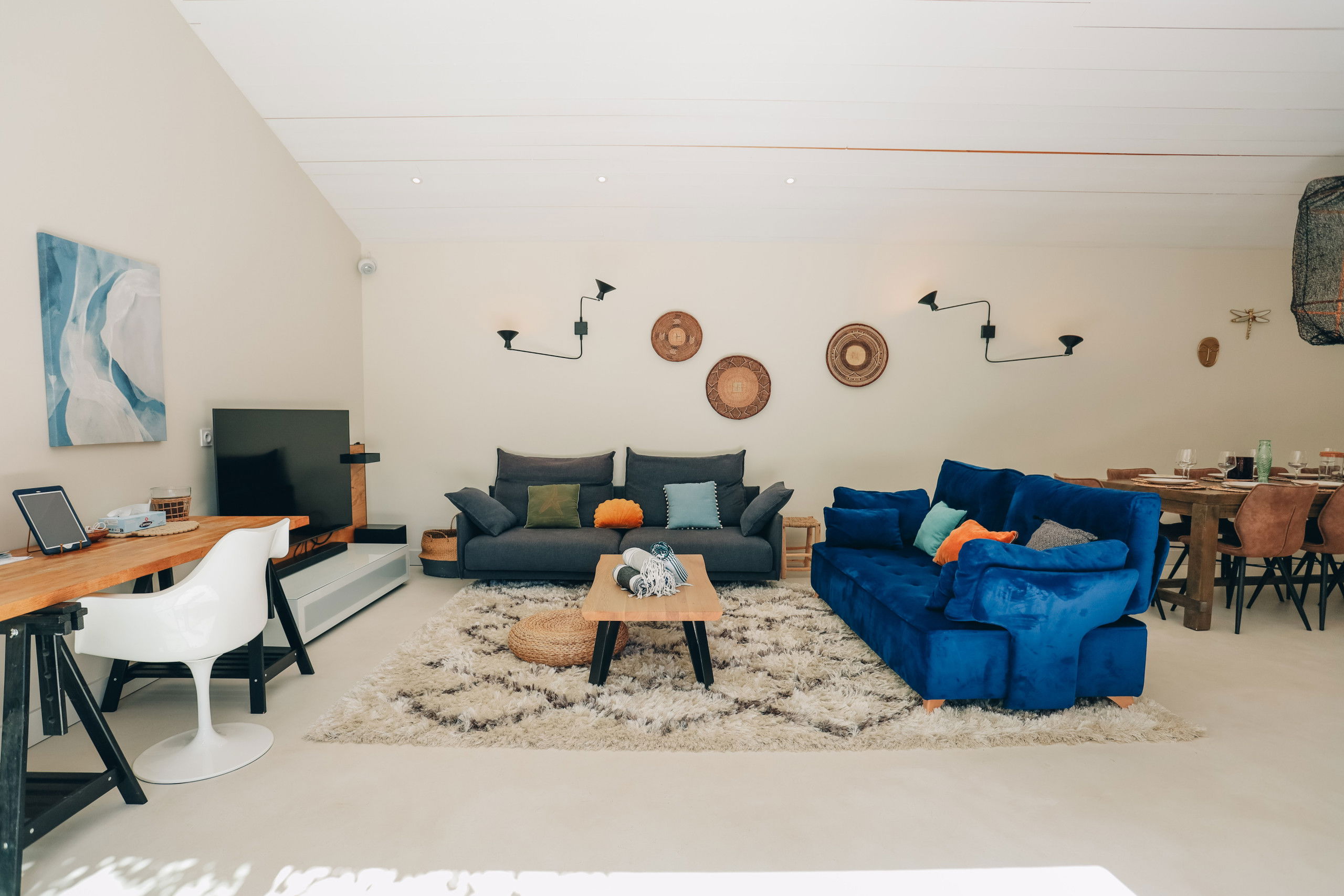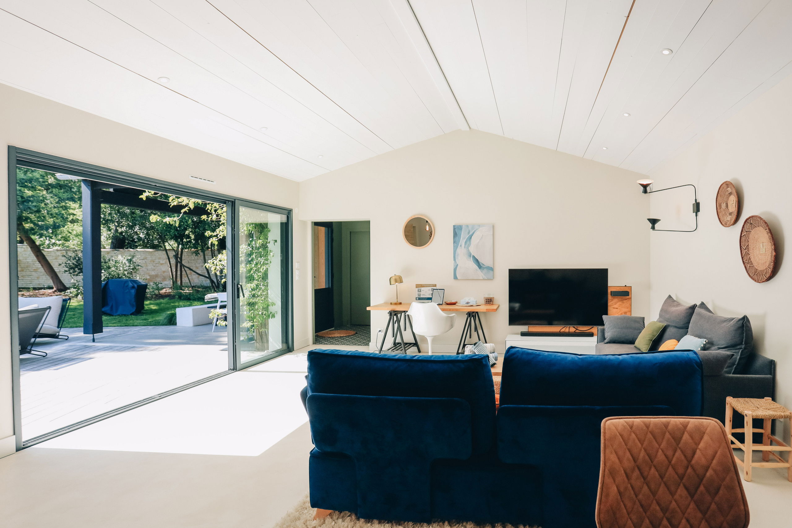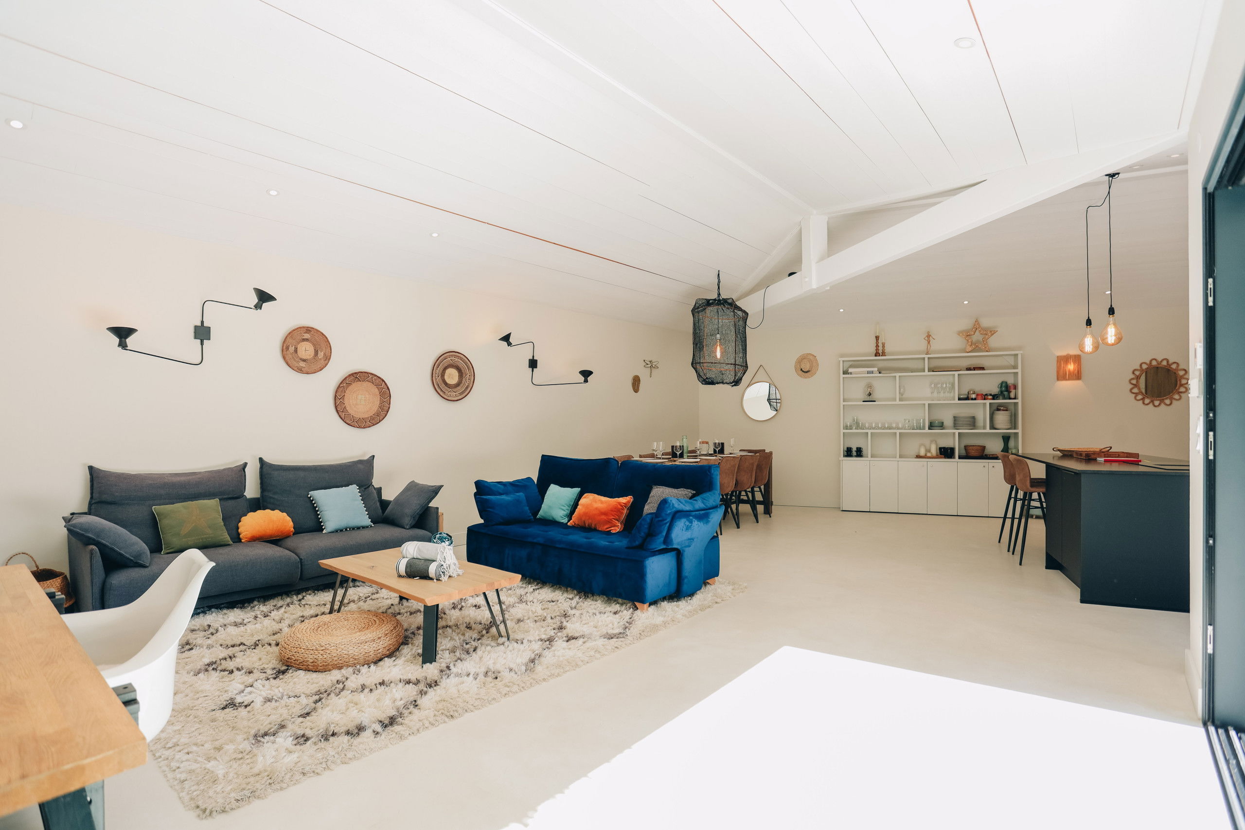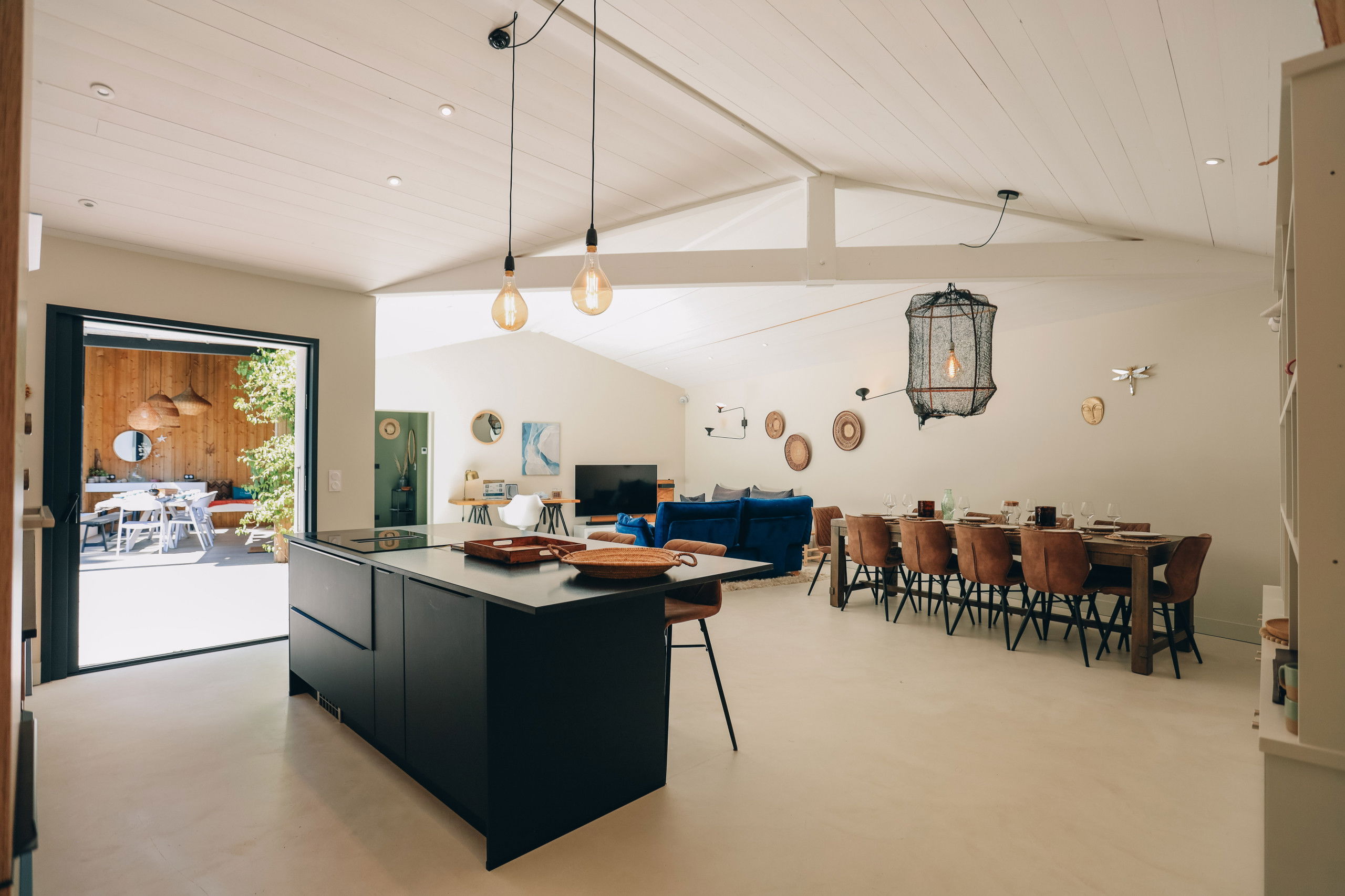 This new house from 2022, on one level, has large living spaces bathed in light. The layout of the bedrooms and living spaces makes it an ideal home for several families or for a stay with friends.