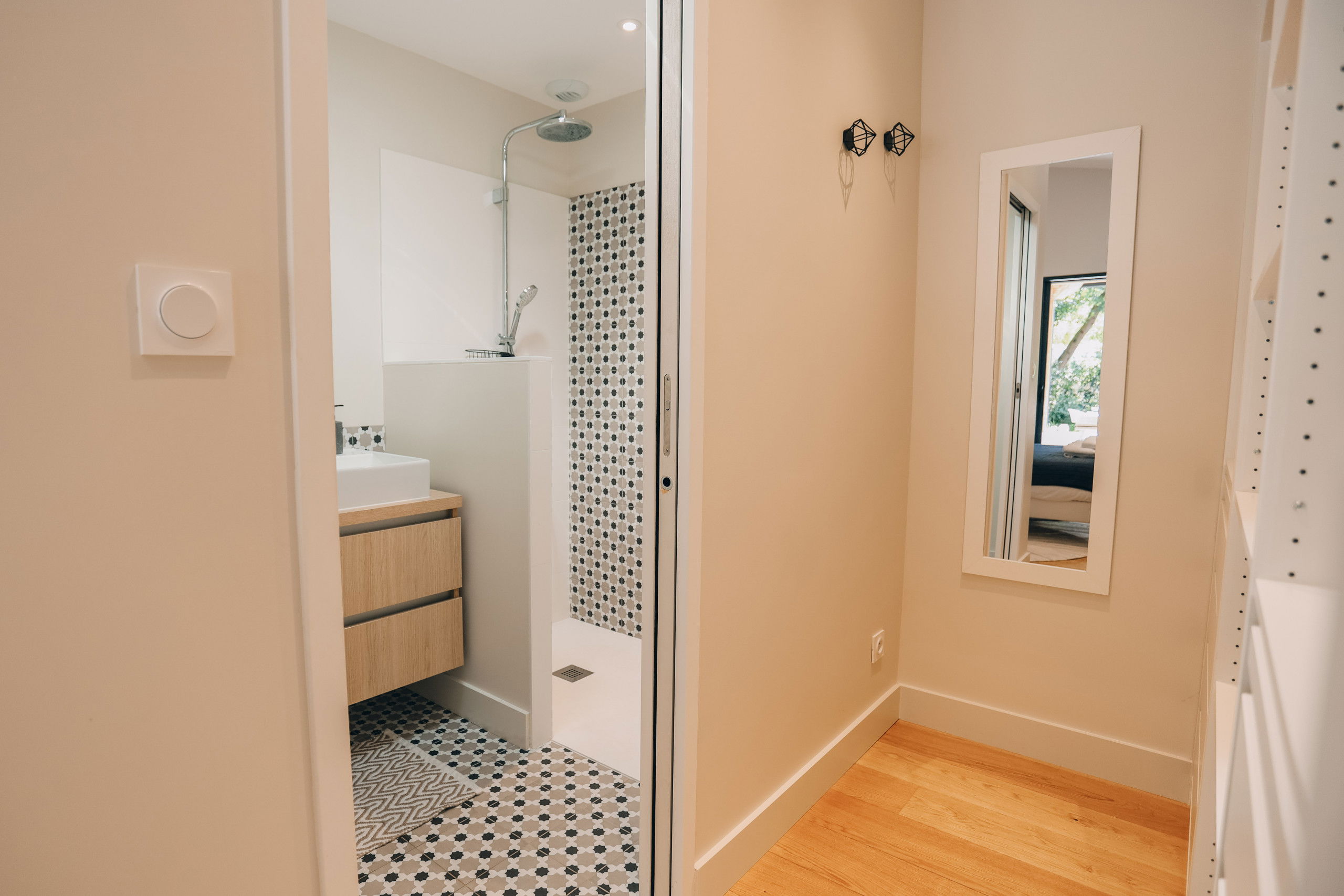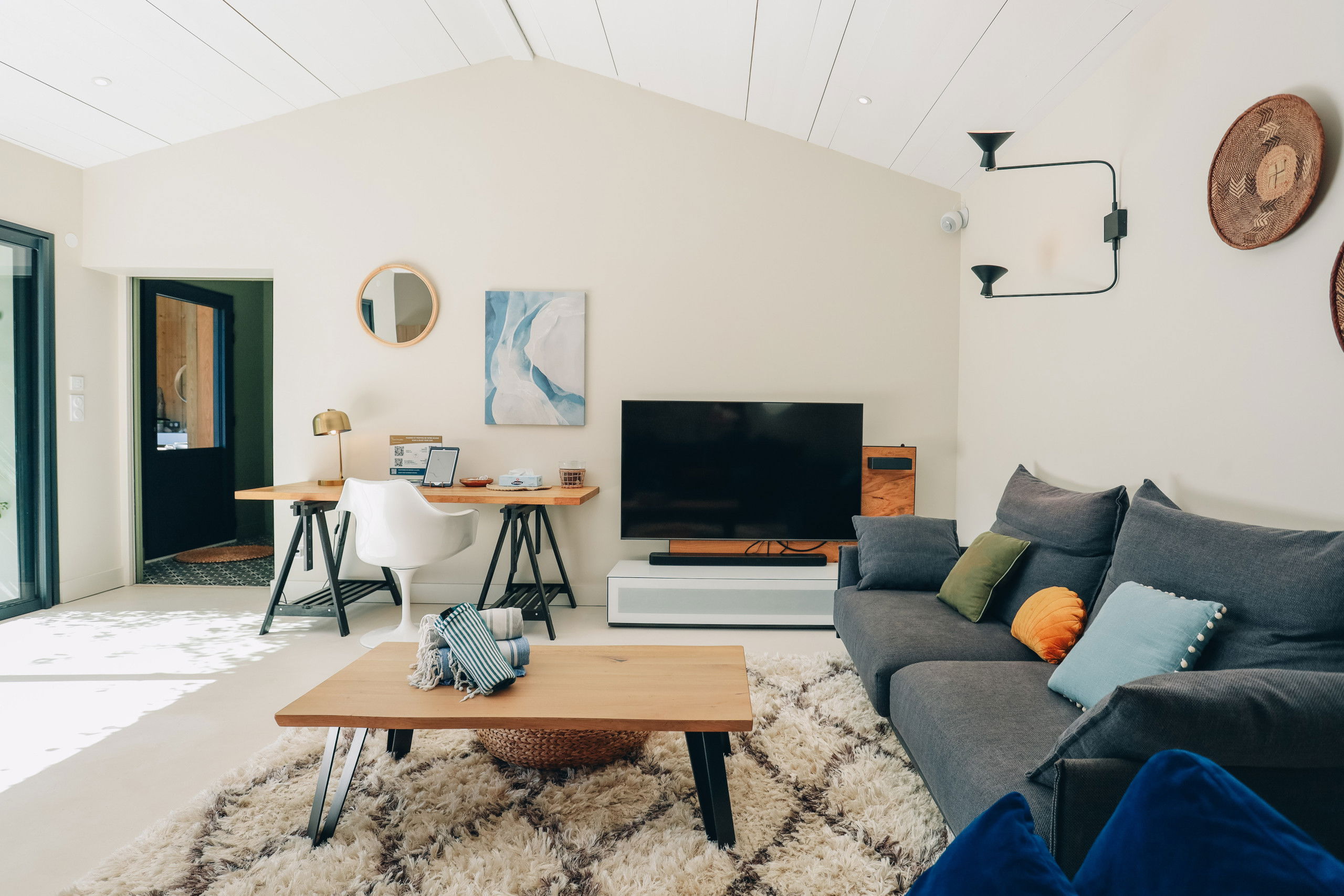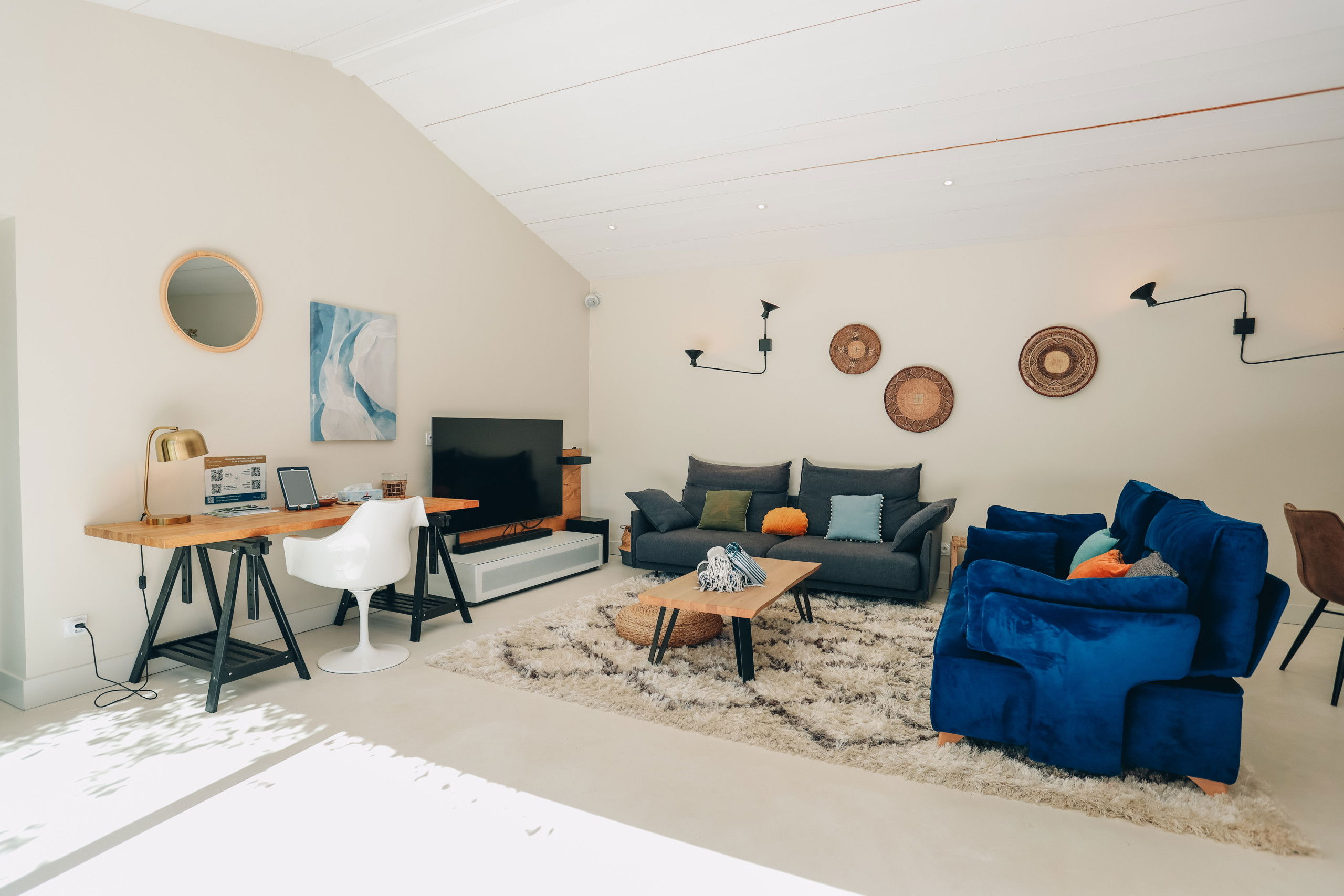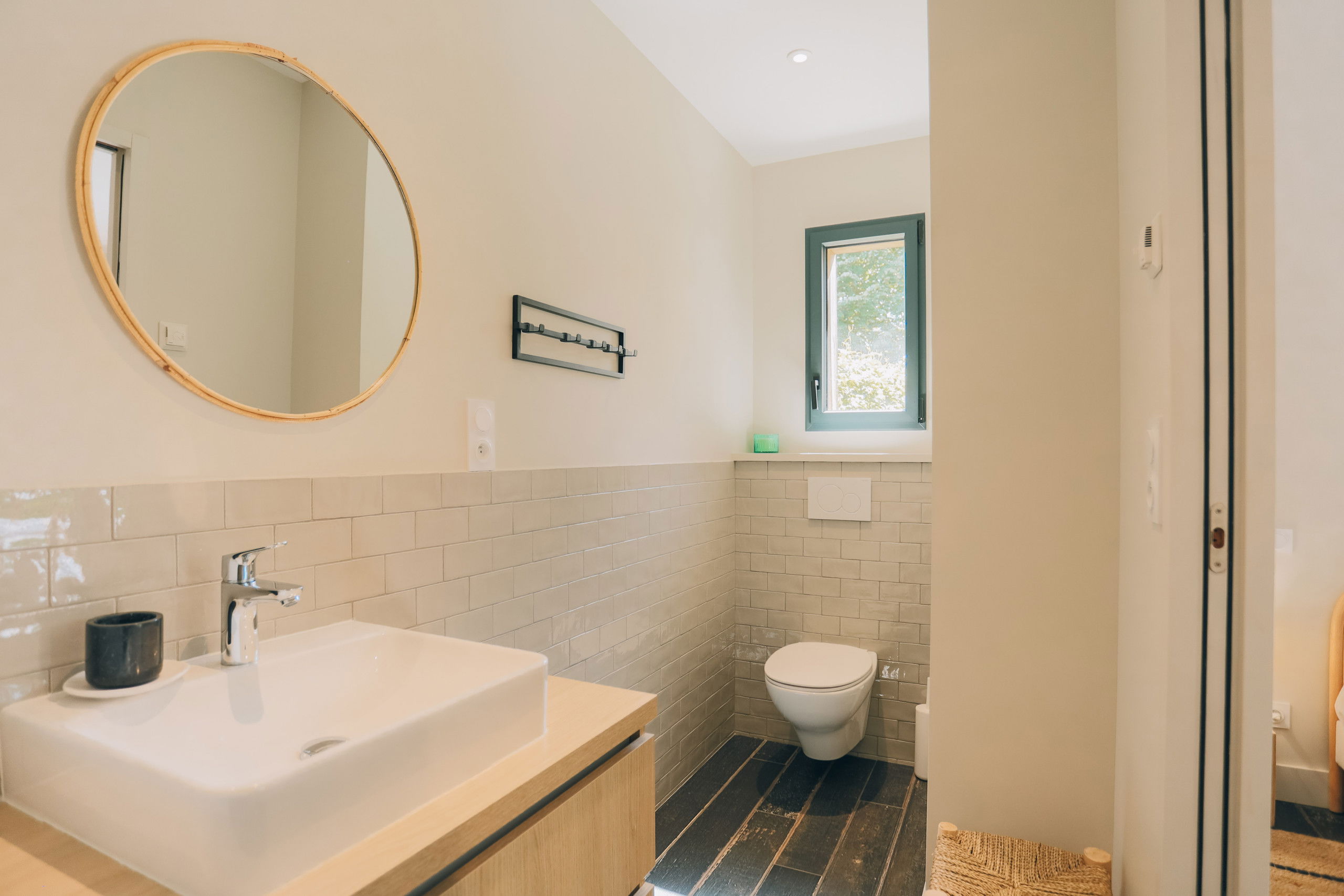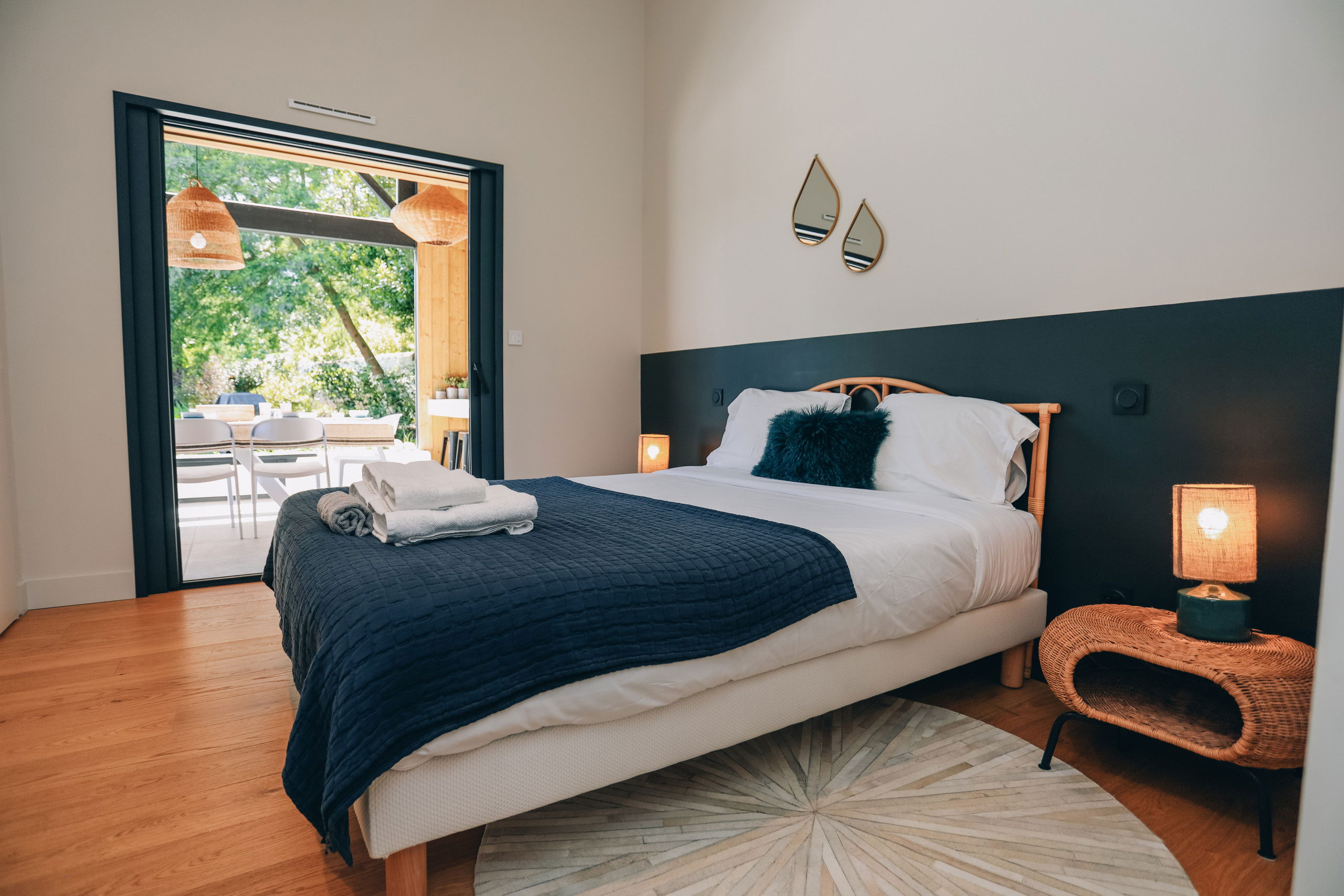 This new house from 2022, on one level, has large living spaces bathed in light. The layout of the bedrooms and living spaces makes it an ideal home for several families or for a stay with friends.