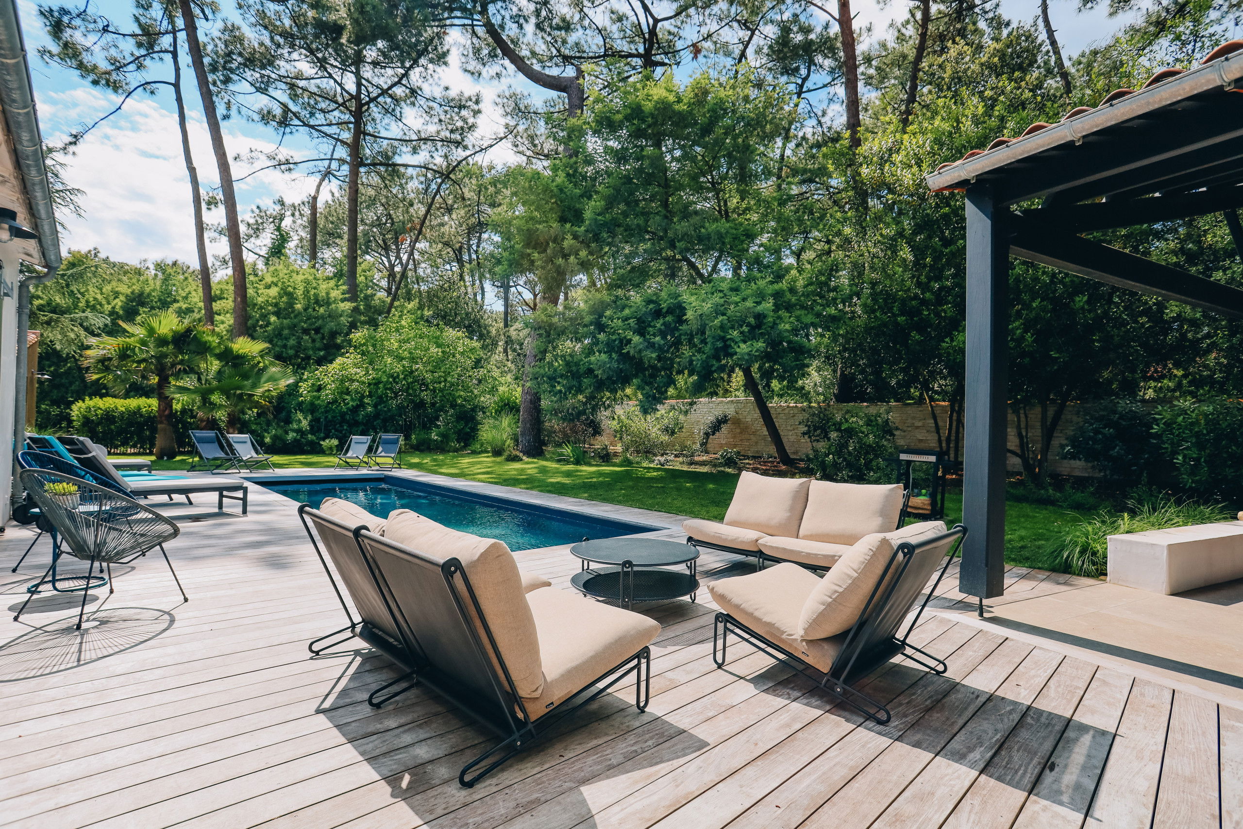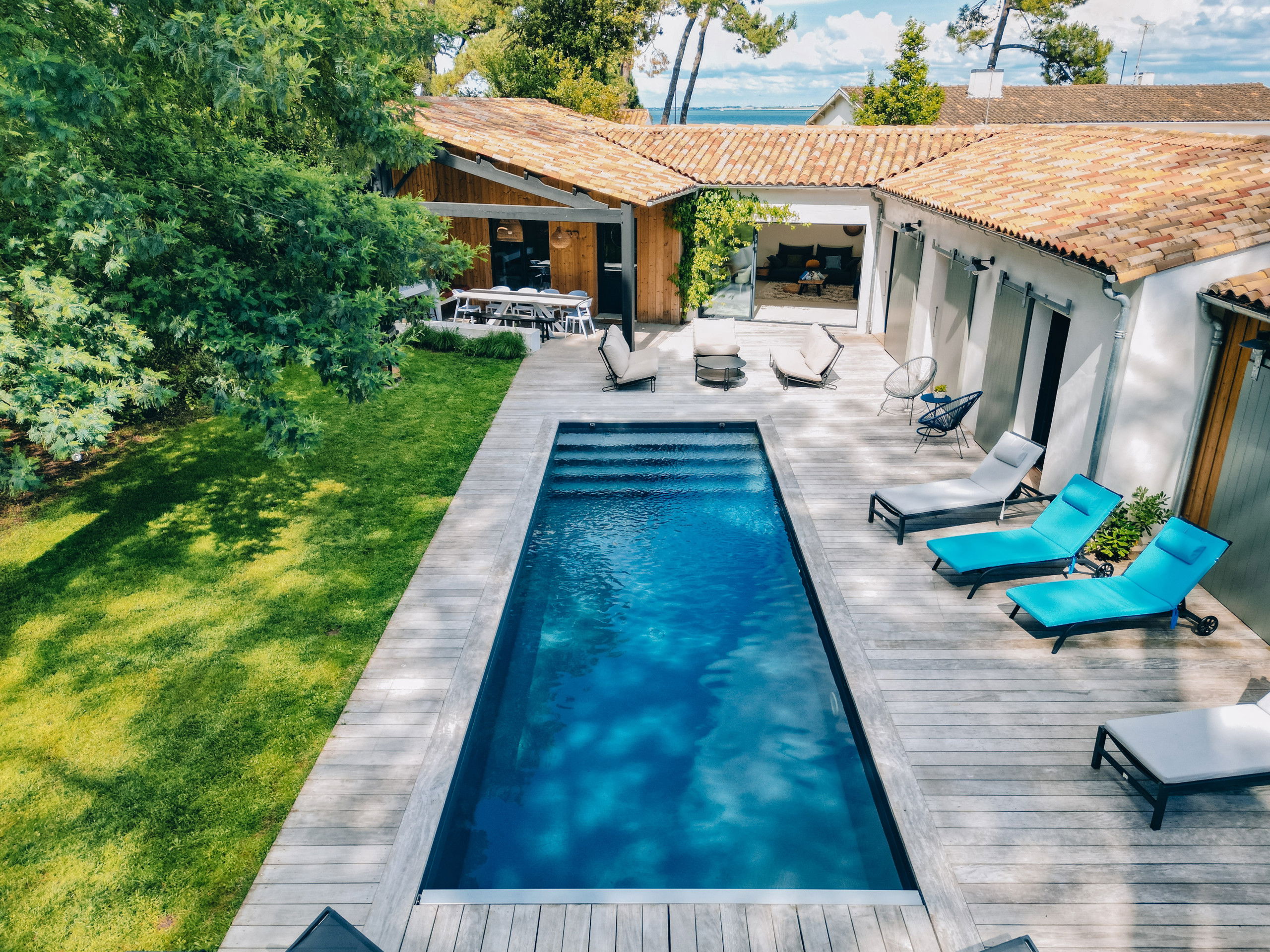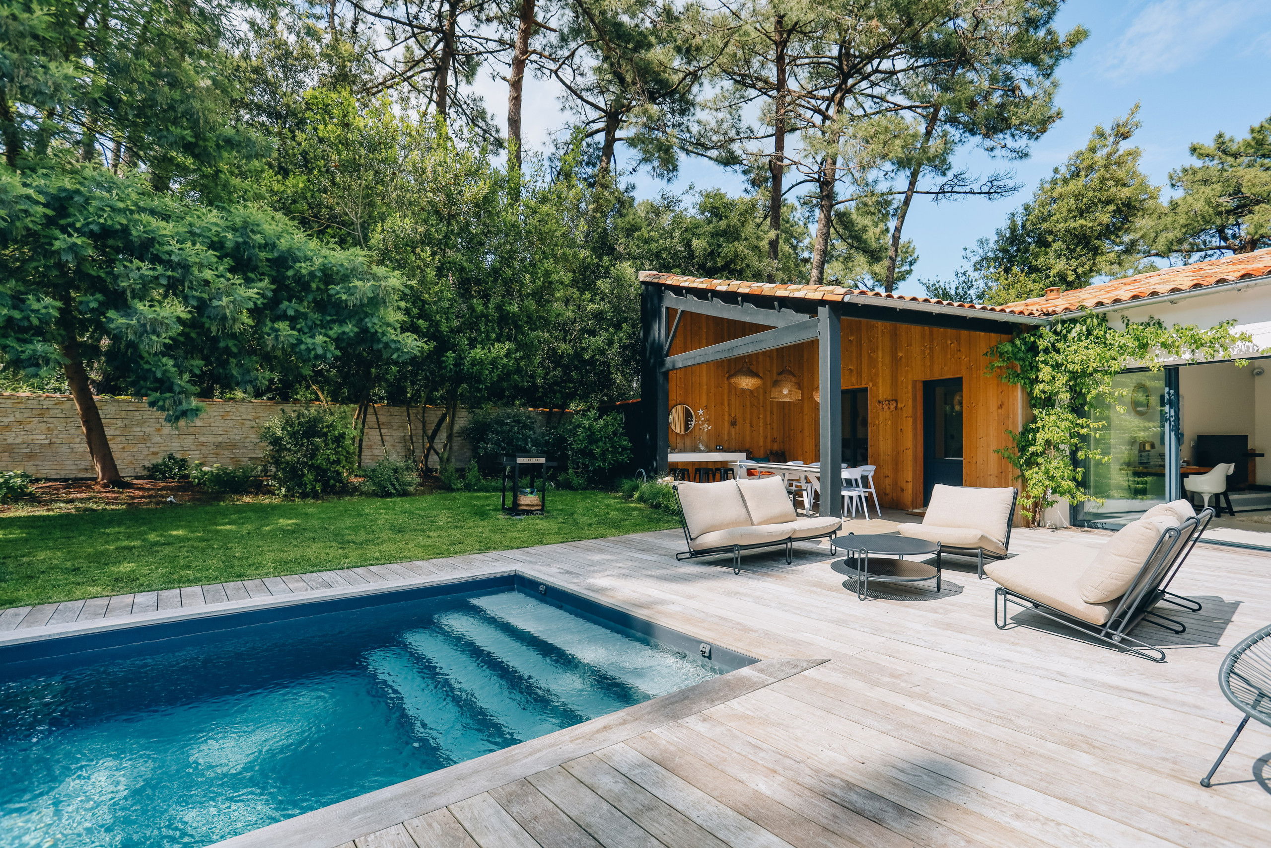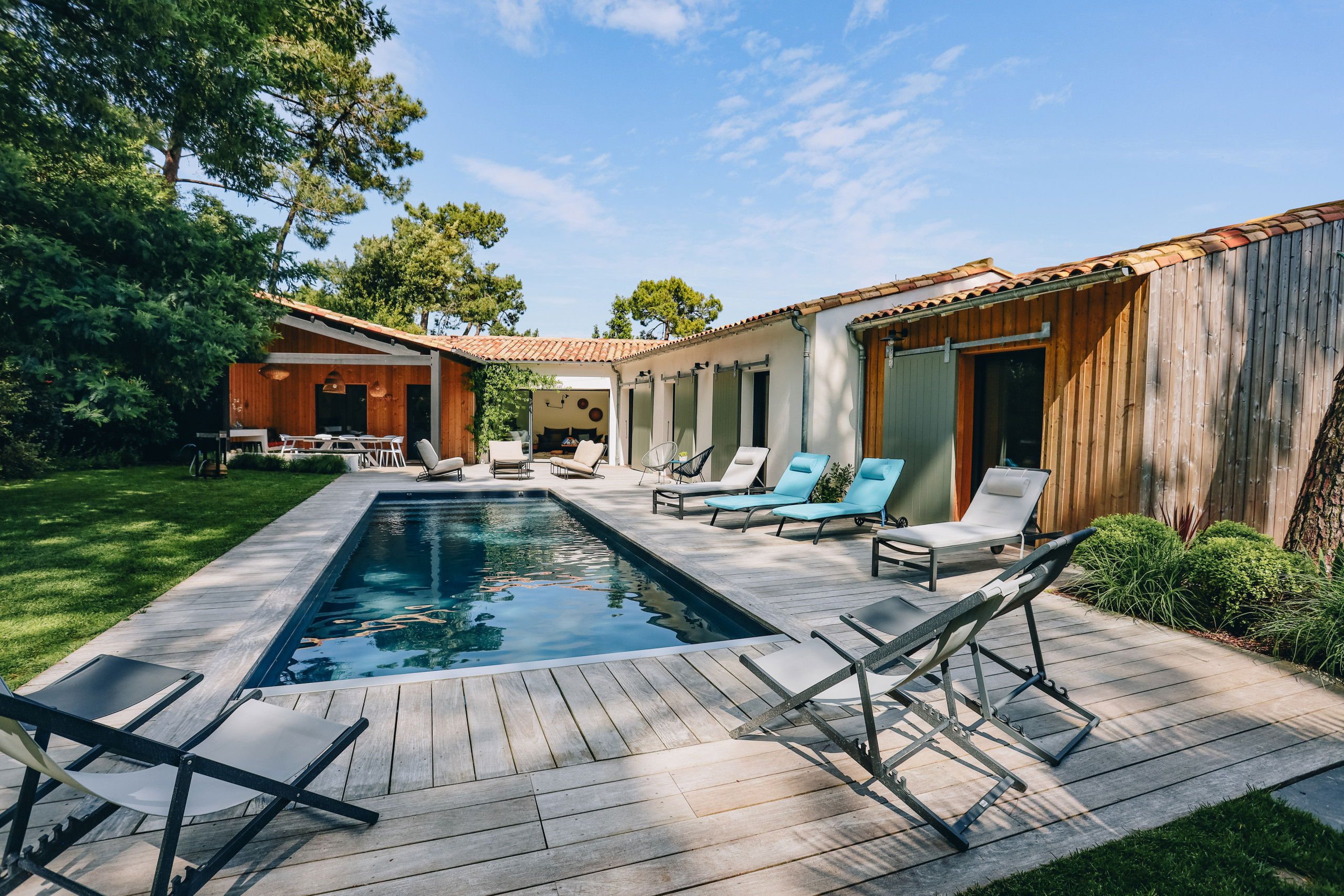Villa Kirribilli, located on the Ile de Ré, in the fishing village of Rivedoux, will seduce you with its beautiful swimming pool, its large landscaped garden in the heart of the pine forest. An ideal place for your next vacation. You will without hesitation enjoy the large landscaped garden, the heated swimming pool and its quality outdoor and indoor spaces.