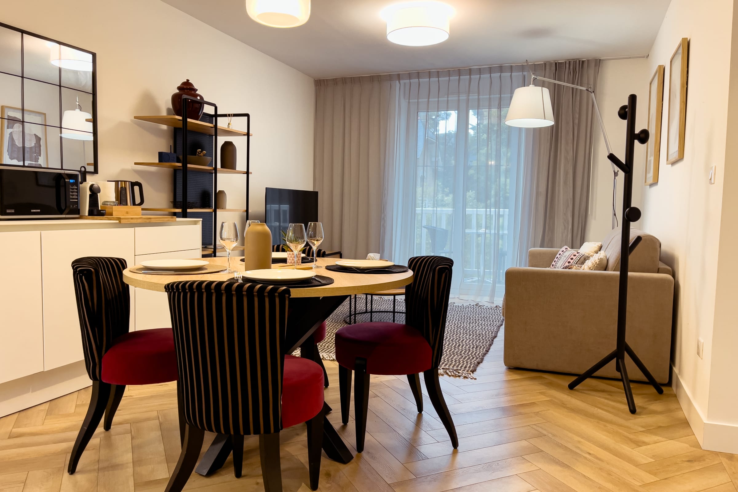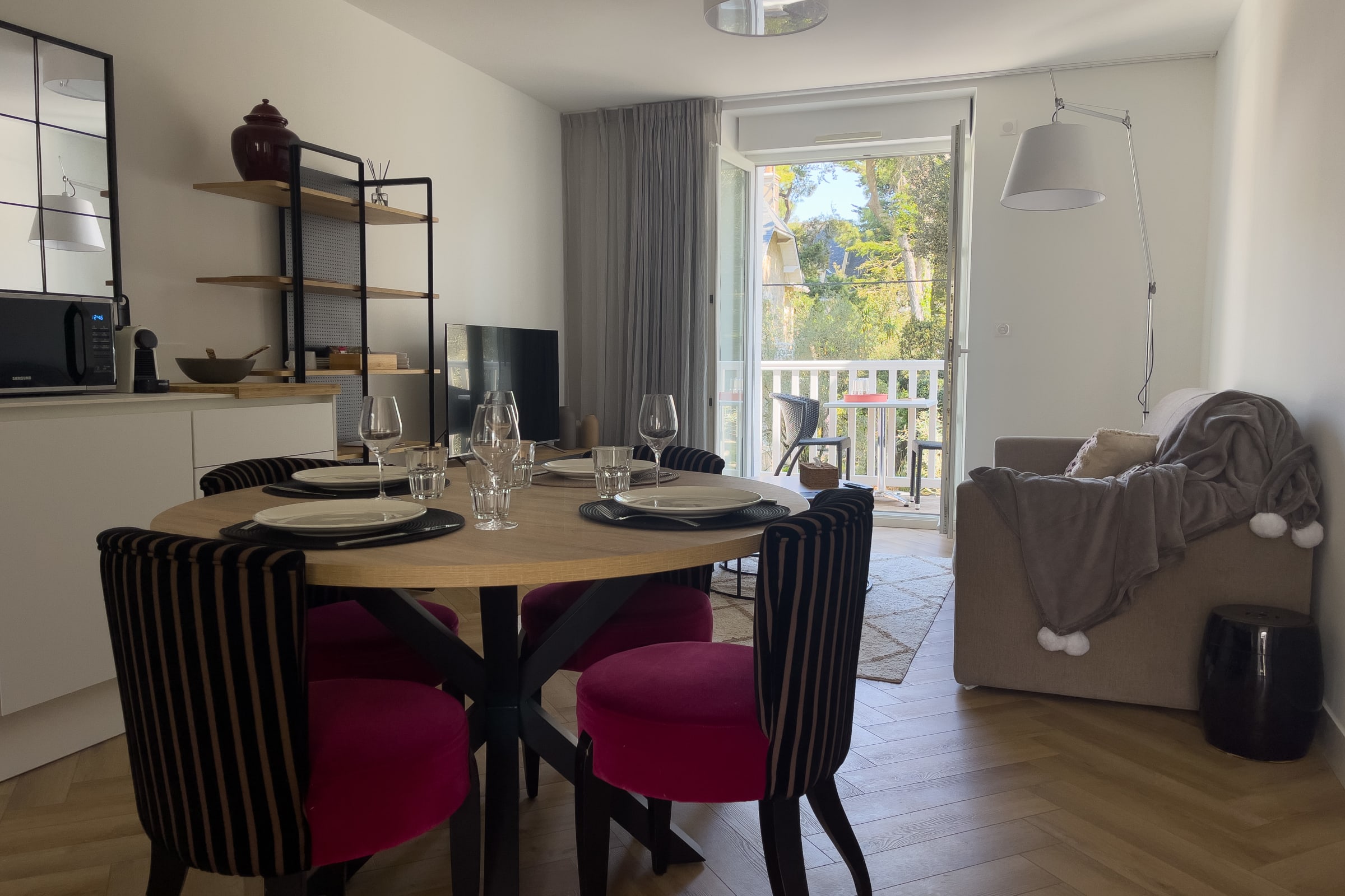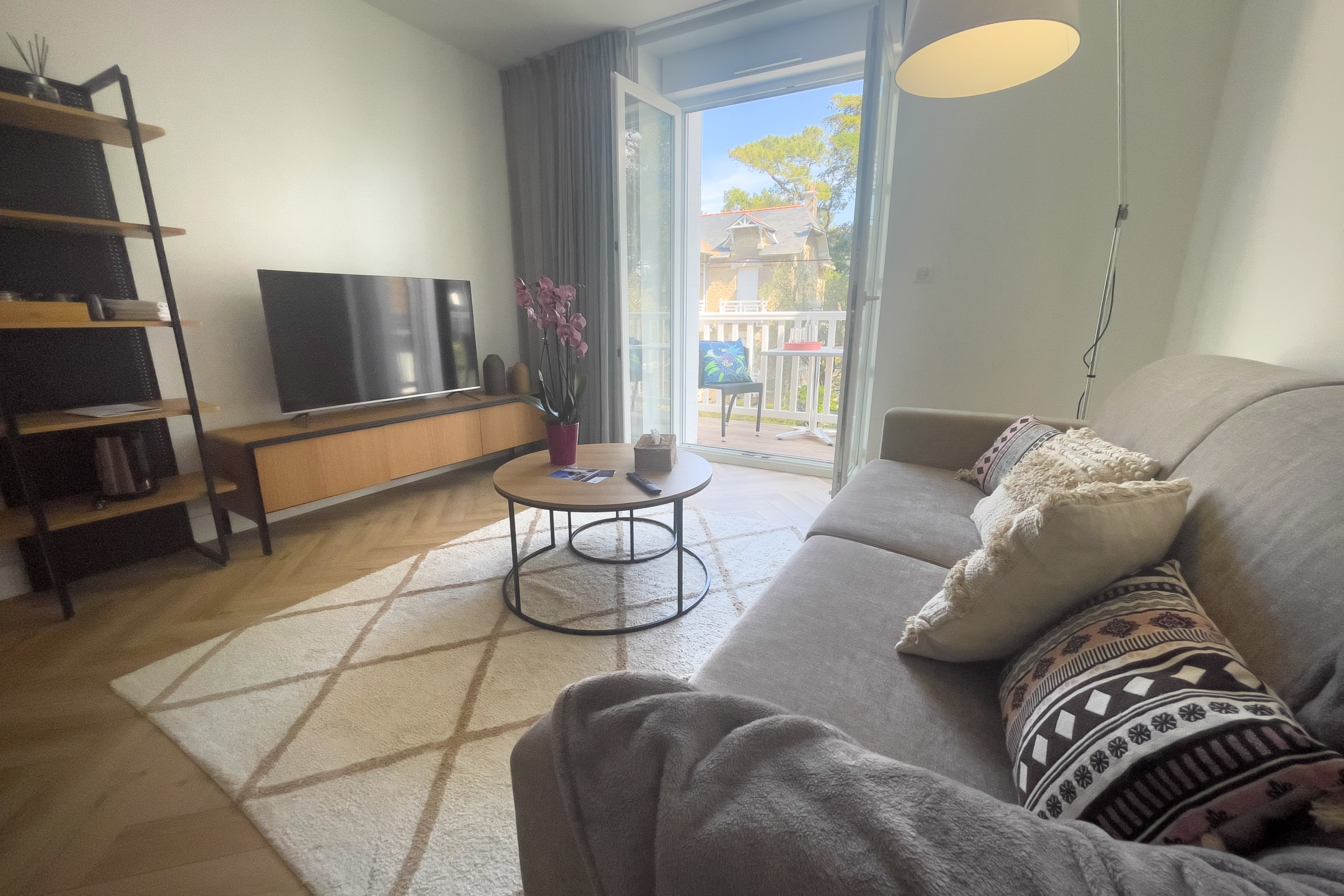 Flat on the floor of a century-old building. This flat has a view on the pine trees and the sea. It consists of two bedrooms with a view of the pine trees and the typical seaside villas of Pornichet, a bathroom with shower and private toilet. The living room can accommodate 2 additional beds (sofa bed). It is equipped with a complete kitchen, oven, microwave, dishwasher, fridge, freezer, cooking and serving equipment for 5 people. This accommodation is equipped with a washing machine. All rooms are air-conditioned and wifi is available throughout the flat. Access is via an outside staircase and offers an outside terrace common to this villa. A parking space is available as well as access to the spa-hammam, subject to availability, on request and with an extra charge.