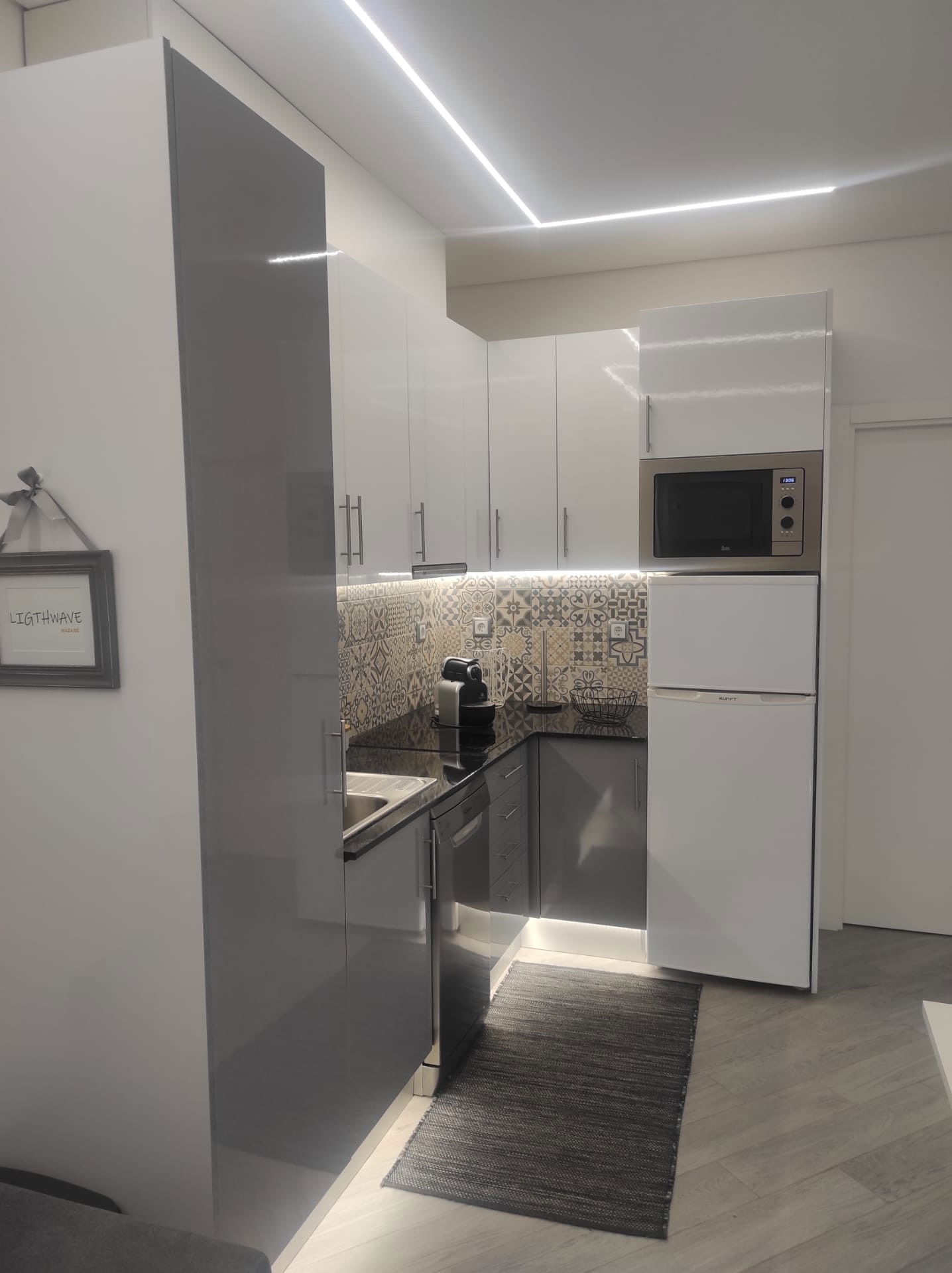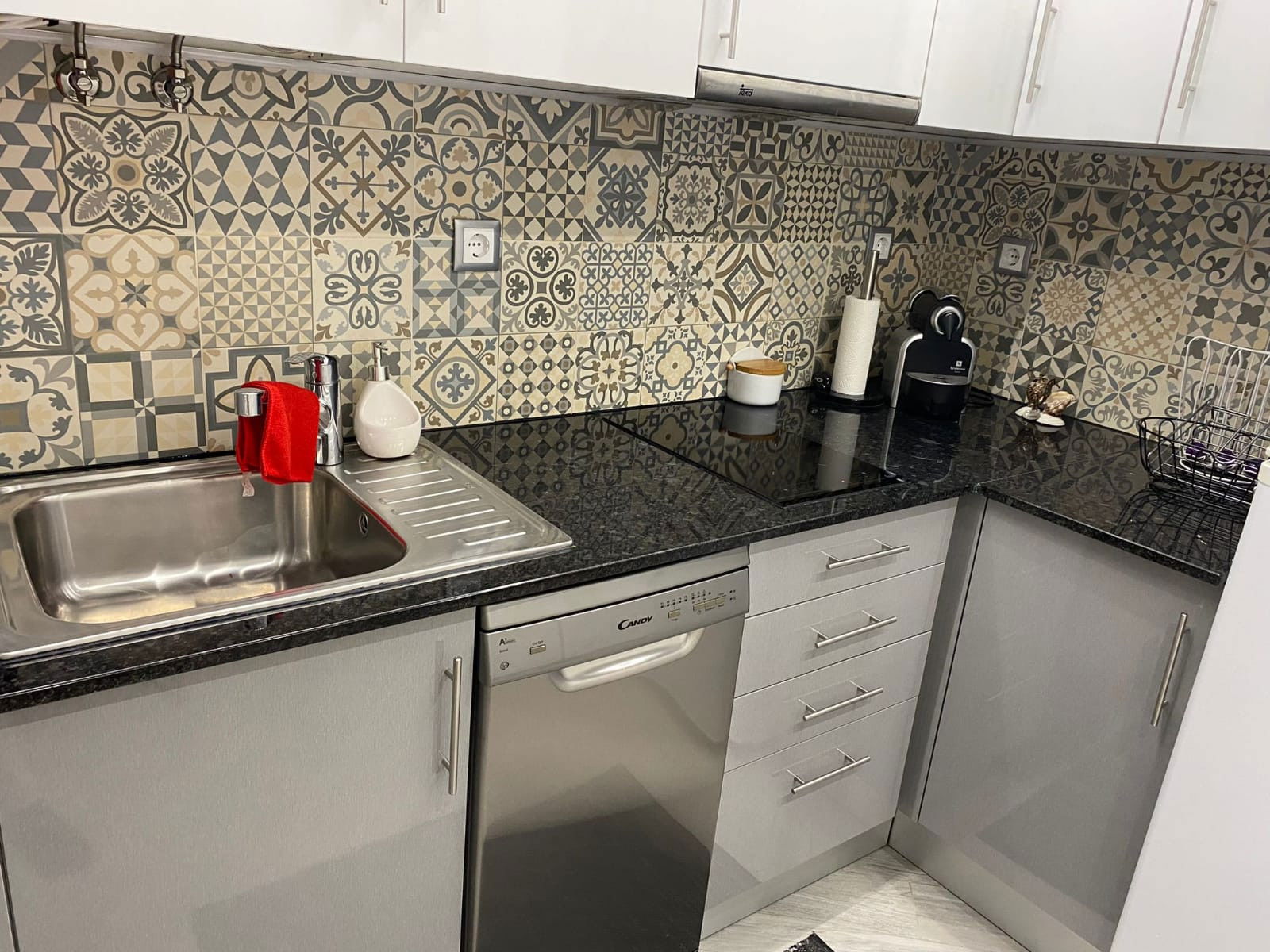 The open plan kitchen, of hotplate of glass ceramics, is equipped with refrigerator, microwave, freezer, dishwasher, dishes/cutlery, kitchen utensils, coffee machine and toaster.