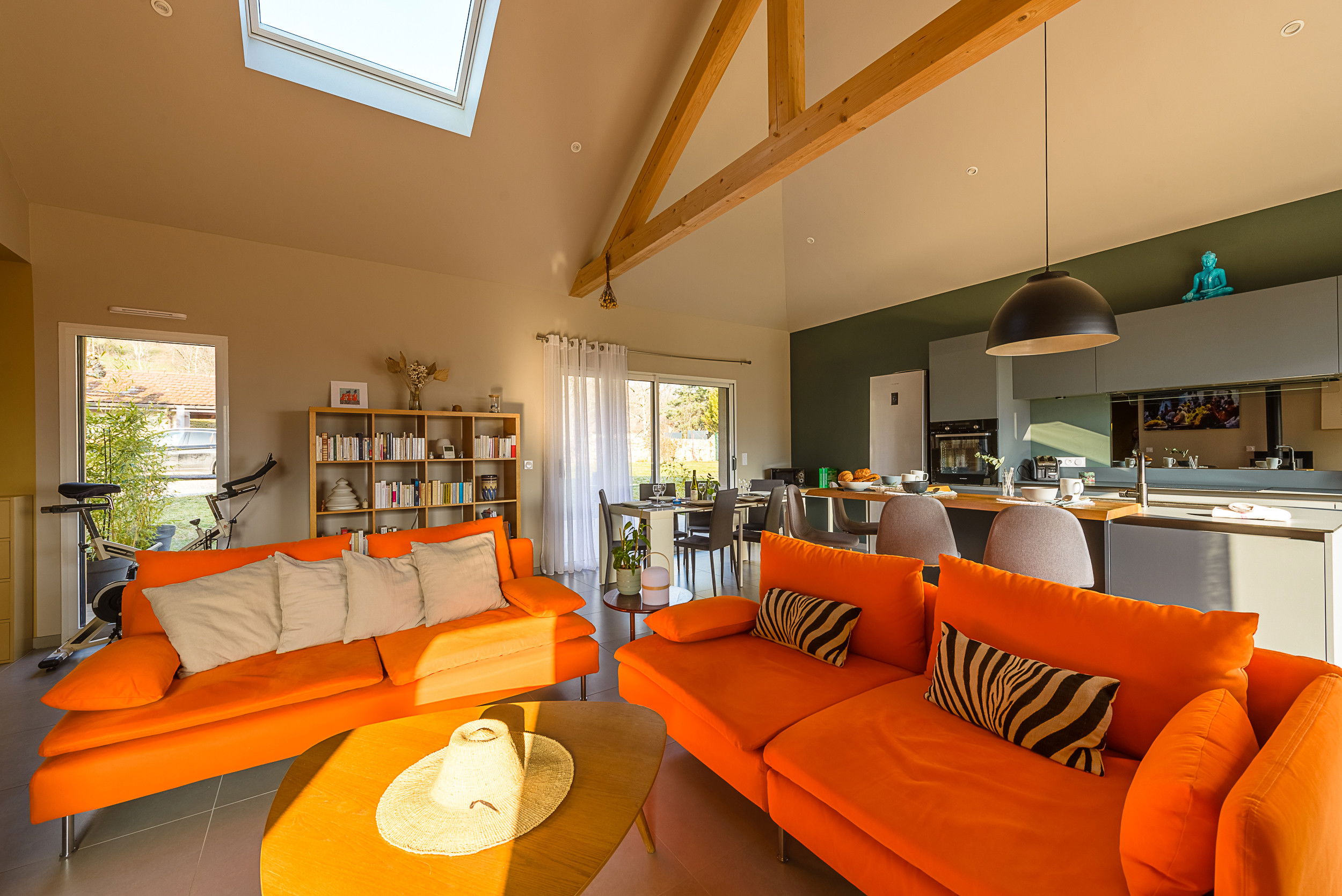 - Kitchen open to the living room, fully equipped (oven, microwave, teapot, kettle, toaster, induction cooker, food processor, refrigerator, freezer...) including a central island with sink and four high chairs