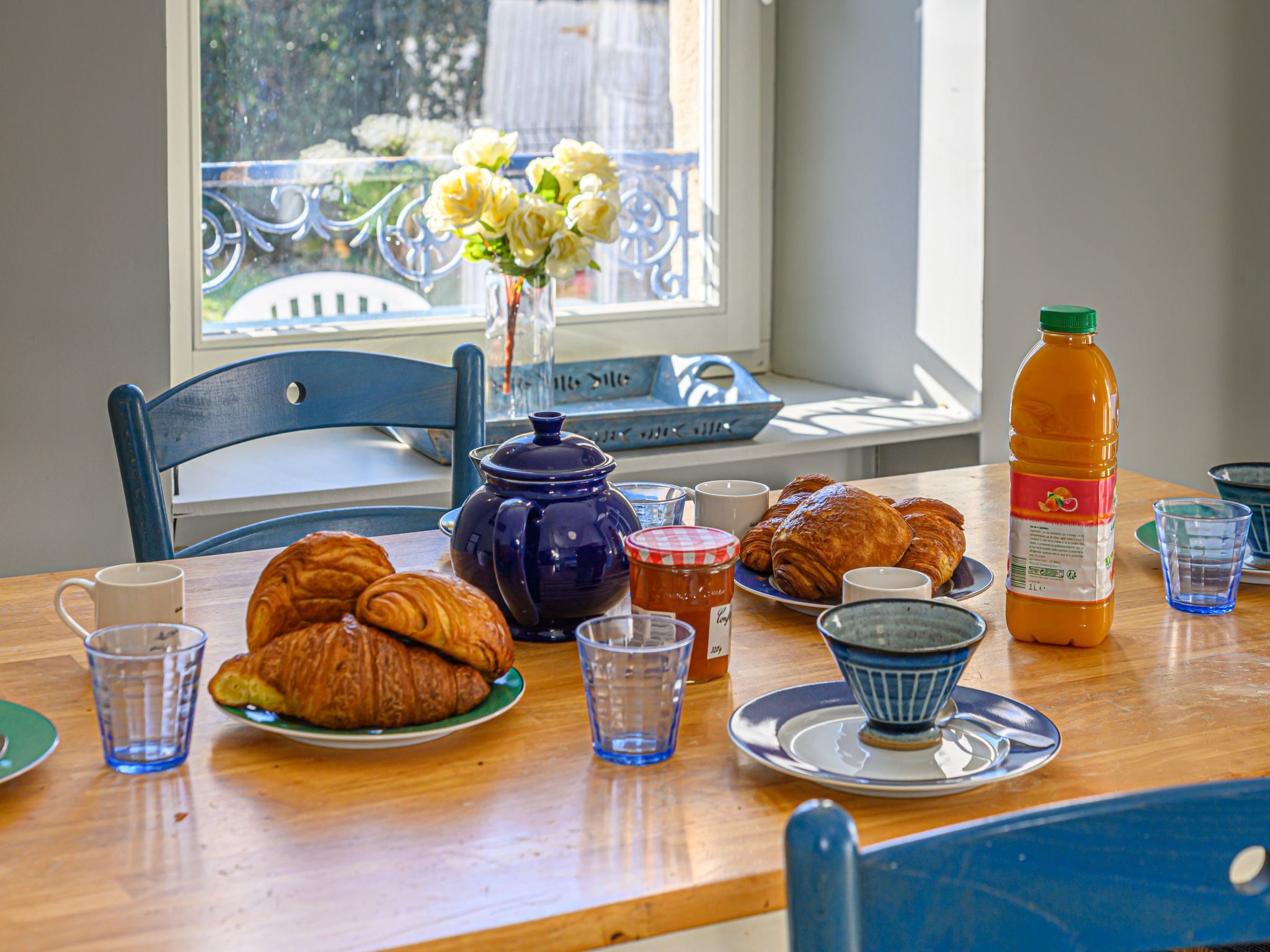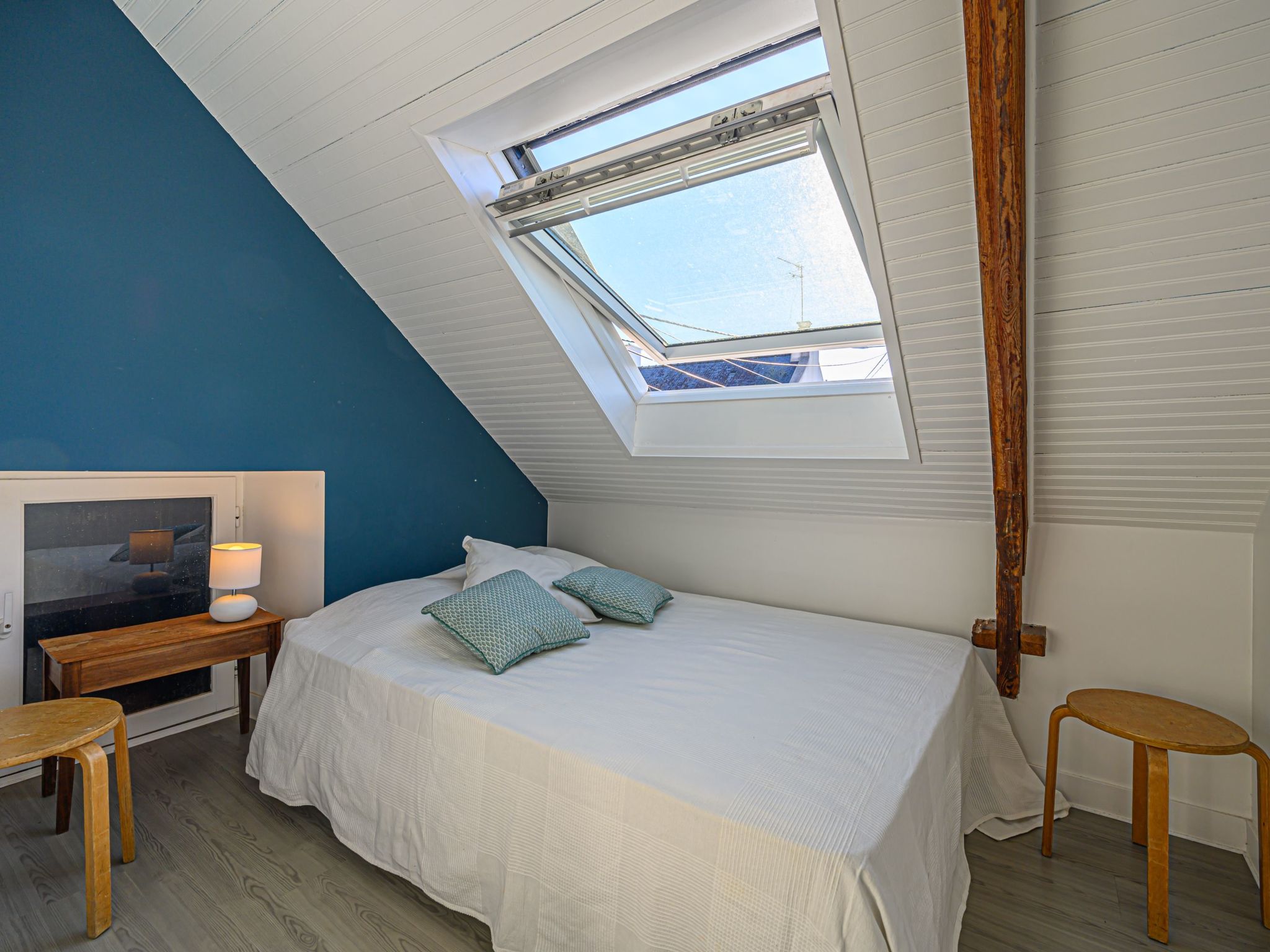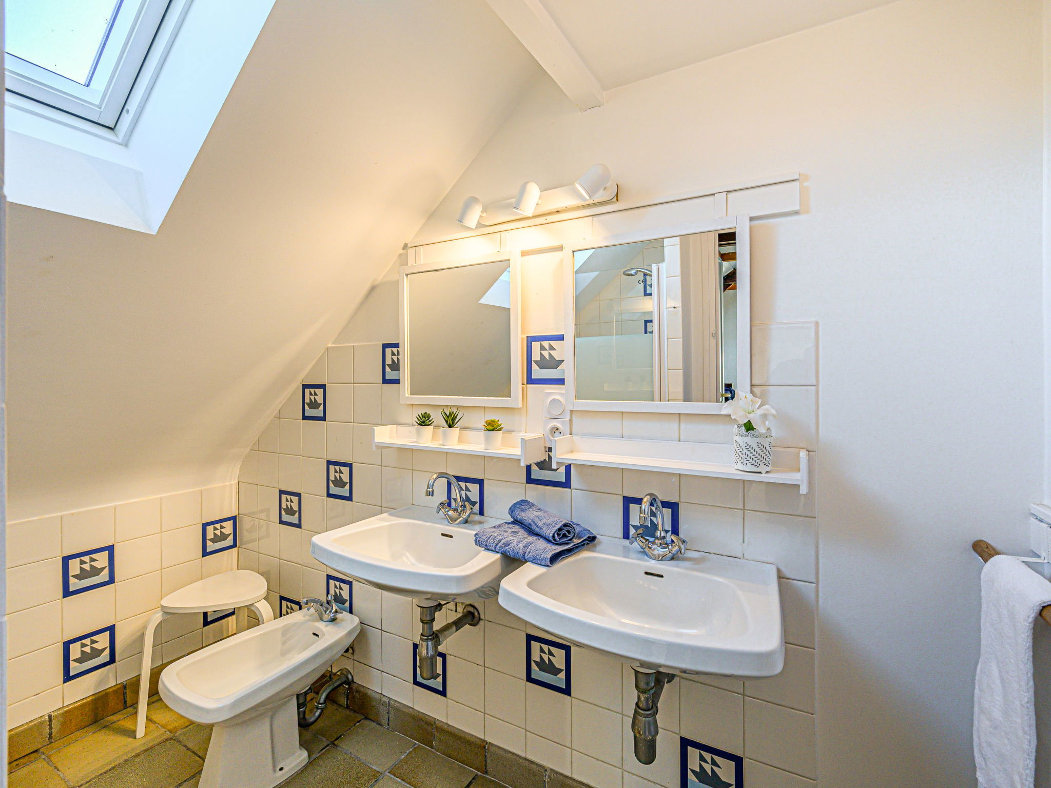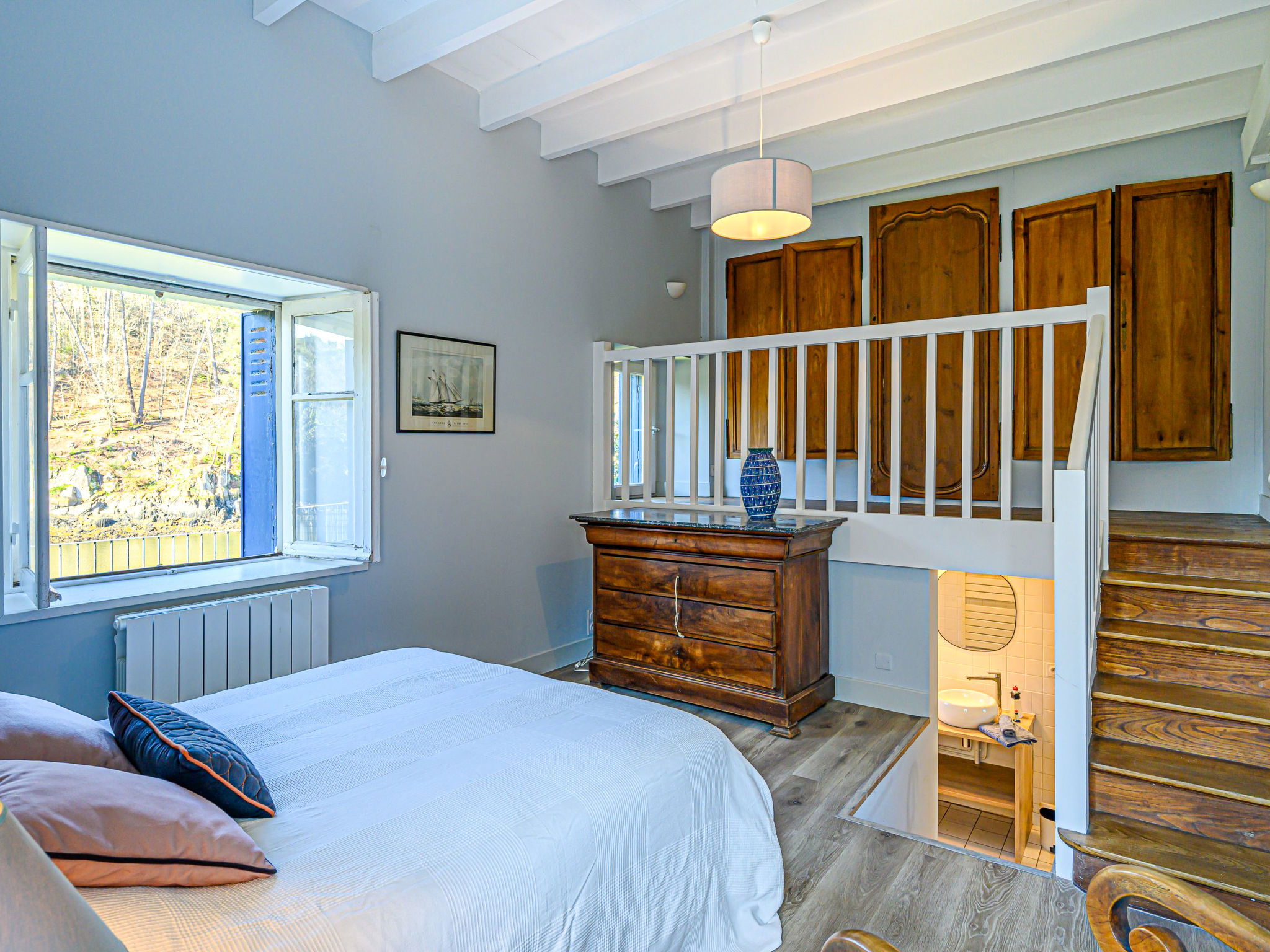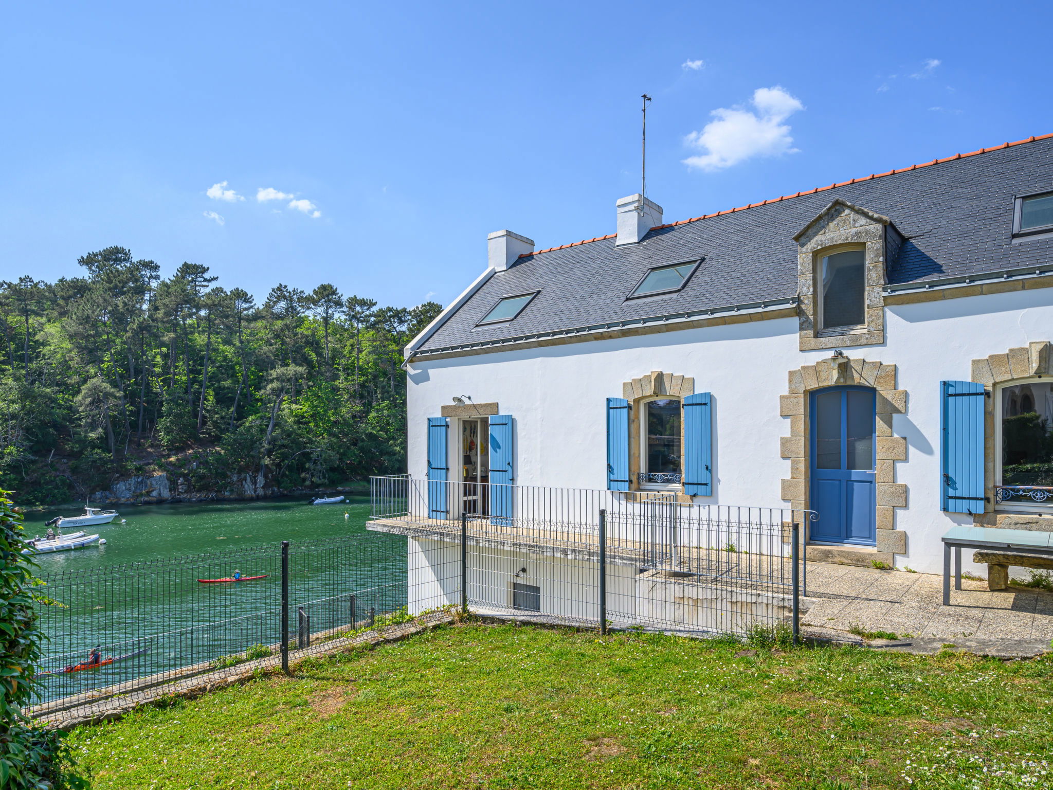 "Glann Aven", 6-room house 125 m2 on 3 levels, south facing position. Beautiful furnishings: entrance hall. Large living/dining room with open-hearth fireplace (only for decoration), dining table and TV (flat screen). Kitchen (oven, dishwasher, 4 ceramic glass hob hotplates, toaster, kettle, microwave, electric coffee machine) with small dining table. On the lower ground floor: 1 room with 1 french bed (140 cm, length 190 cm). Bathroom, sep. WC, double hand-basin. Electric heating. Upper floor: 3 rooms with sloping ceilings, each room with 1 french bed (140 cm, length 190 cm). 1 room with 1 x 2 bunk beds (90 cm, length 190 cm). Bathroom, sep. WC, double hand-basin. Terrace furniture, deck chairs (3). Beautiful view of the river. Facilities: washing machine, iron, hair dryer. Internet (WiFi, free). Please note: non-smoking house. Smoke alarm. Offer by a private individual according to Art. 155, IV of CGI.