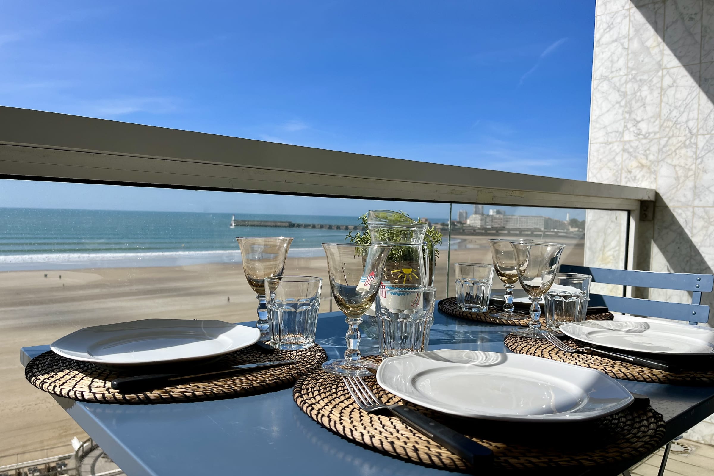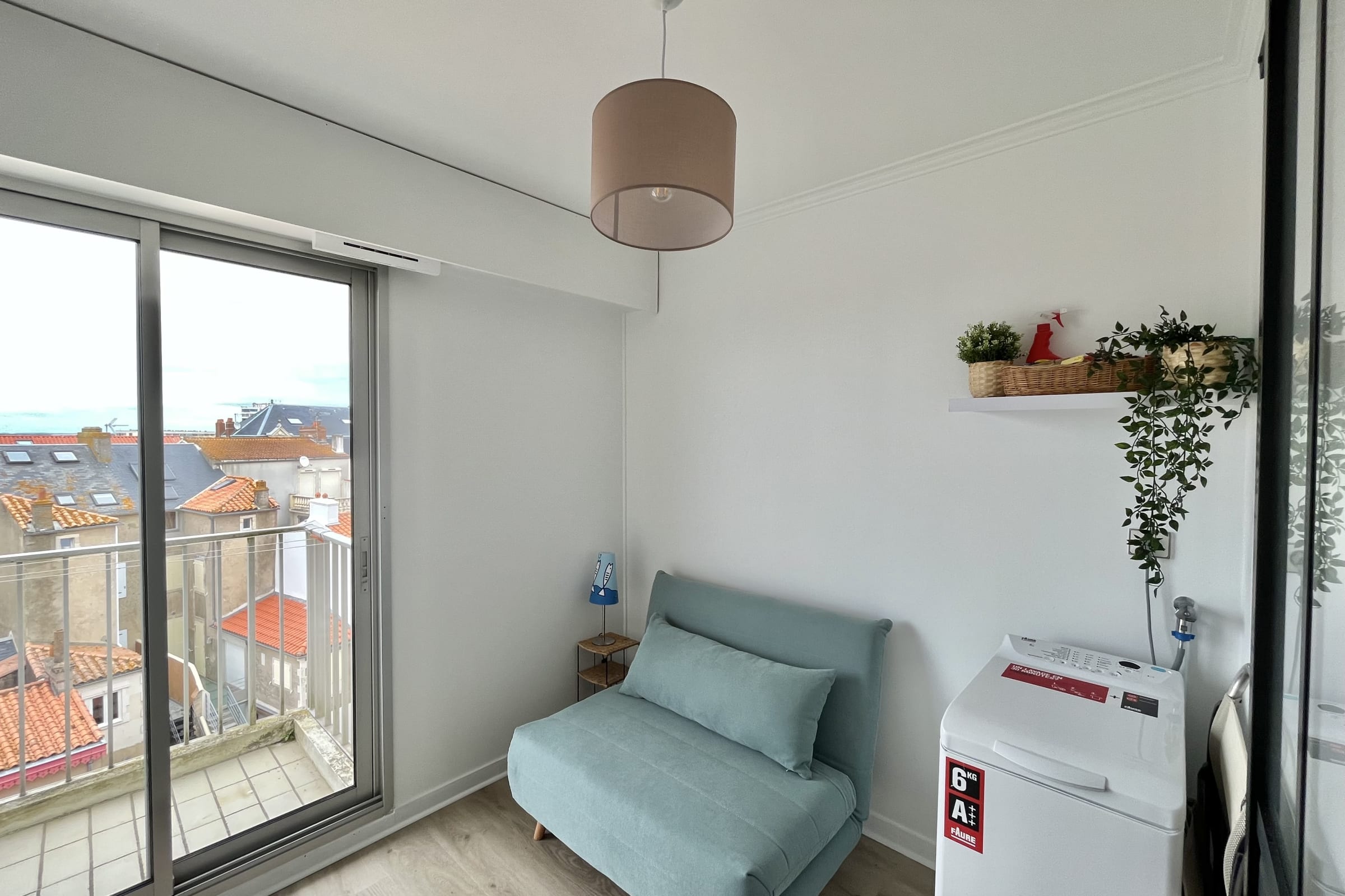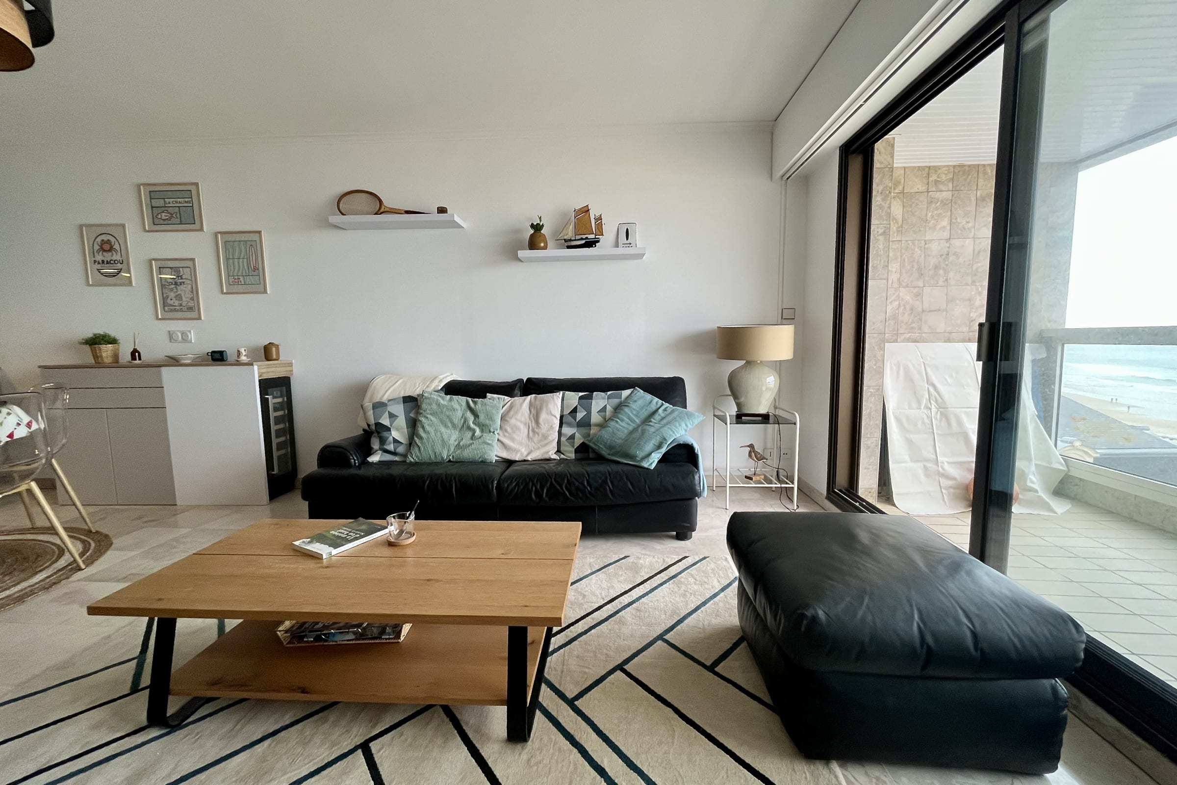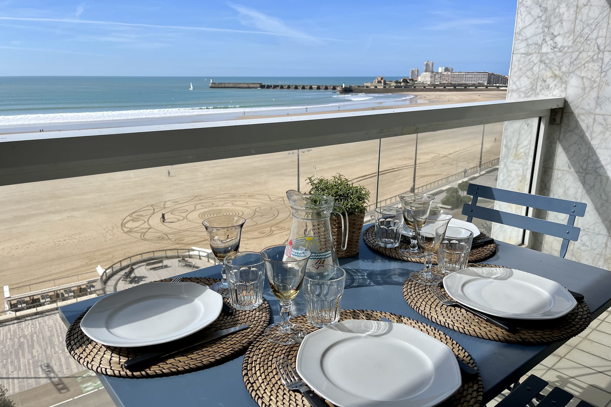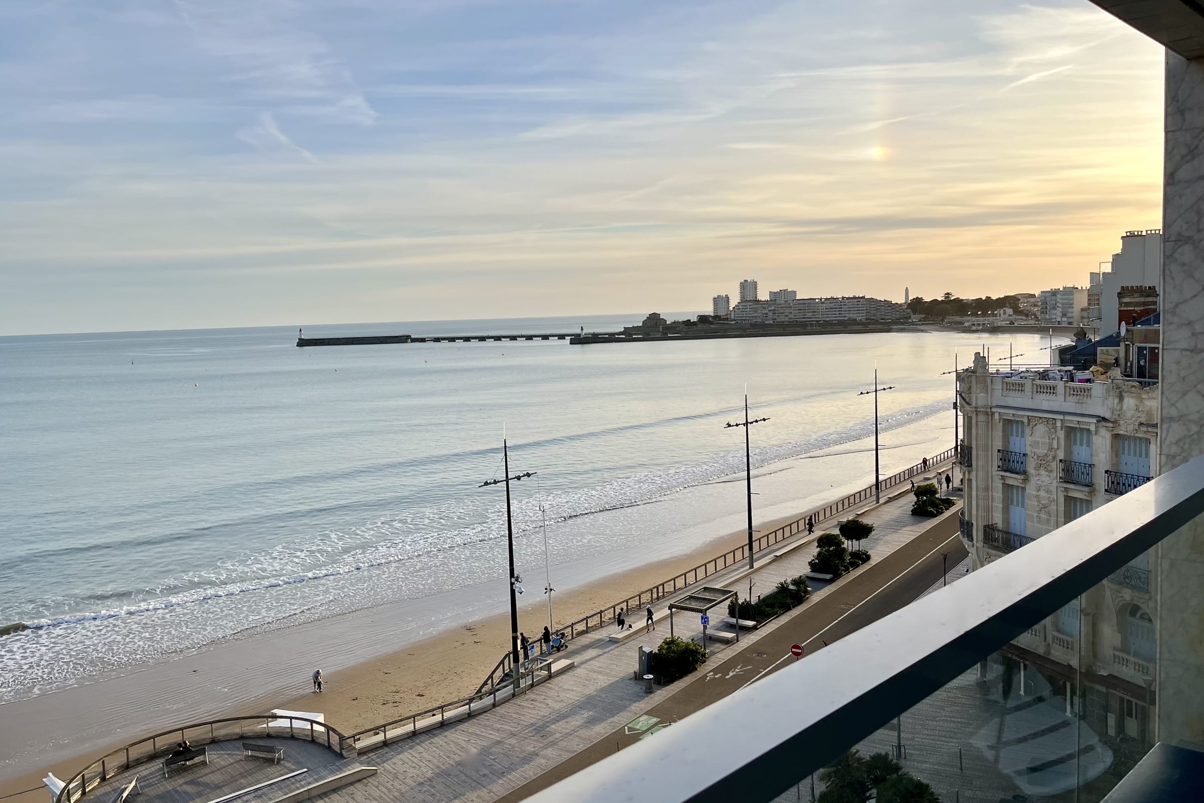 It has a hallway with storage serving the bright living room opening onto a balcony with a superb view of the bay of Les Sables d'Olonne.