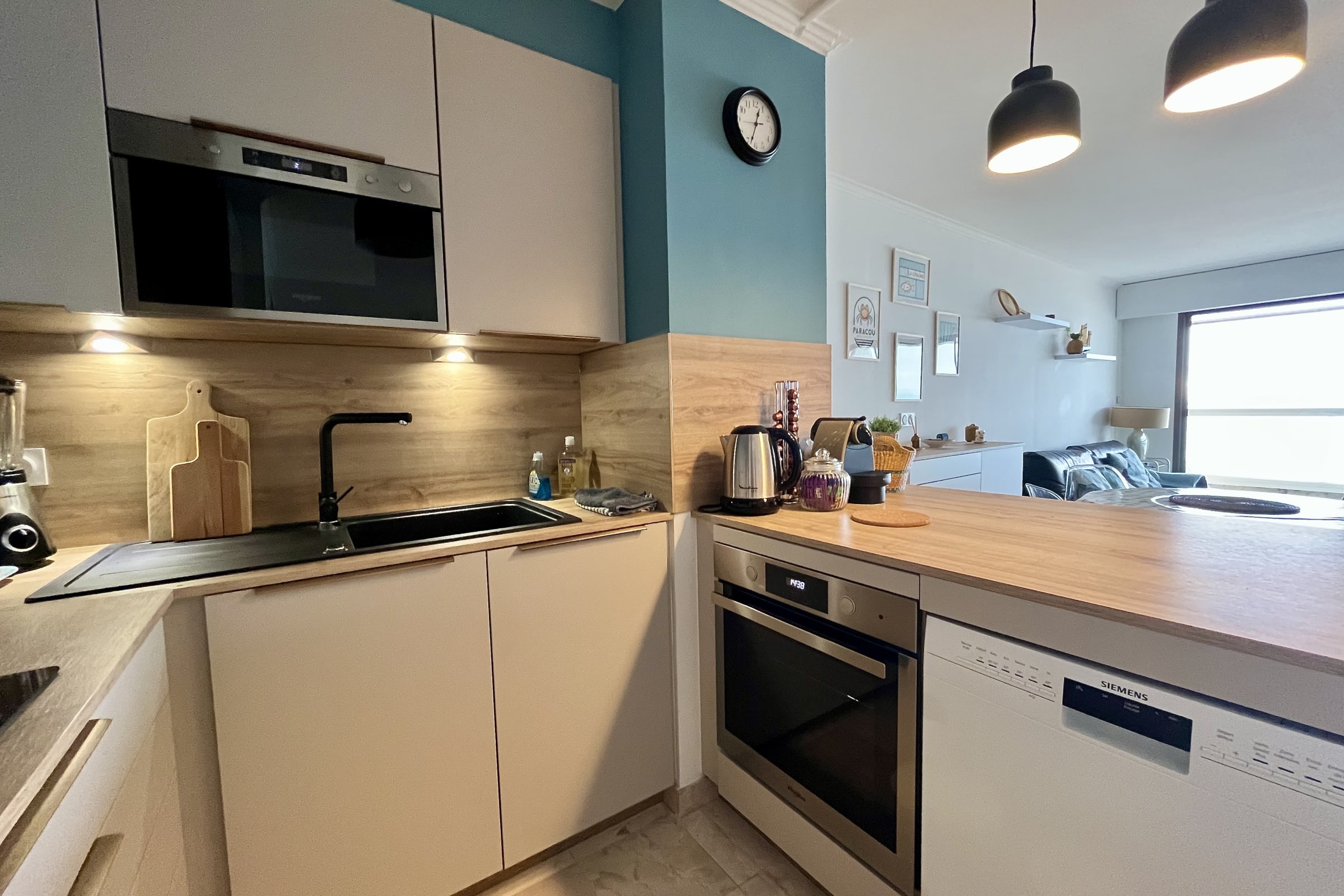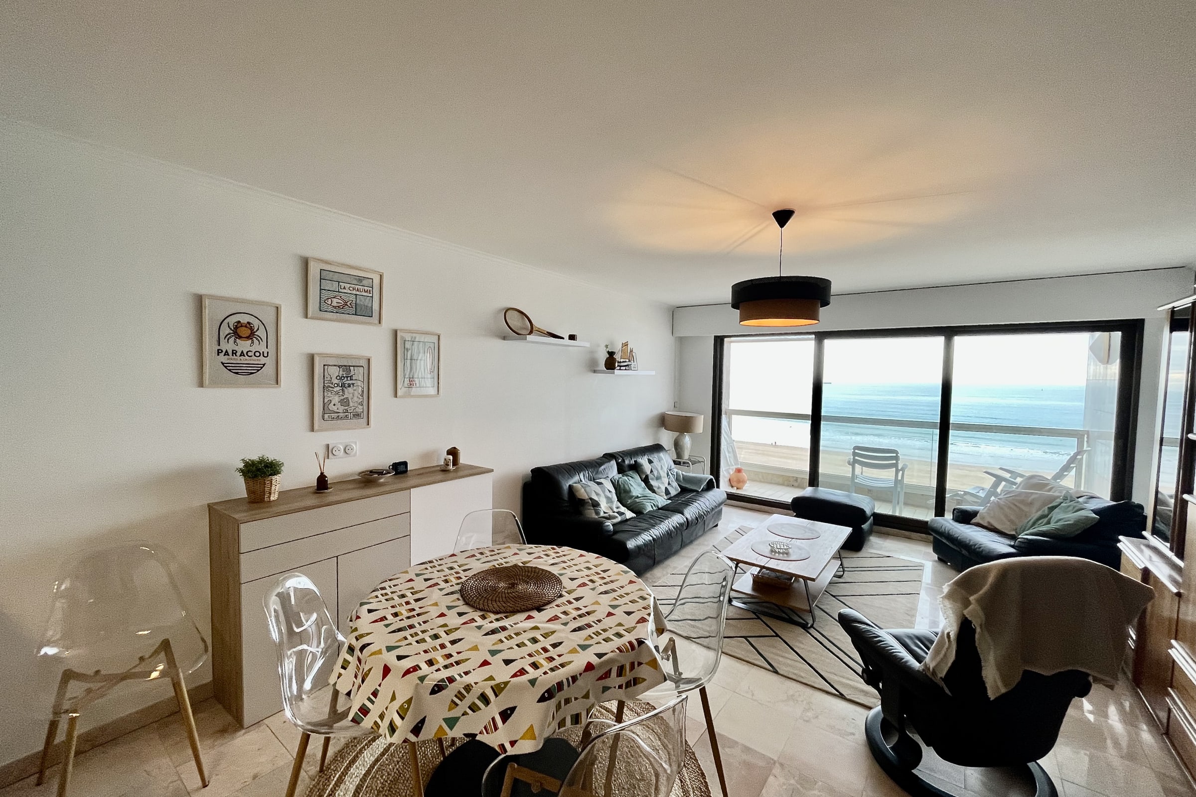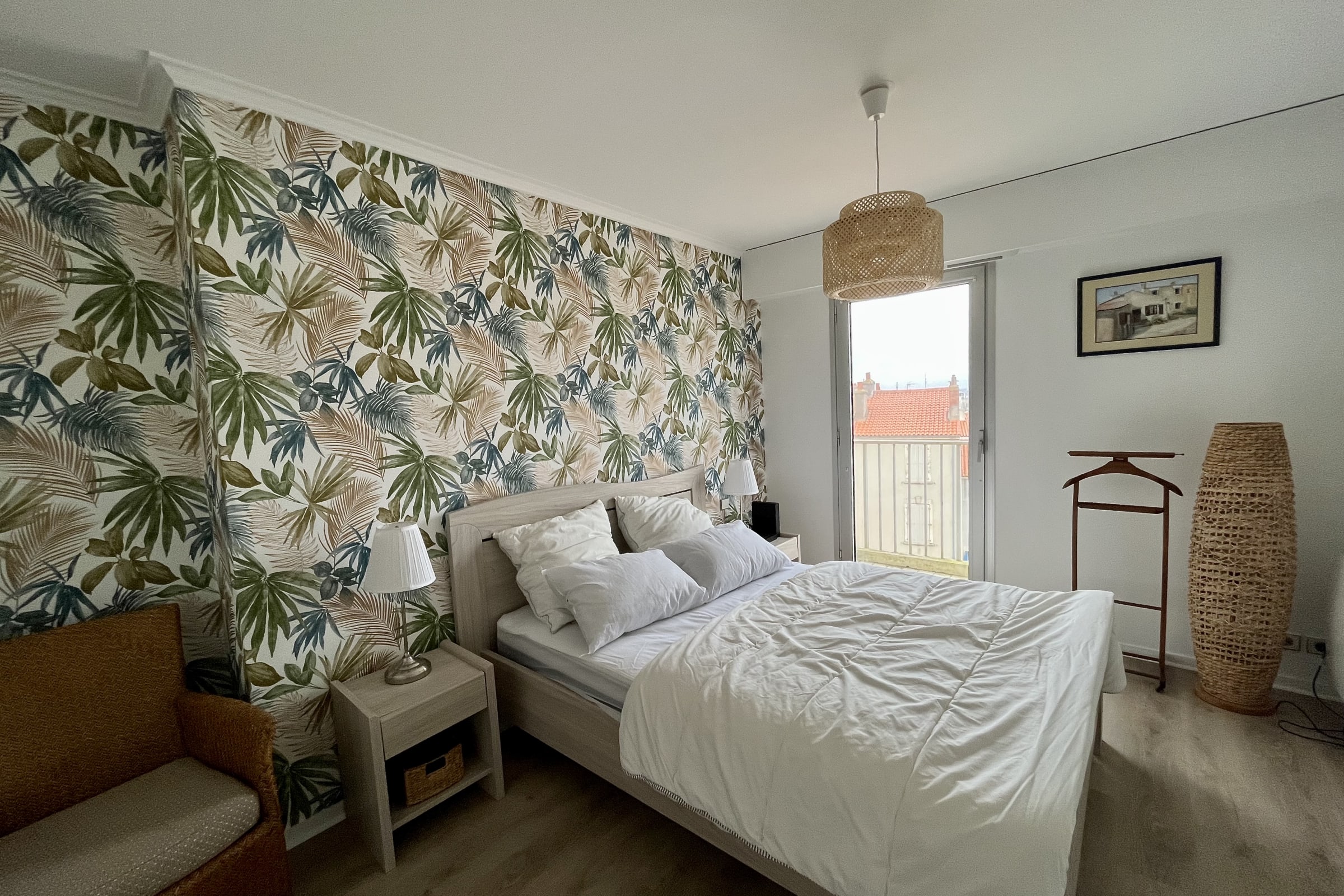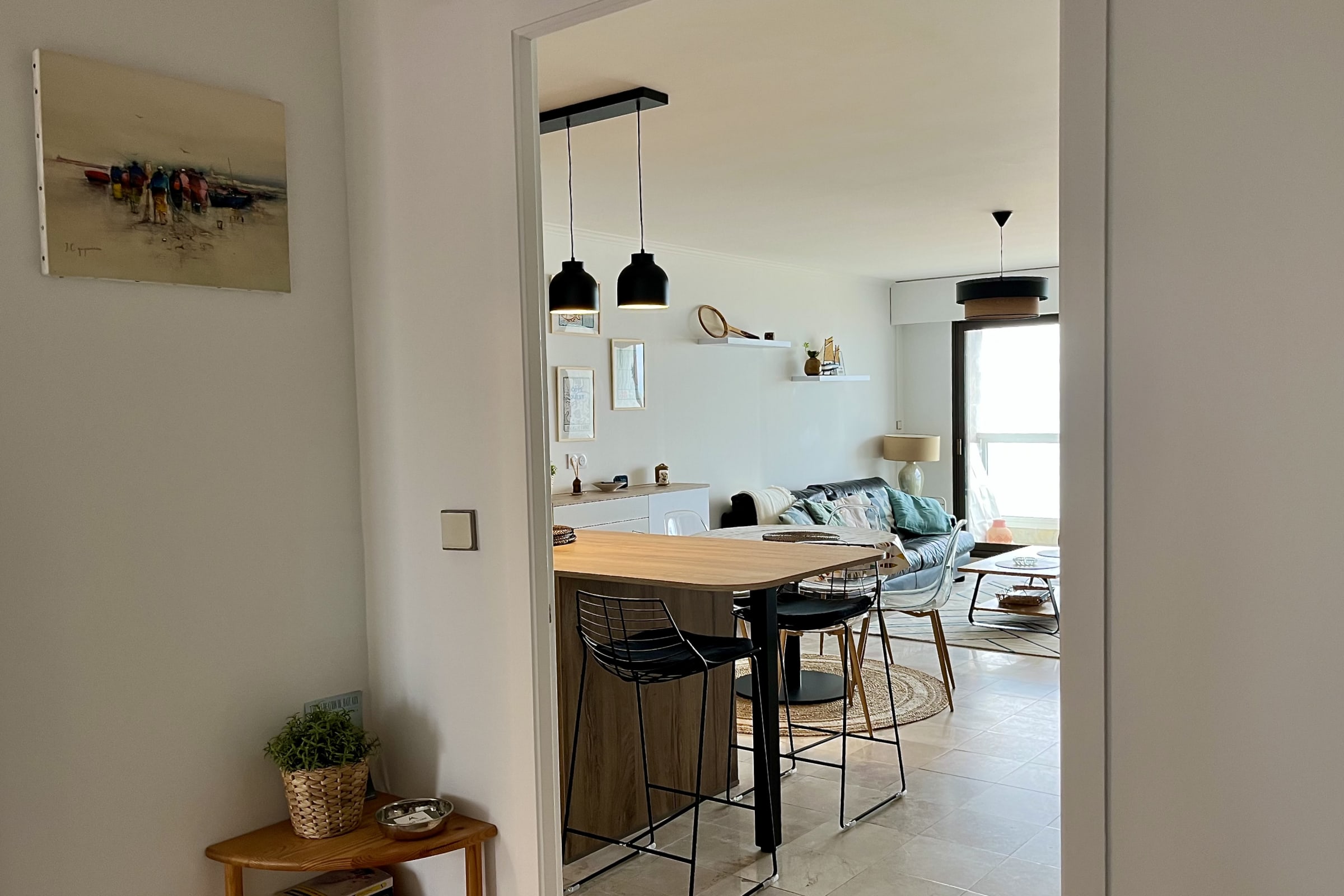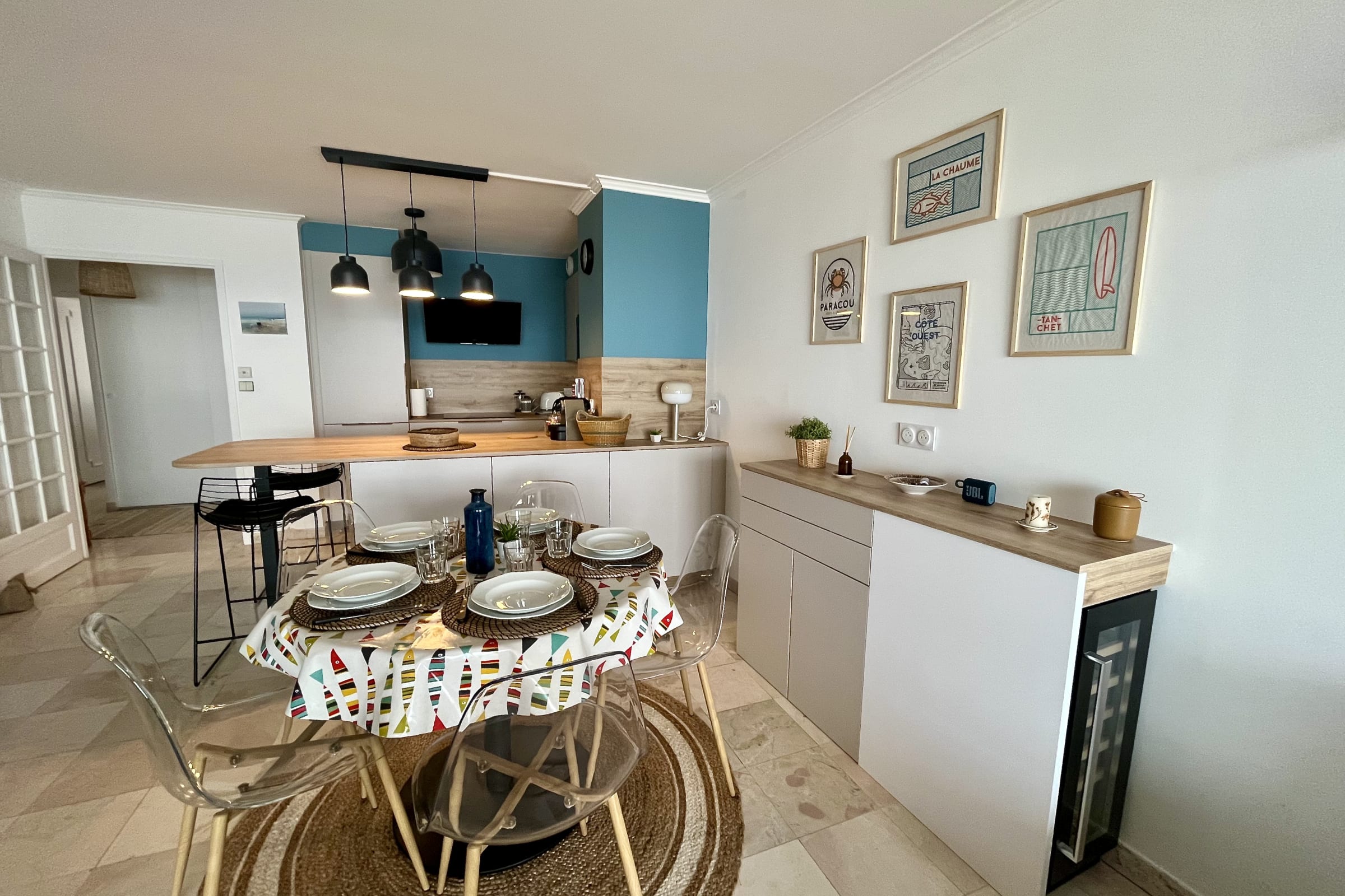 It has a hallway with storage serving the bright living room opening onto a balcony with a superb view of the bay of Les Sables d'Olonne.