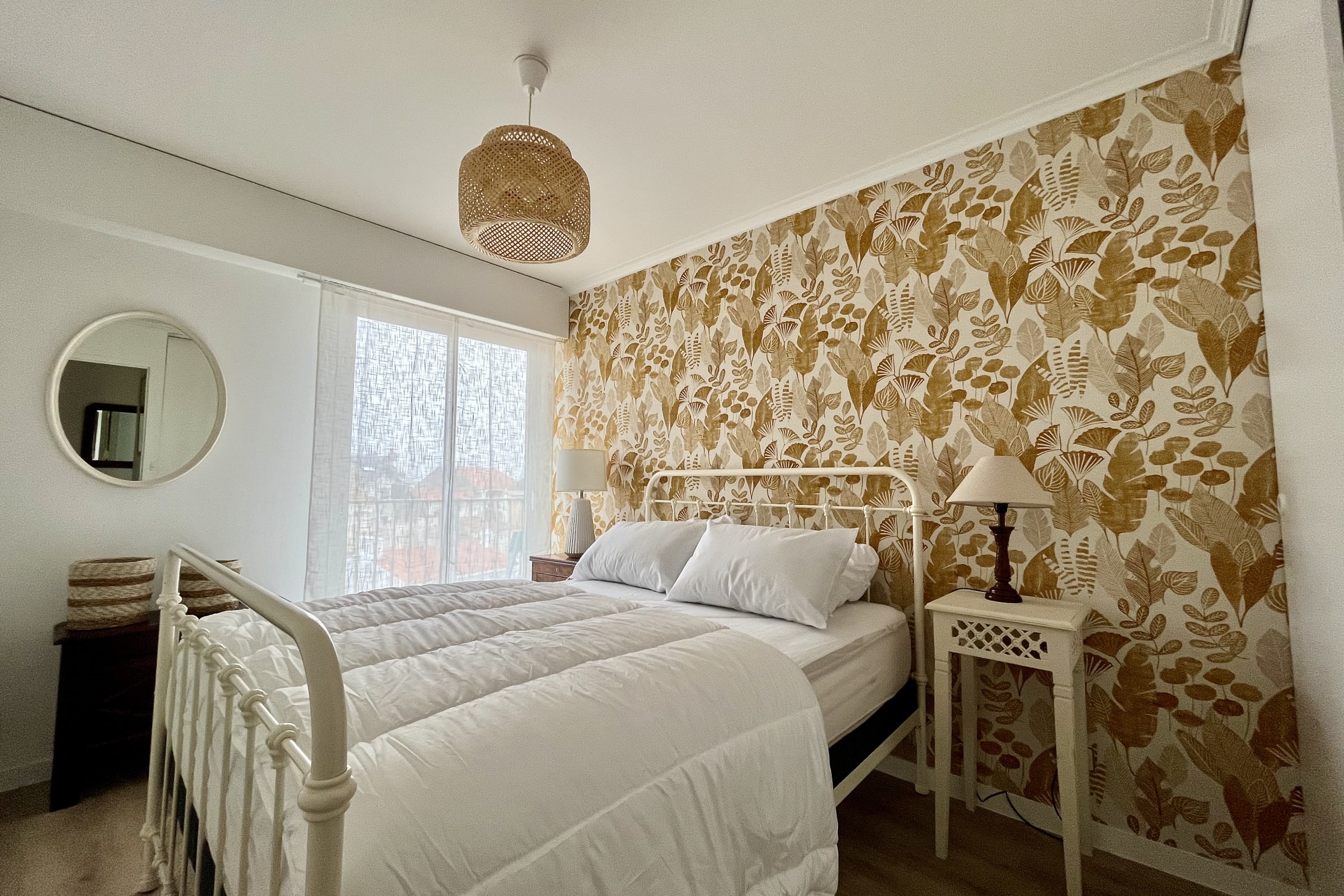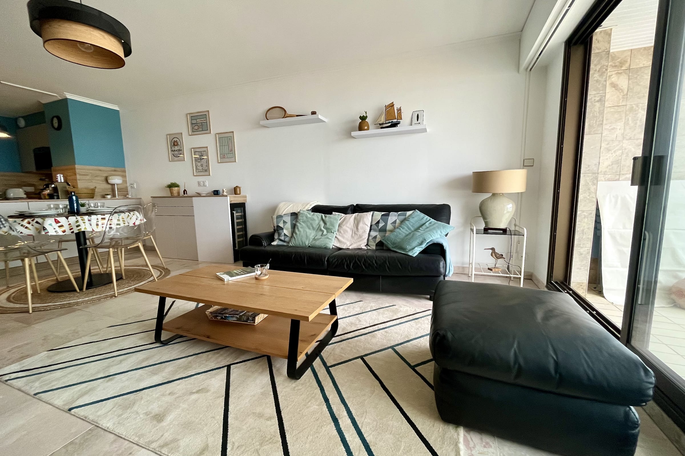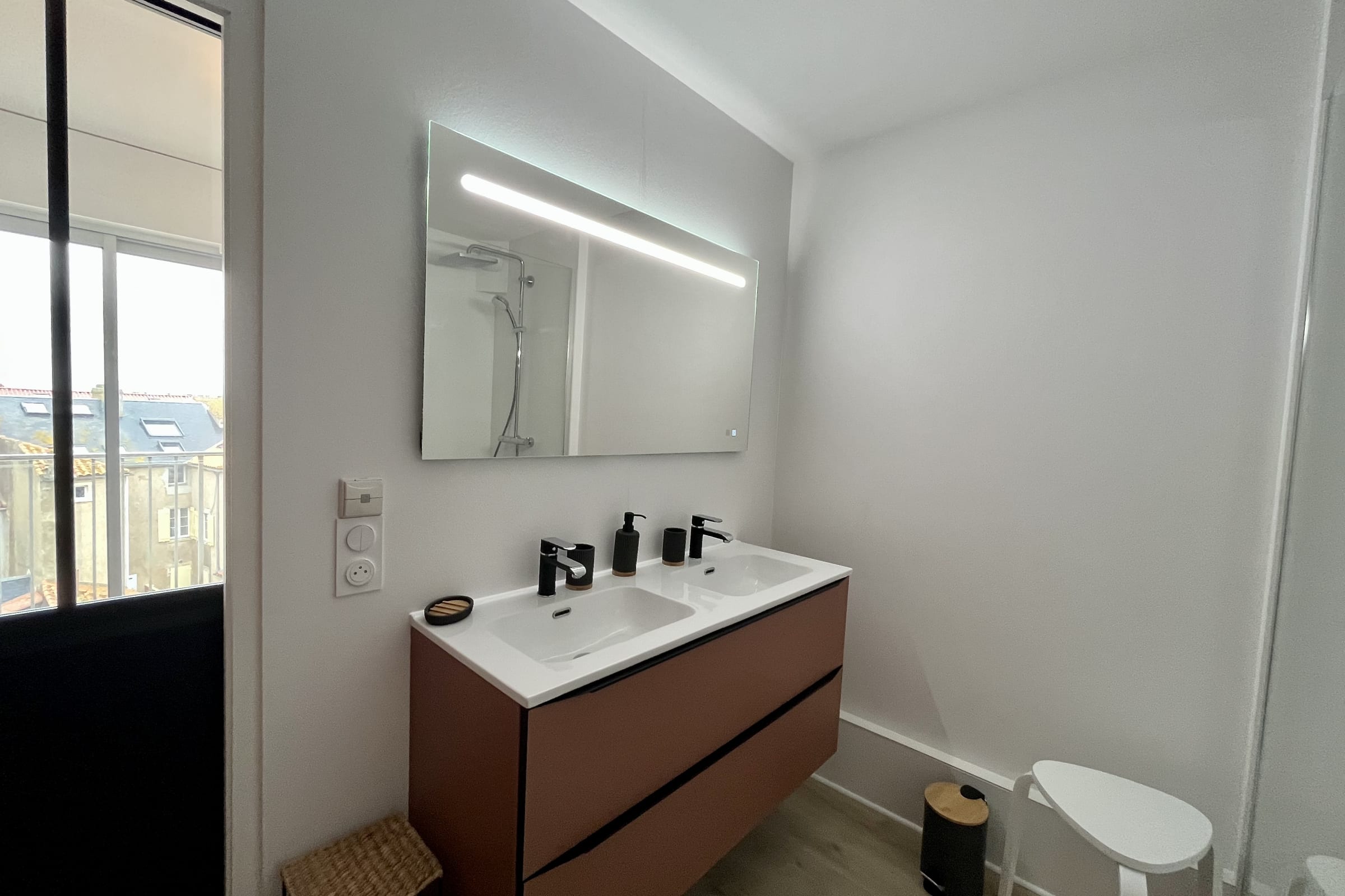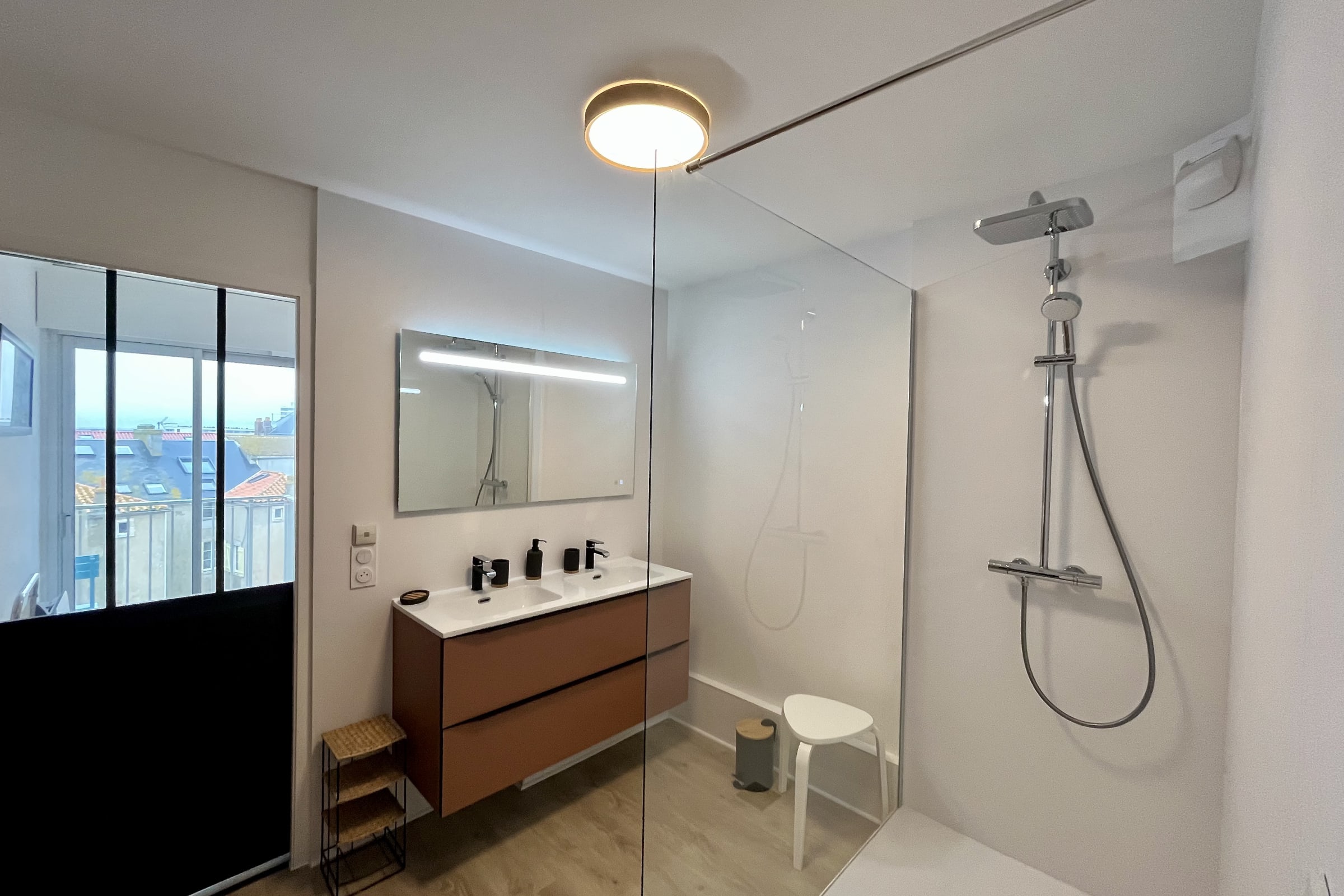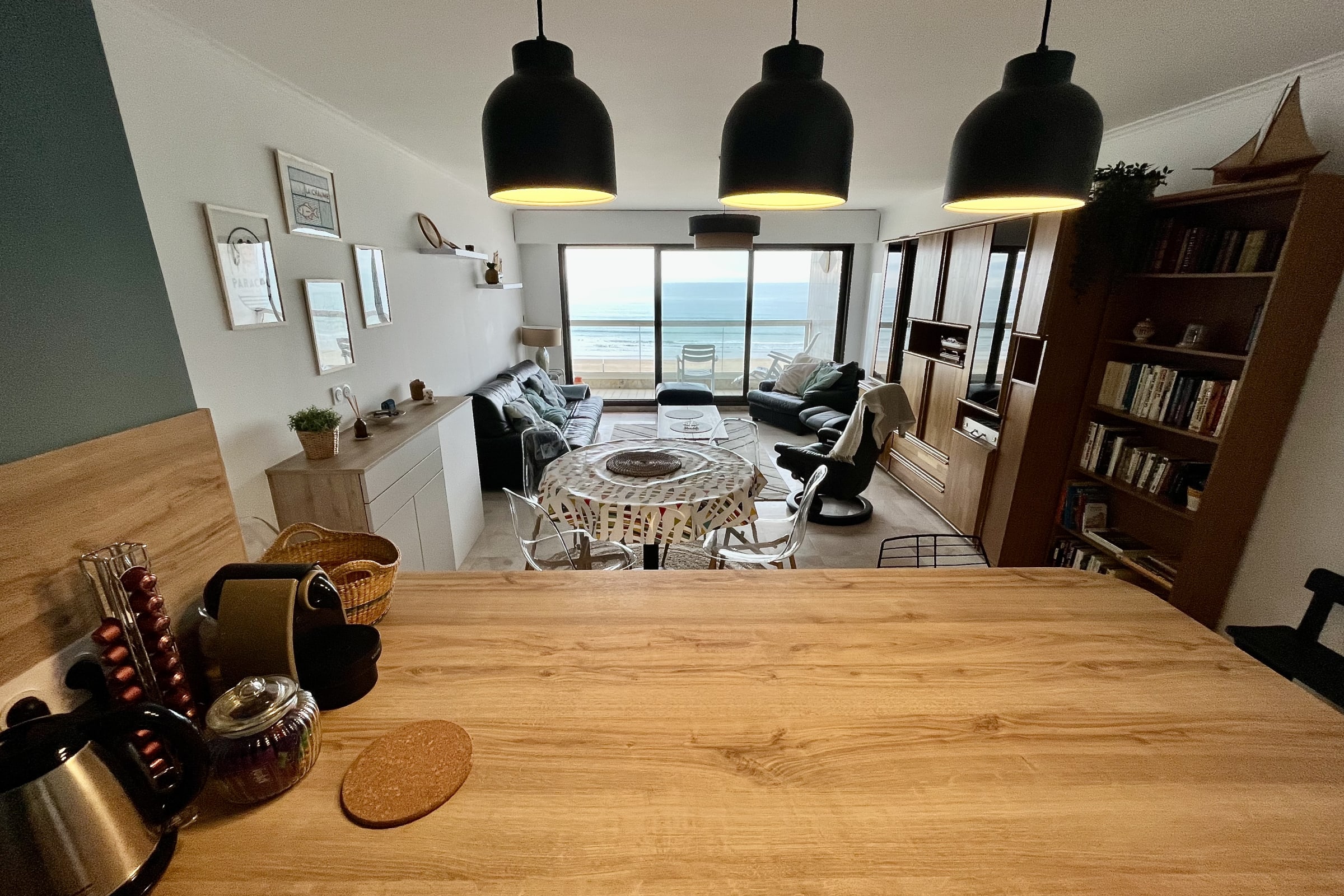 It has a hallway with storage serving the bright living room opening onto a balcony with a superb view of the bay of Les Sables d'Olonne.