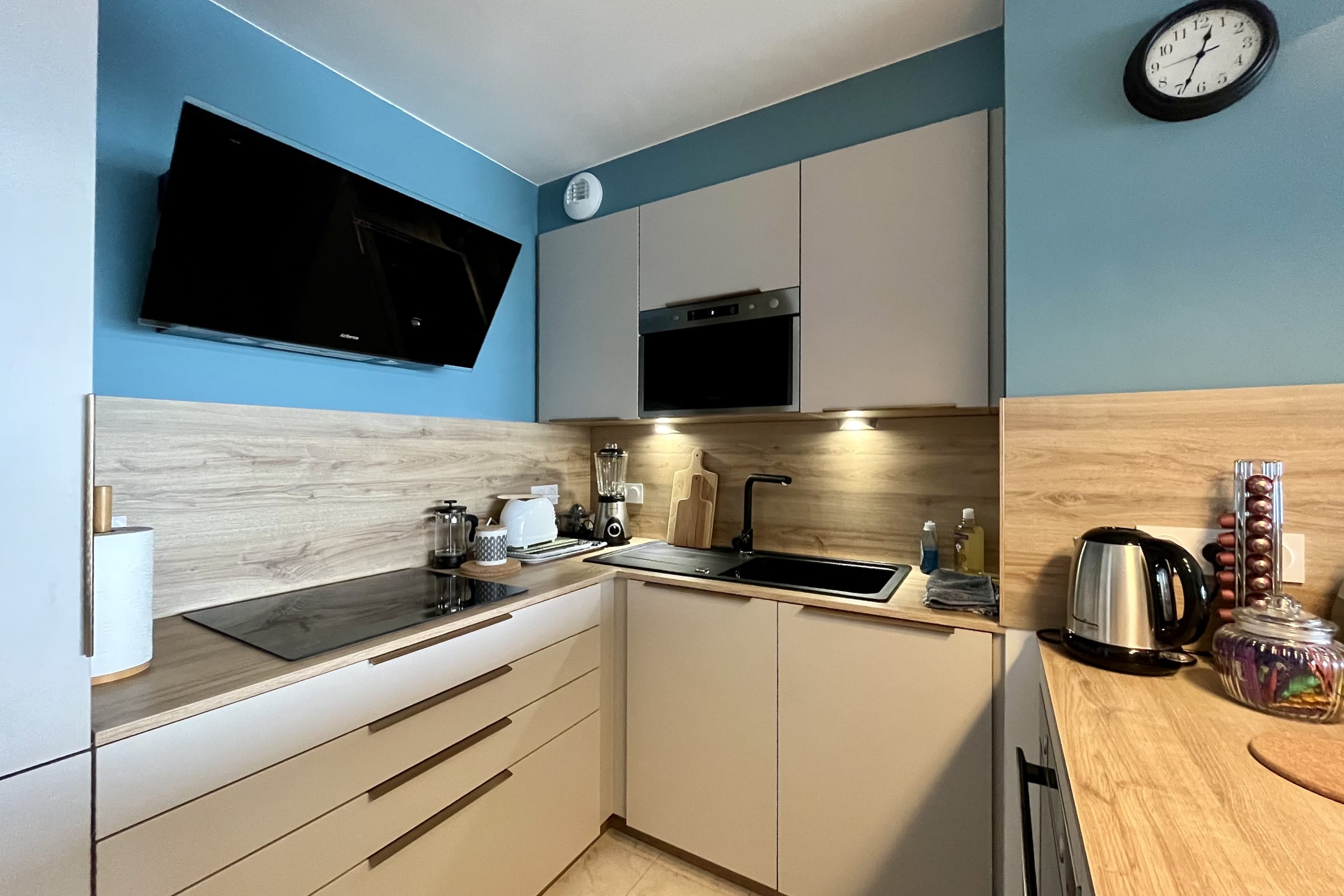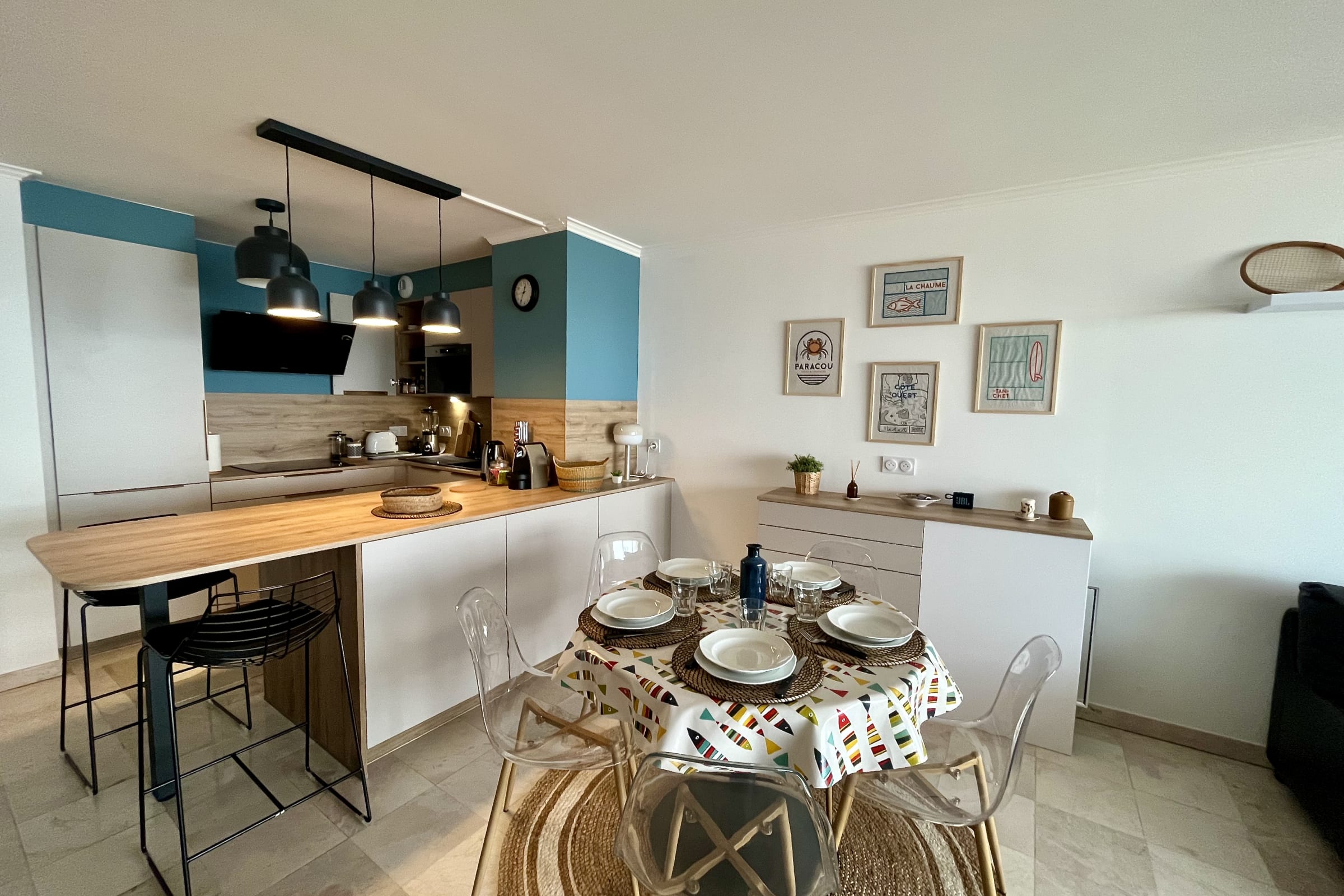 You can also enjoy a large kitchen open to the living room, and fully equipped: oven, coffee maker, microwave, dishwasher, washing machine...