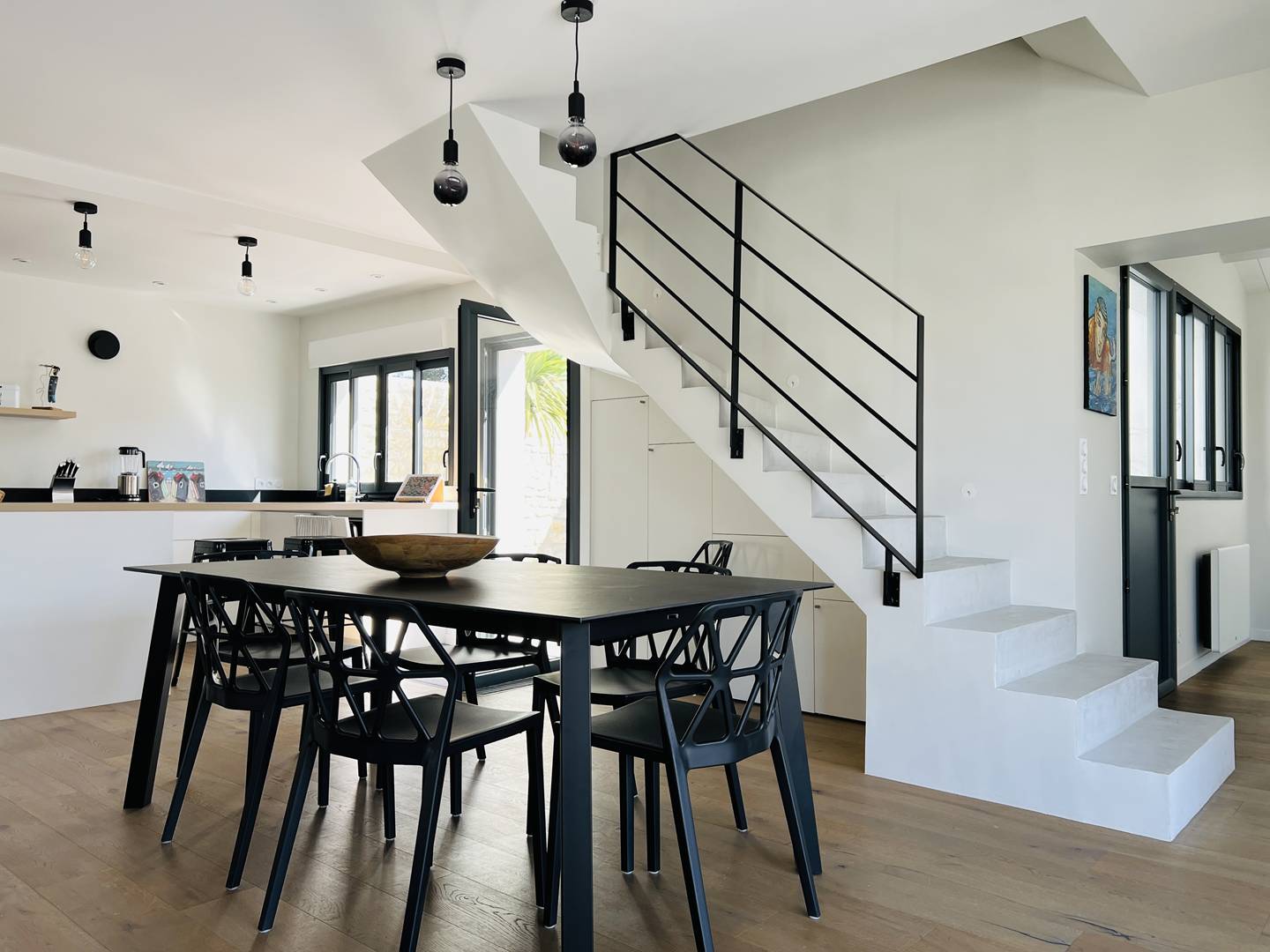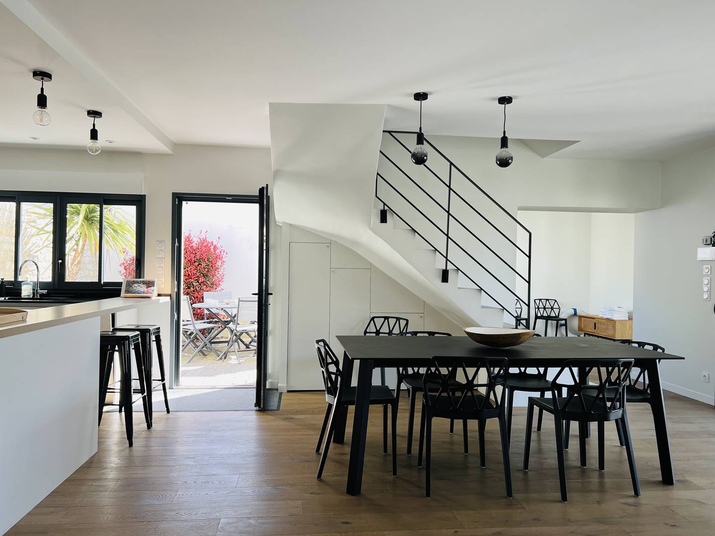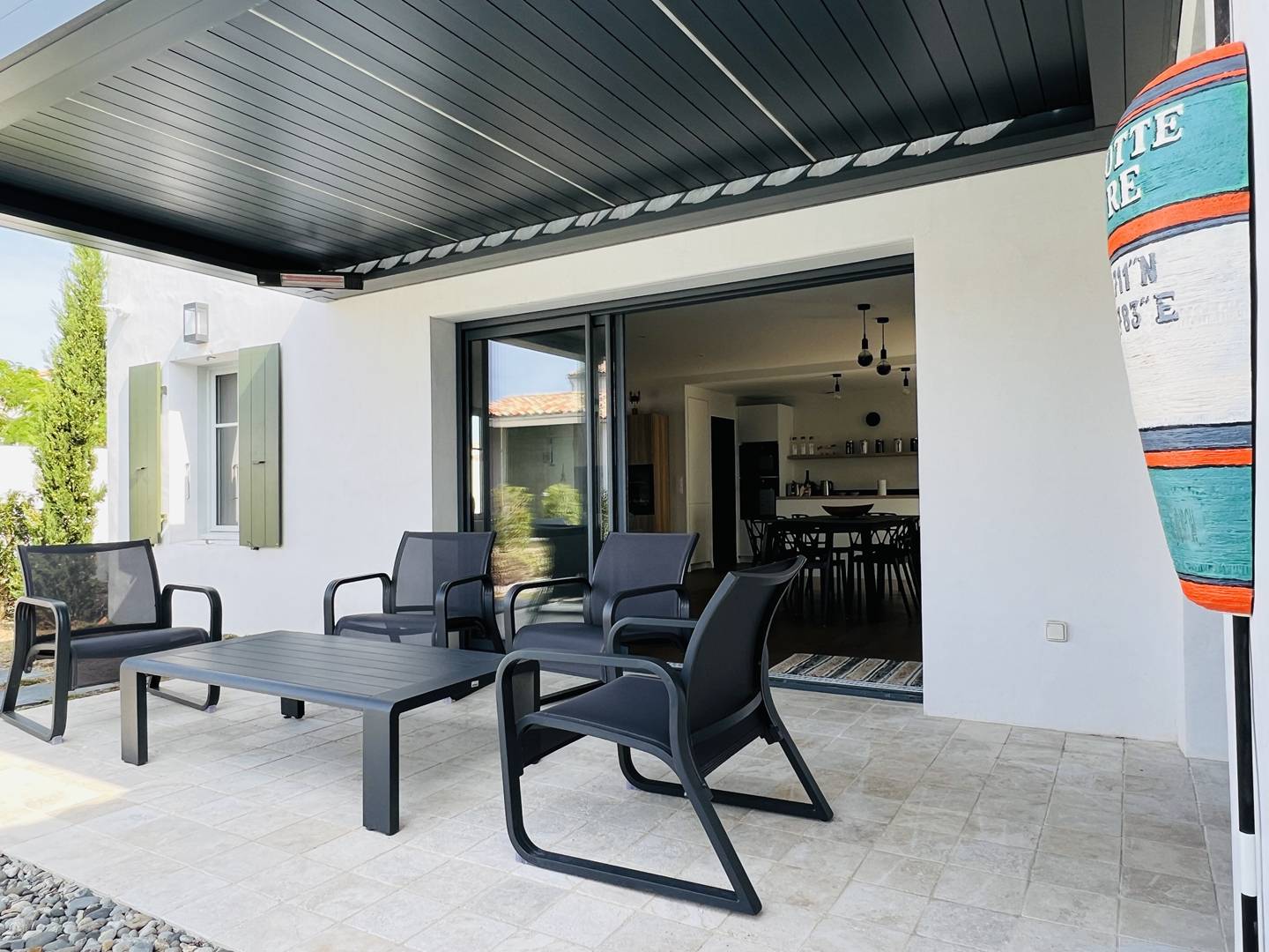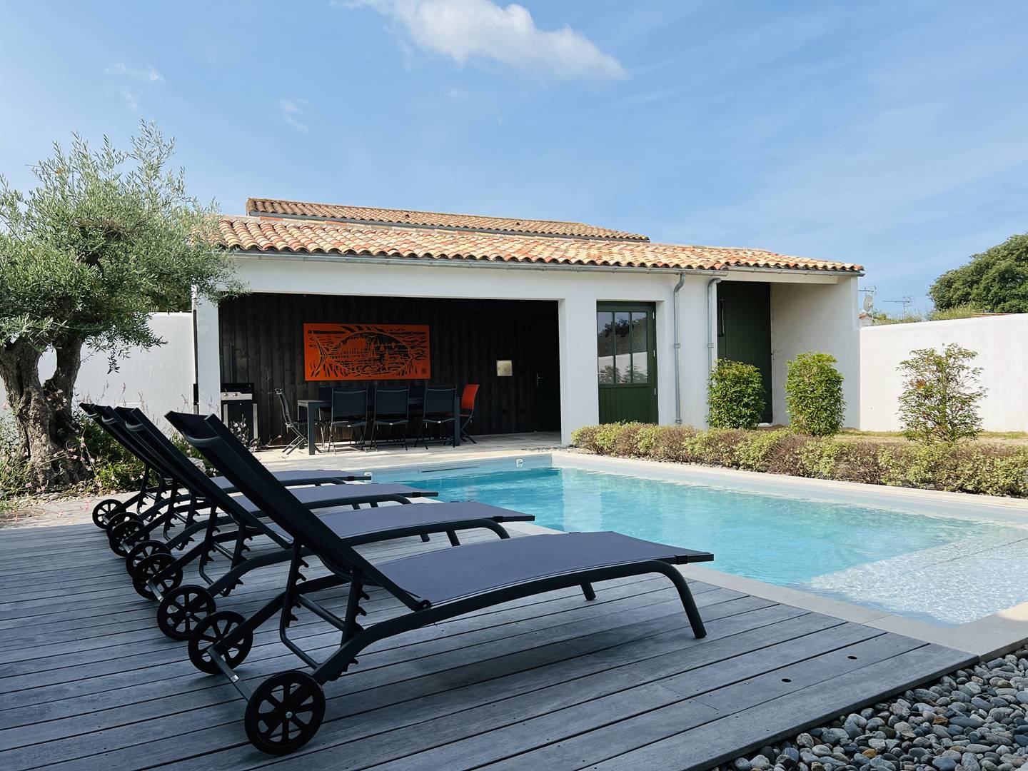 Treat yourself to a relaxing stay for the whole family or with friends in this beautiful villa with beautifully decorated swimming pool, carefully equipped for your comfort, in a quiet environment, close to the beach, cycle paths and the center of the charming village of La Float! The entrance leads to a large warm living room with parquet flooring. You will enjoy a very bright living room with a view of the swimming pool, a beautiful lounge area and an open kitchen with its central island and its access to the pretty landscaped patio inviting you to share moments of conviviality. The kitchen is very well equipped and extends with a laundry room. This same level distributes a beautiful master suite with dressing room, shower room and wc. Upstairs, three other bedrooms are at your disposal including a master suite with shower room, an independent shower room and toilets. You will appreciate the high ceilings in each room and the quality equipment (mattress, bathroom). Outside, a large terrace lets you glimpse sweet moments of idleness comfortably installed at the edge of the heated swimming pool (from April to October depending on the weather) or around a meal under the summer courtyard. Several parking spaces are possible within the grounds of this property.