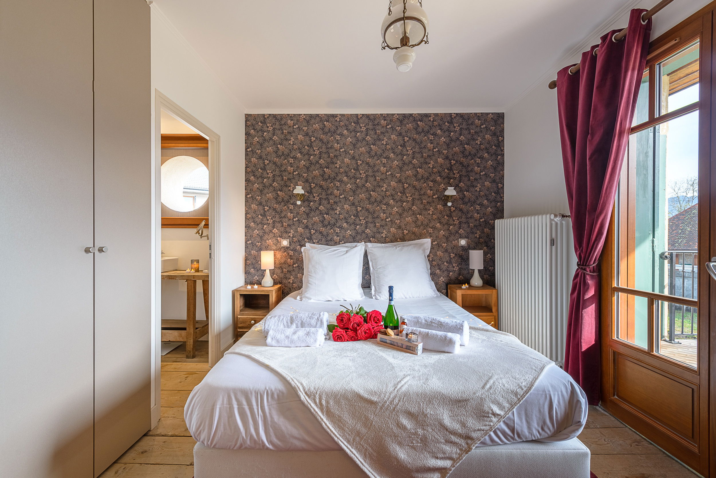 - Bedroom n°2 - Suite Lanfon : 1 queensize bed 160x200cm with storage cupboards, non functional fireplace and an access to the balcony shared with the room n°3, beautiful view on the mountains !