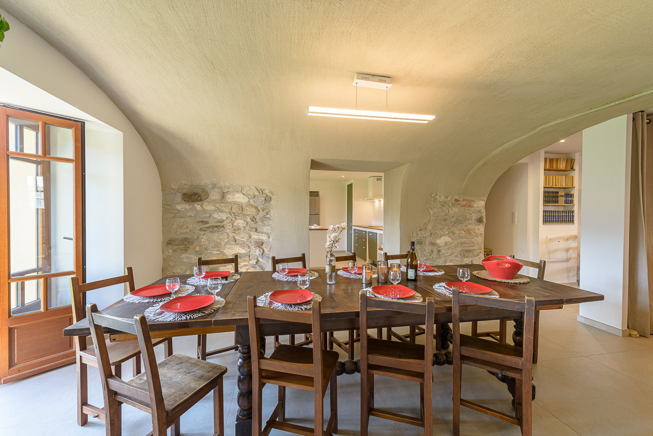 - A dining room under a vaulted ceiling with a dining table with extension that can accommodate up to 16 people with direct access to the garden