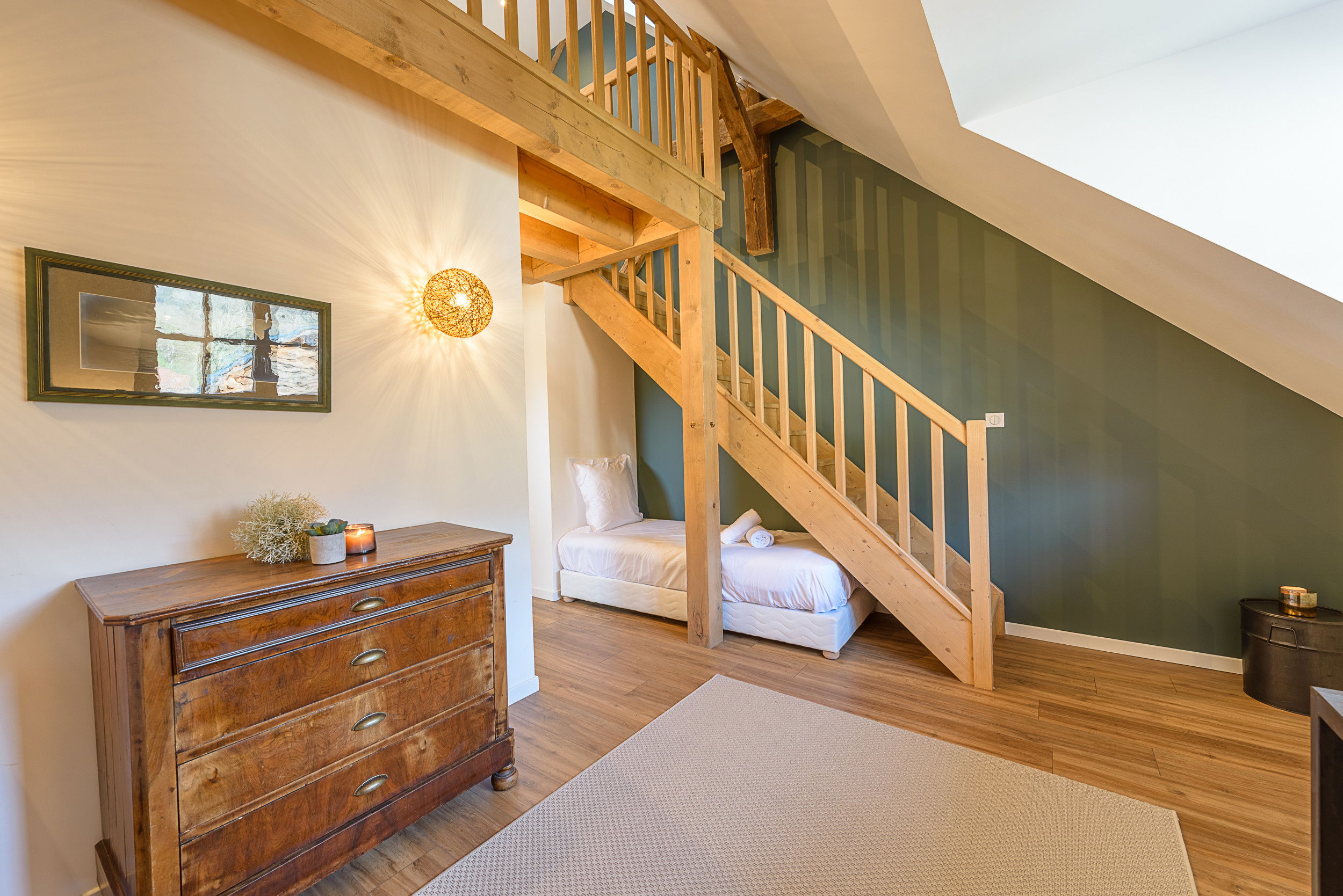 - Bedroom n°5 - Suite La Tournette : 1 queensize bed on the mezzanine, 1 single bed 80x190 ensuite bathroom with WC, day office
