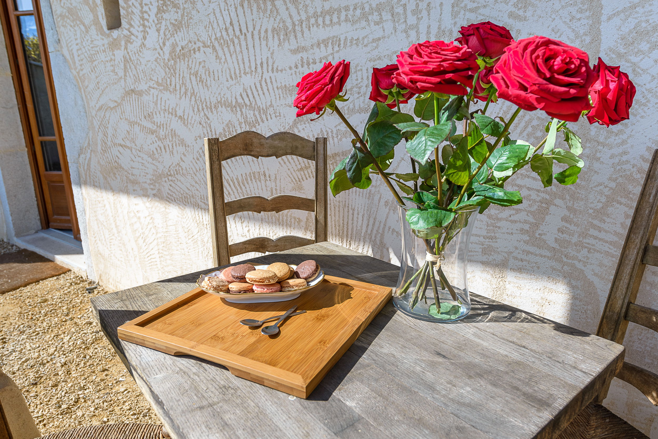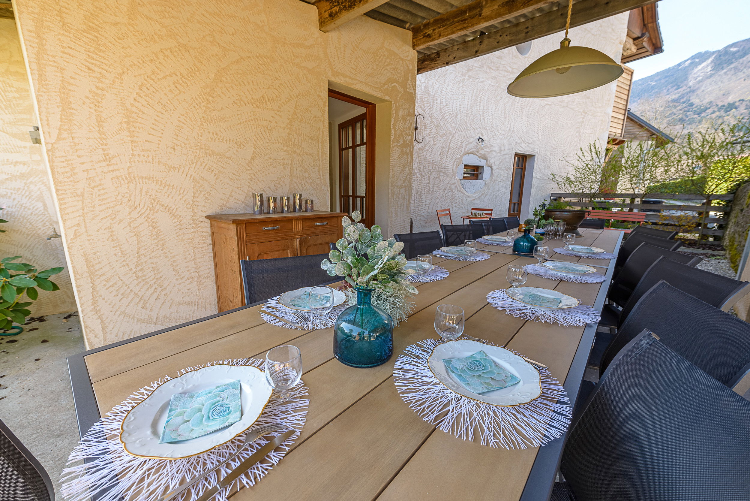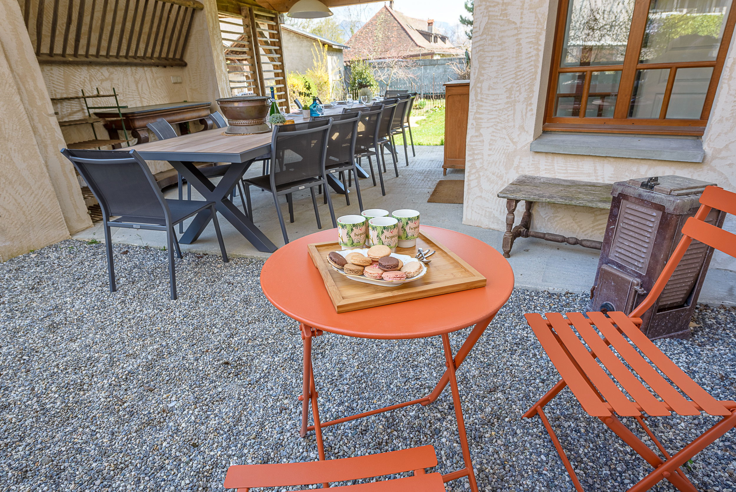 - A courtyard with a large table for the outdoor summer meals that we love so much, sheltered from the heat or the rain sometimes... and a garden lounge
