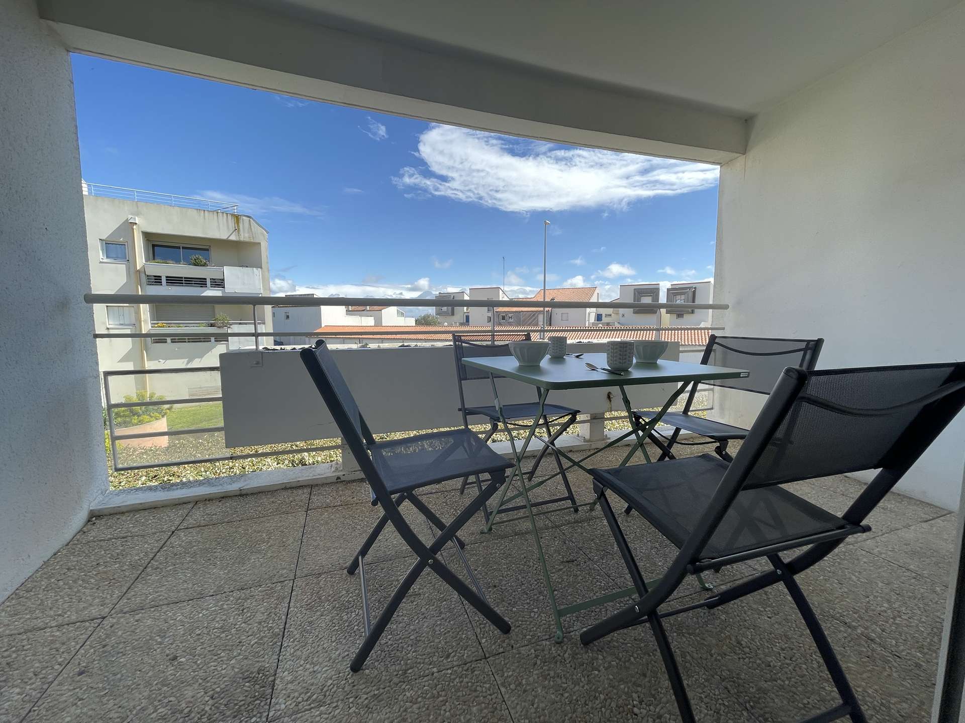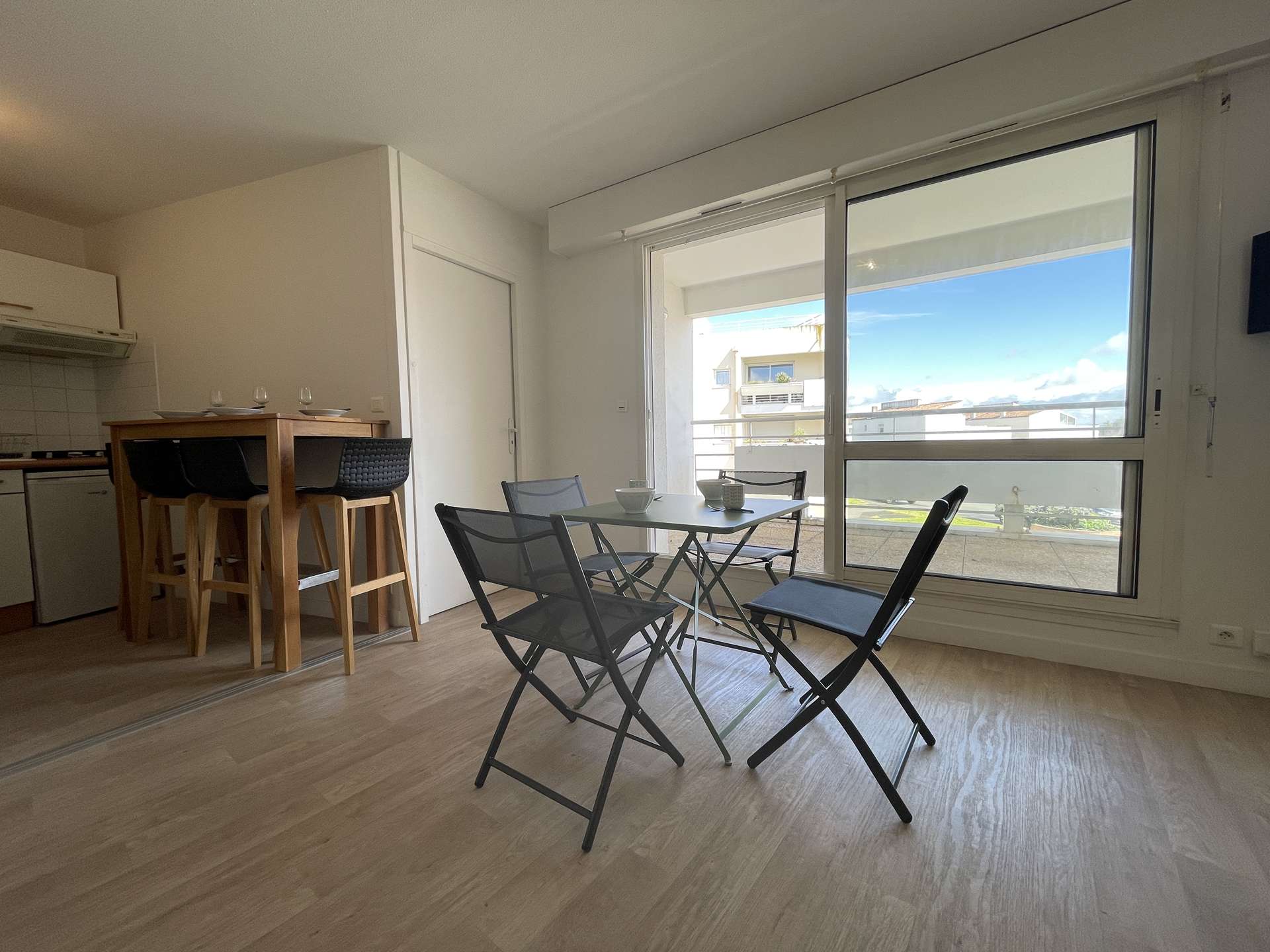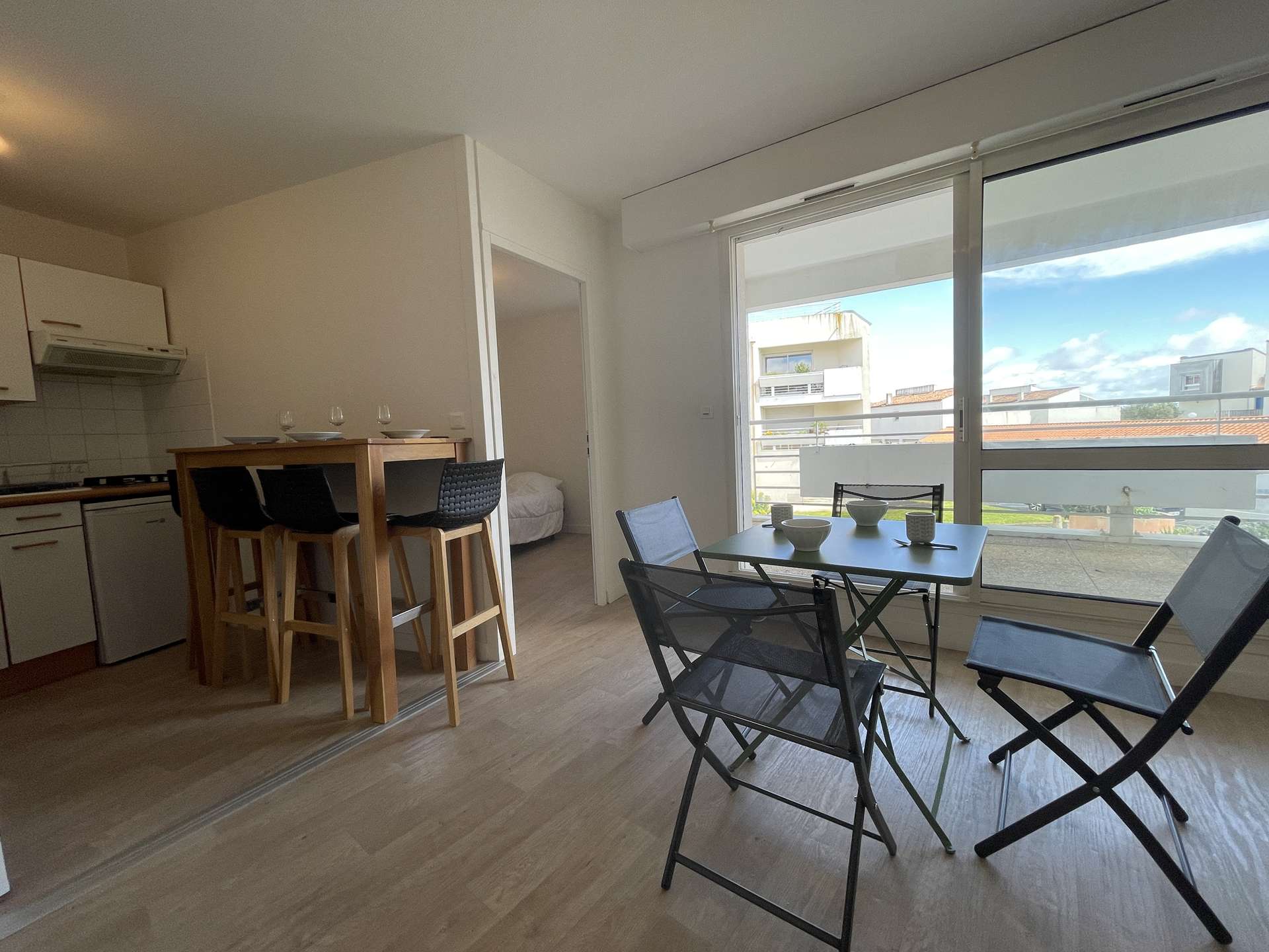 La Rochelle (17) - Les Minimes - Residence Calypso 2-room apartment - approx. 32 m² - up to 4 people Charming holiday apartment close to the Minimes beach. It is located in a quiet and secure residence. It is on the 1st floor and consists of a living room with an additional two-seater convertible fireside chair (lower once open), a terrace with garden furniture, an equipped kitchen area, a sleeping area with a 140cm double bed for two people, a bathroom with WC and a cellar with washing machine. Beautiful walks will be expected, in fact, the residence is located a few steps from the ocean. The advantages of this rental by the sea: Balcony, beach nearby, secure residence, close to shops and easy access to public transport. Cleaning included. Delivery and return of keys exclusively in La Rochelle (Minimes district).