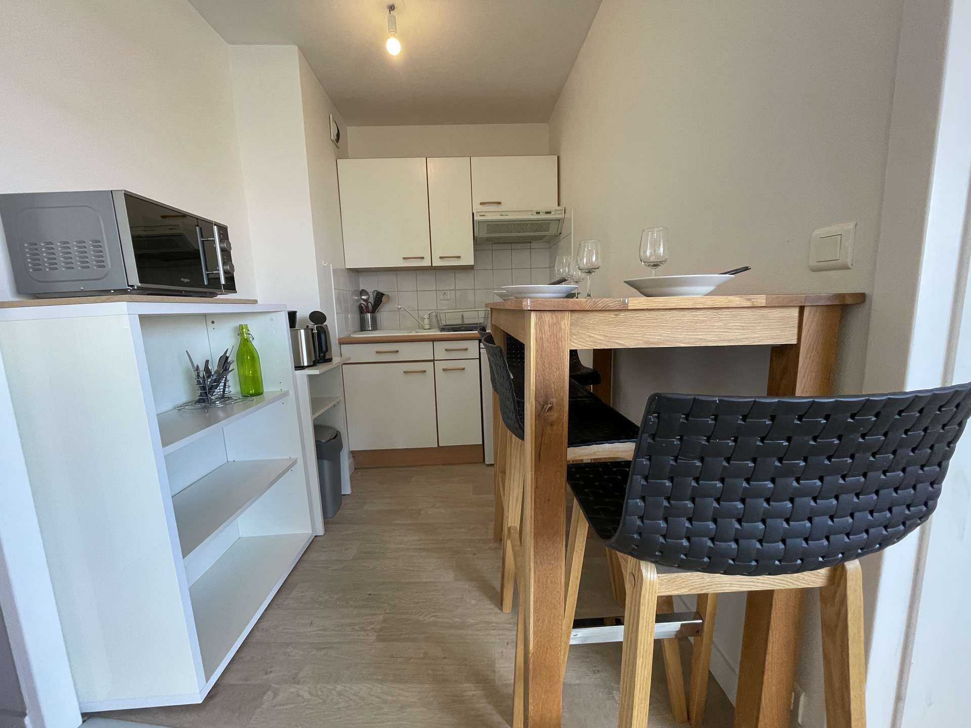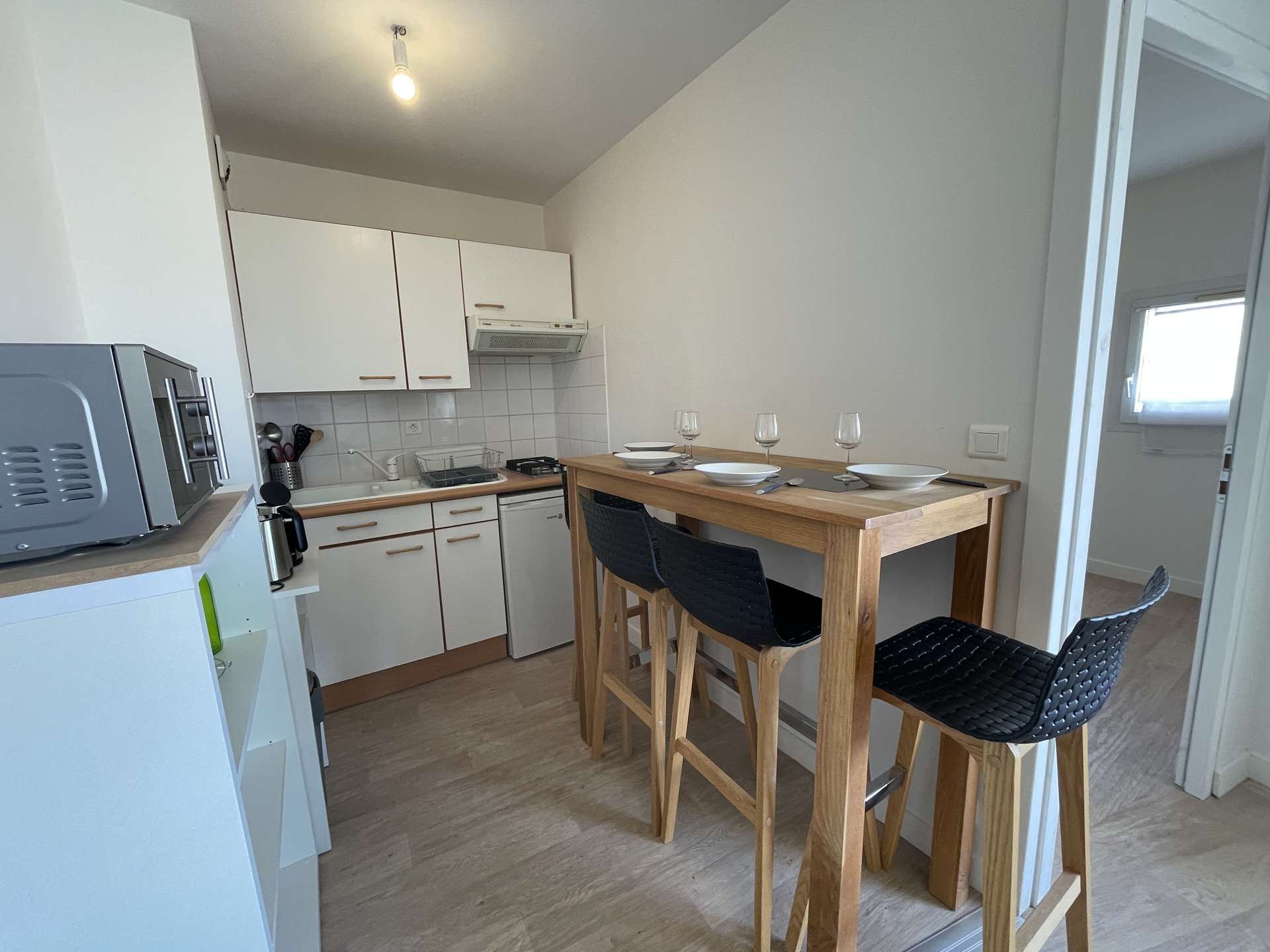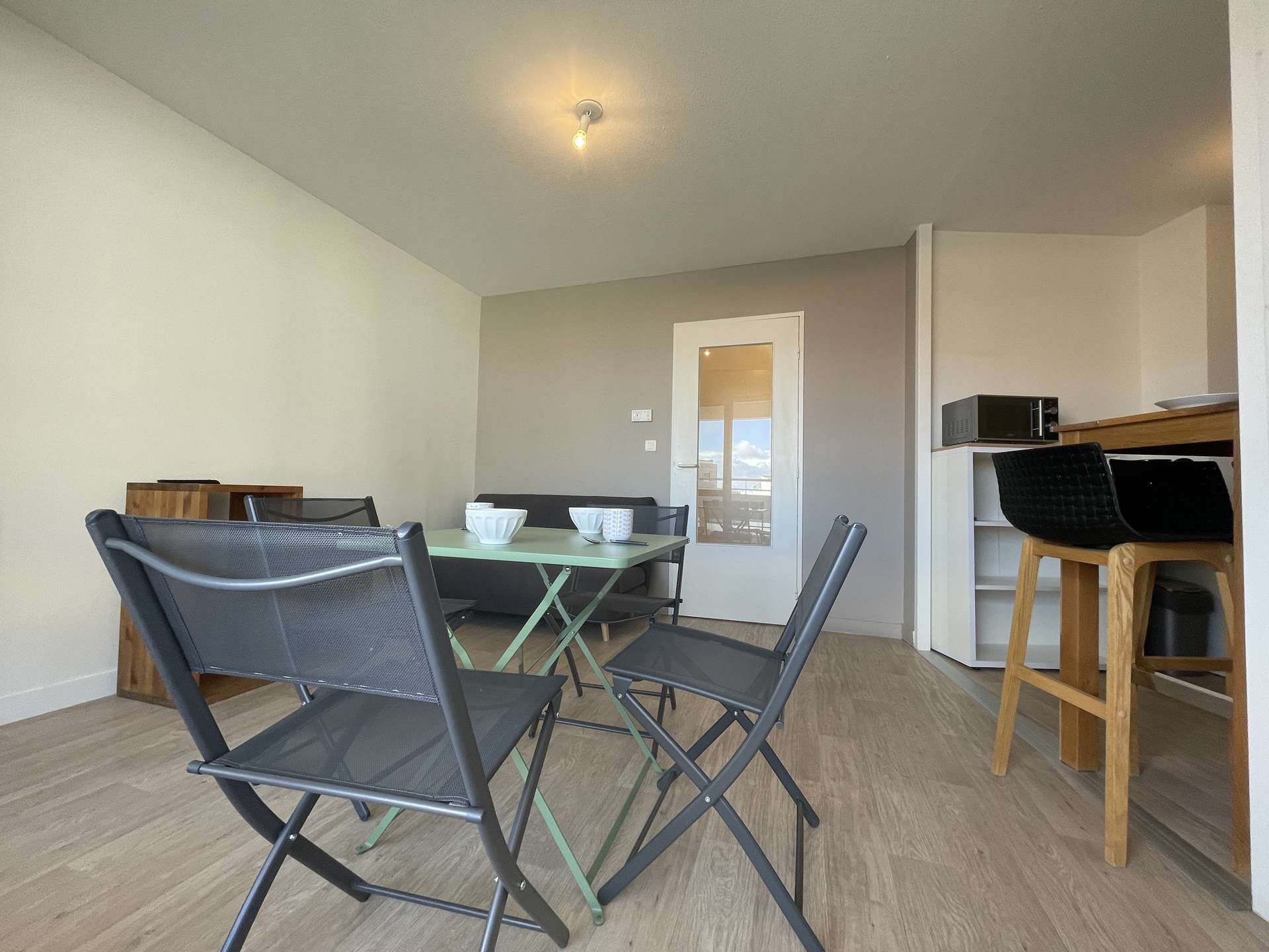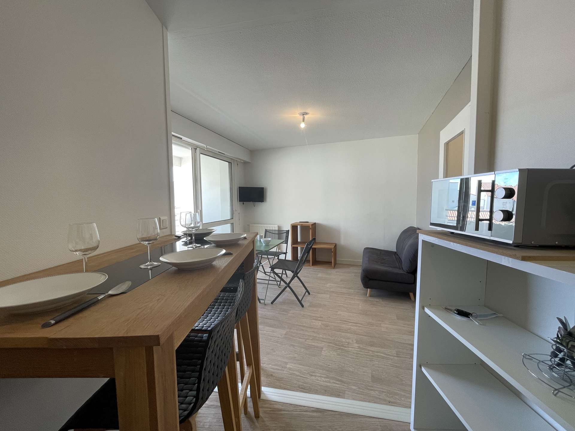 La Rochelle (17) - Les Minimes - Residence Calypso 2-room apartment - approx. 32 m² - up to 4 people Charming holiday apartment close to the Minimes beach. It is located in a quiet and secure residence. It is on the 1st floor and consists of a living room with an additional two-seater convertible fireside chair (lower once open), a terrace with garden furniture, an equipped kitchen area, a sleeping area with a 140cm double bed for two people, a bathroom with WC and a cellar with washing machine. Beautiful walks will be expected, in fact, the residence is located a few steps from the ocean. The advantages of this rental by the sea: Balcony, beach nearby, secure residence, close to shops and easy access to public transport. Cleaning included. Delivery and return of keys exclusively in La Rochelle (Minimes district).