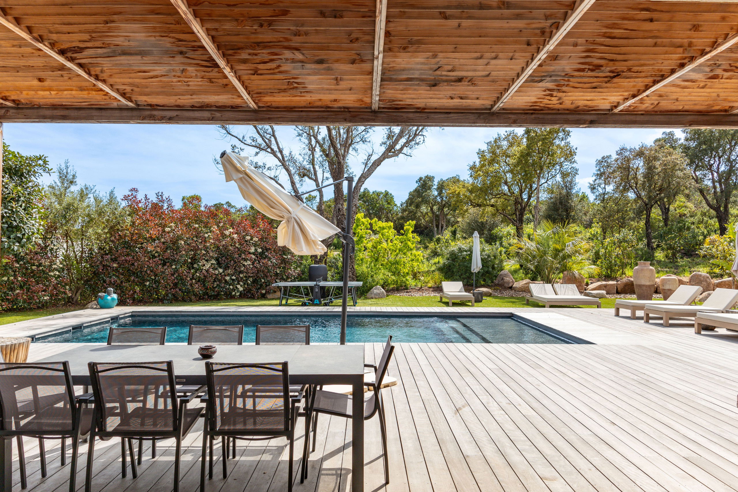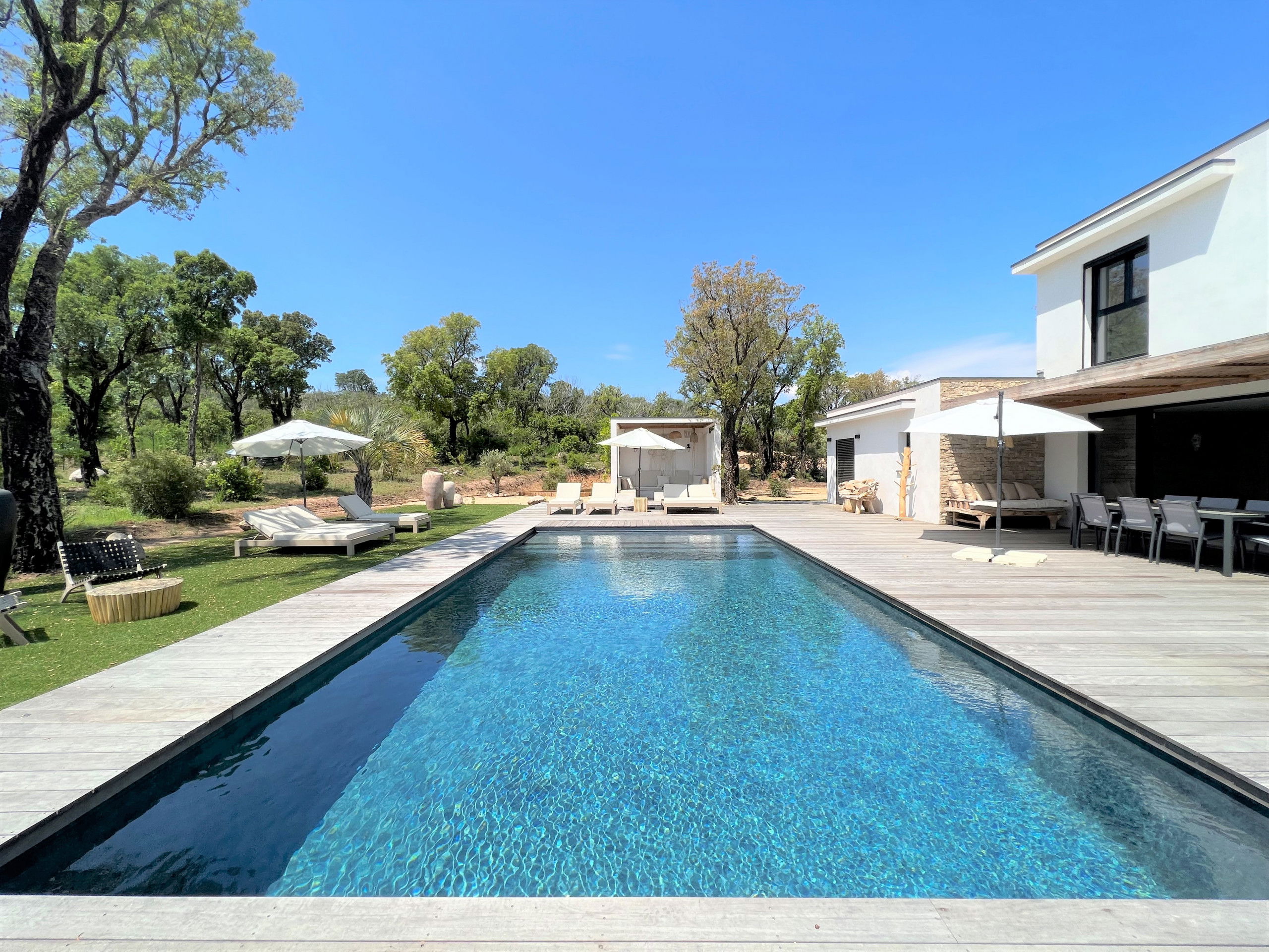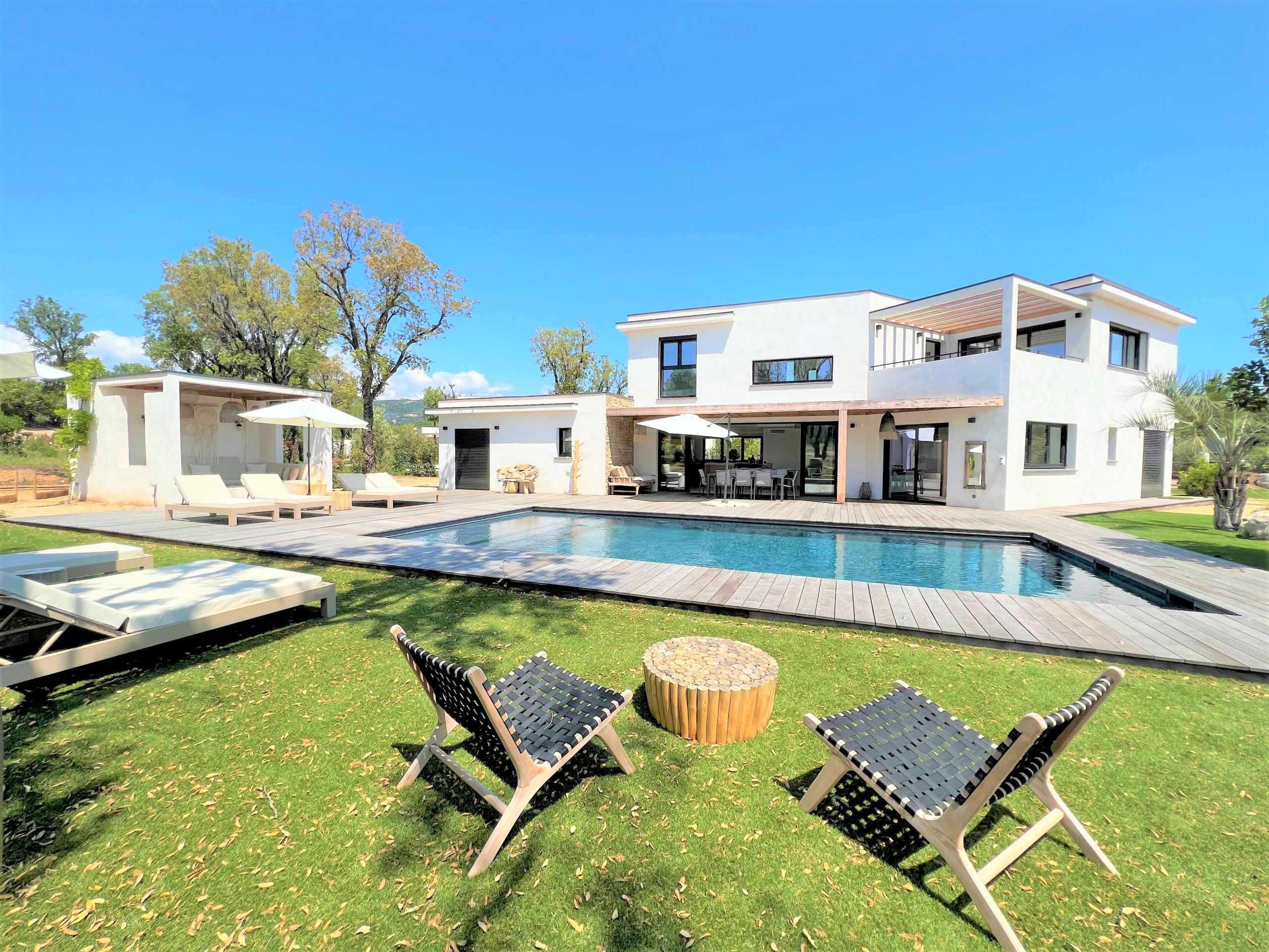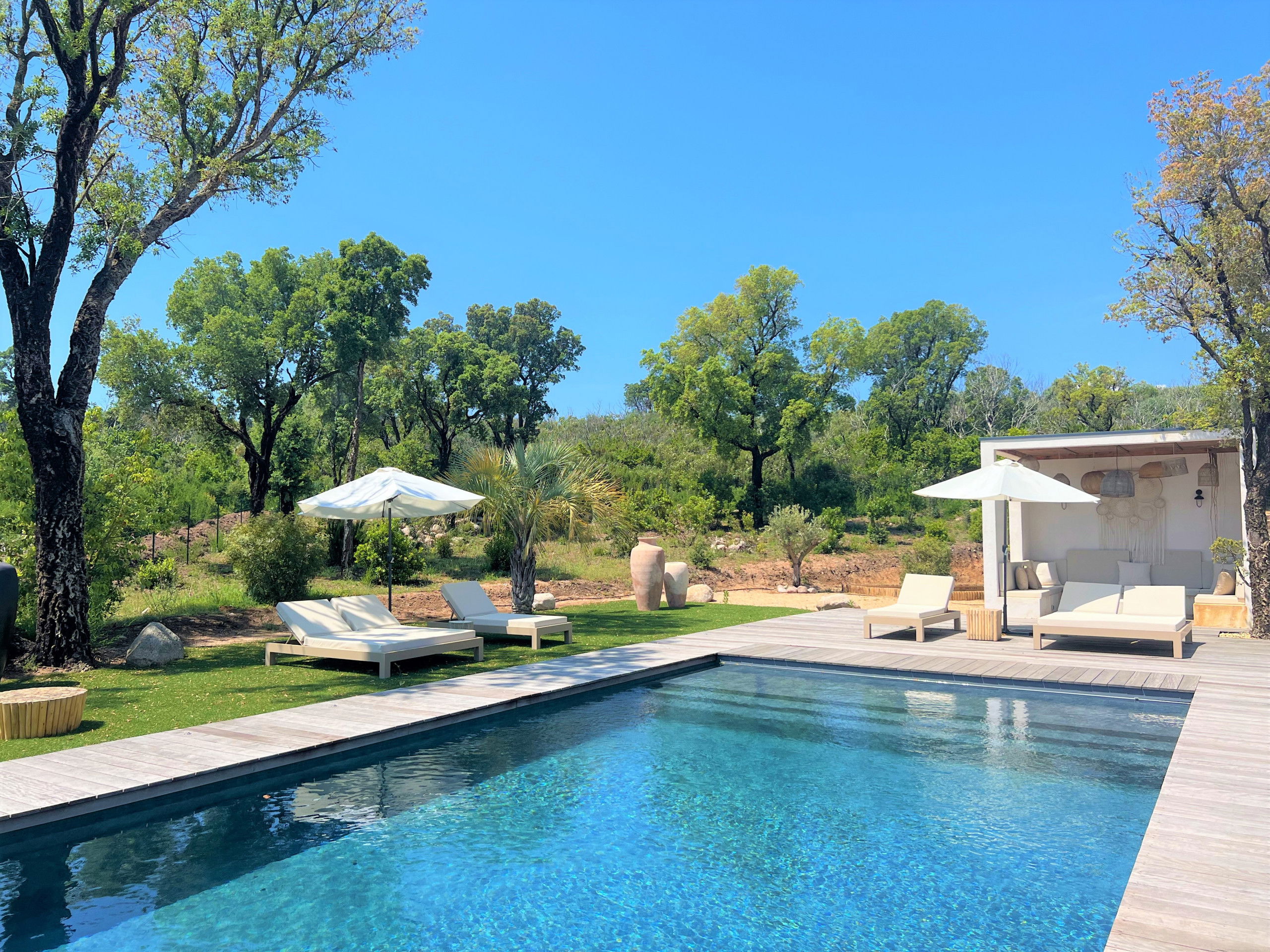 - Pool house and furnished terrace with relaxation area, sun loungers and parasols.