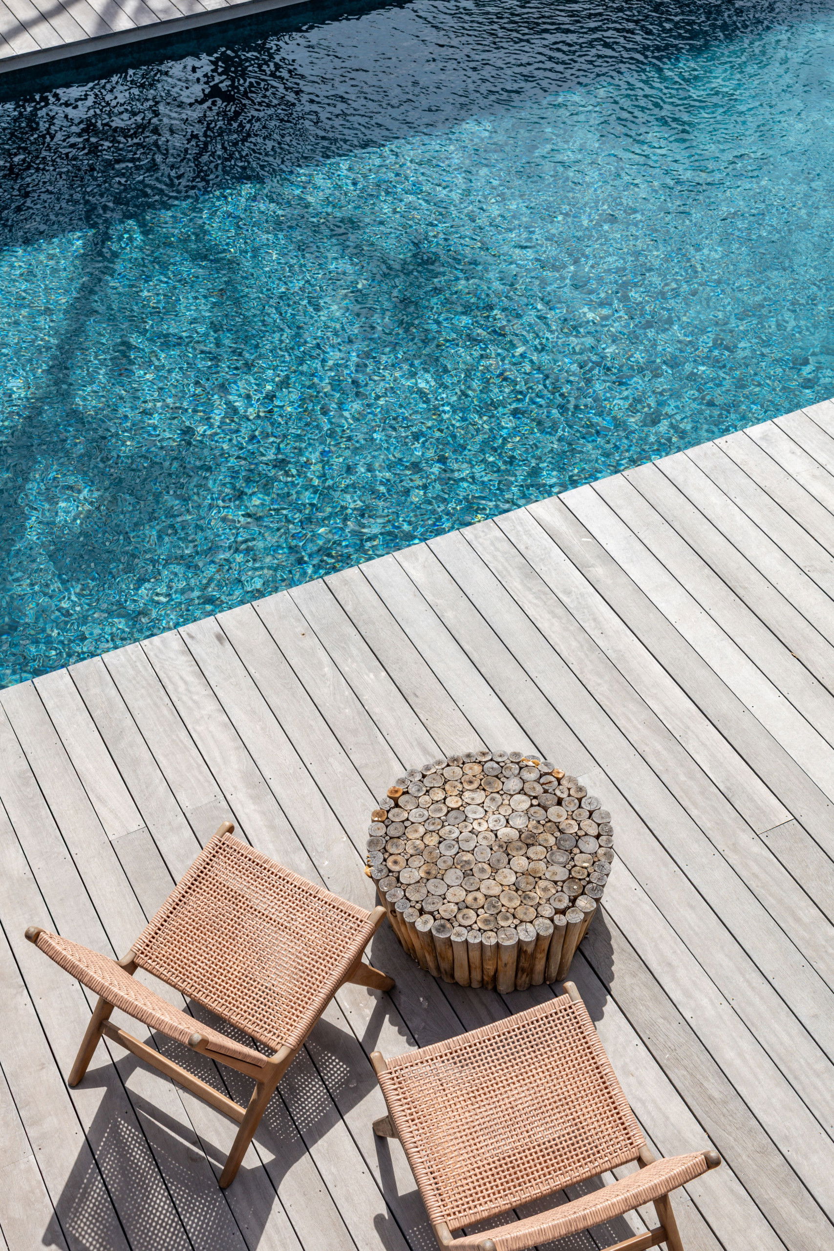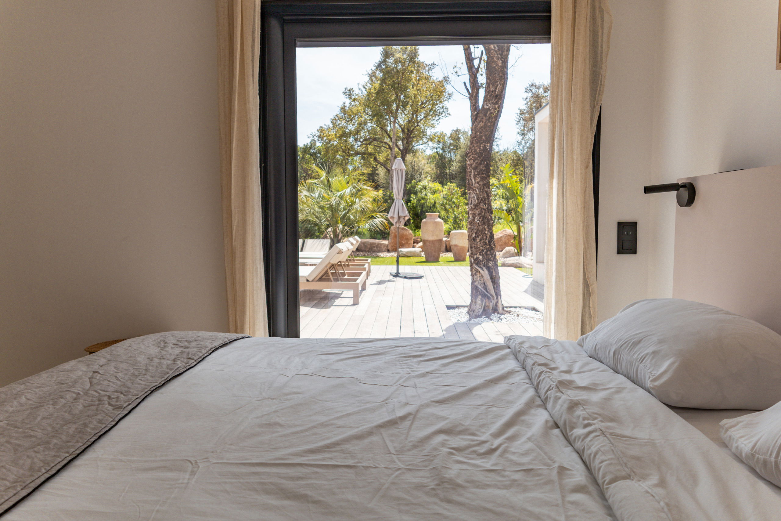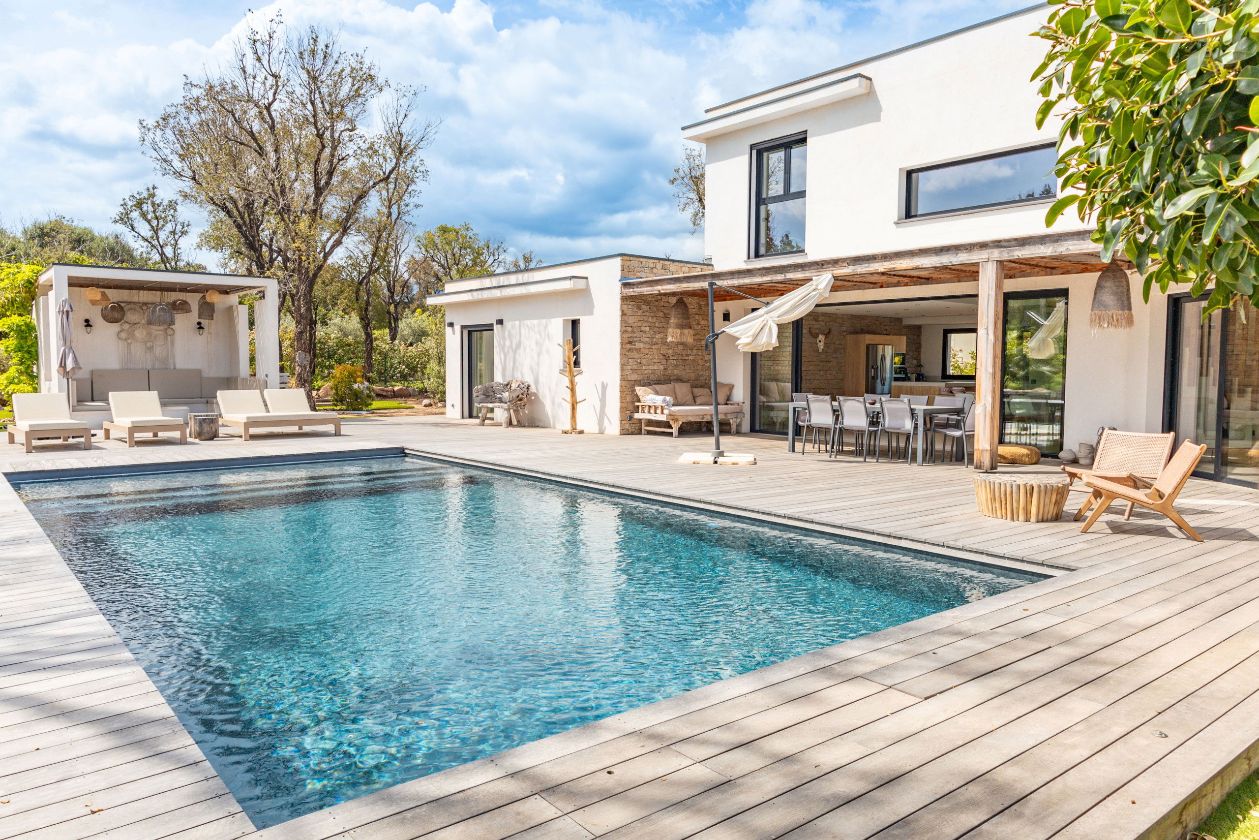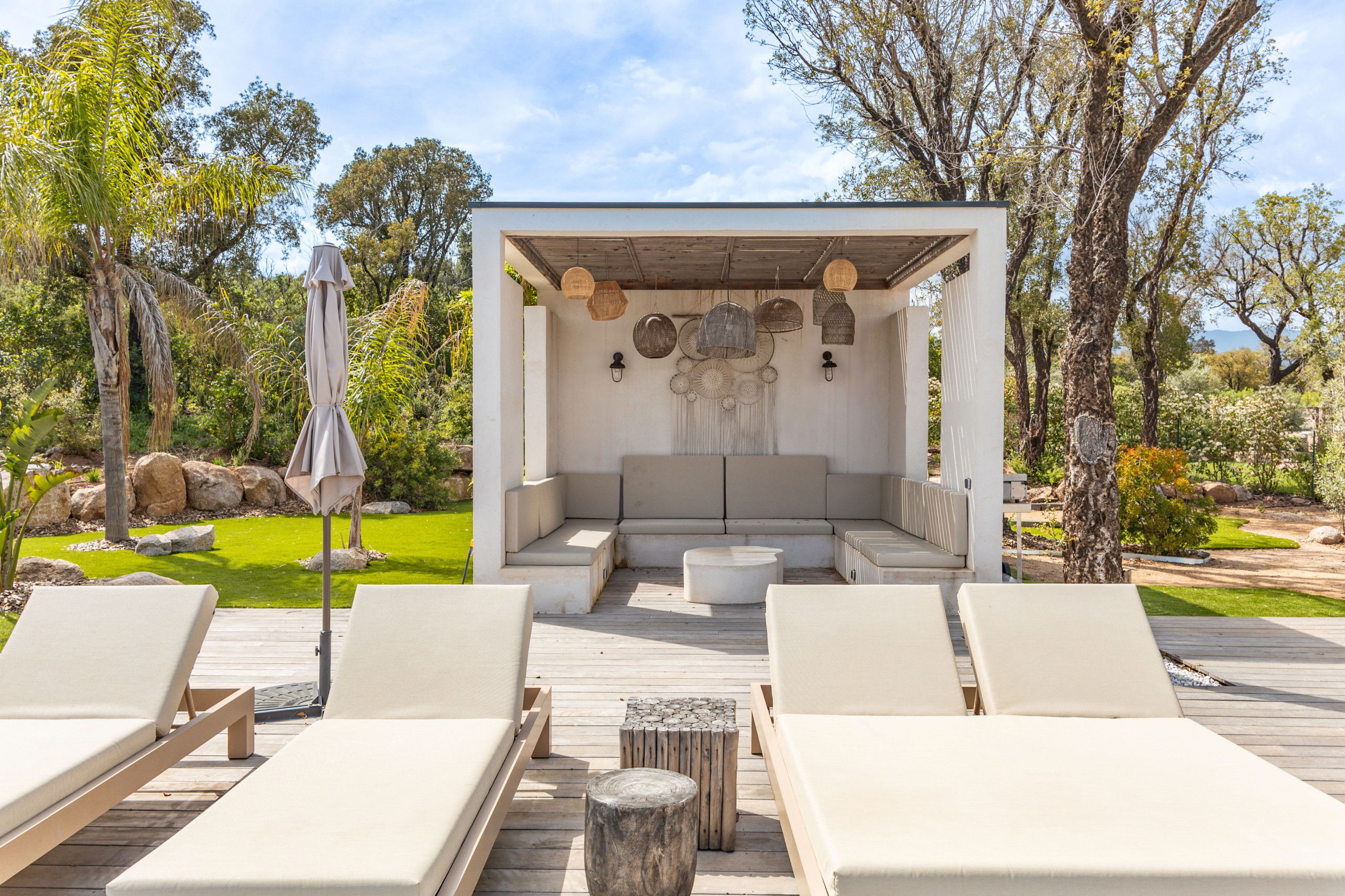 - Pool house and furnished terrace with relaxation area, sun loungers and parasols.