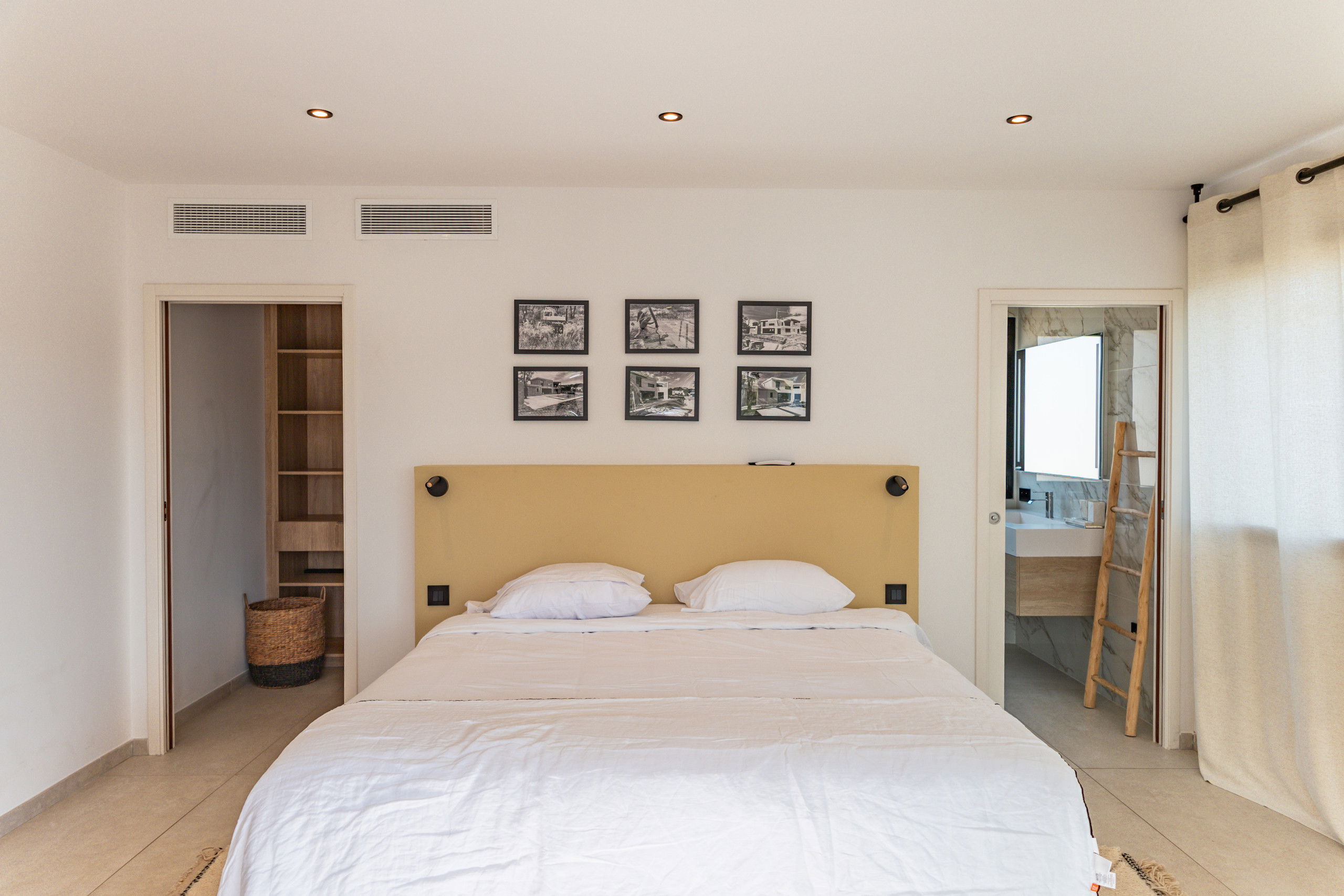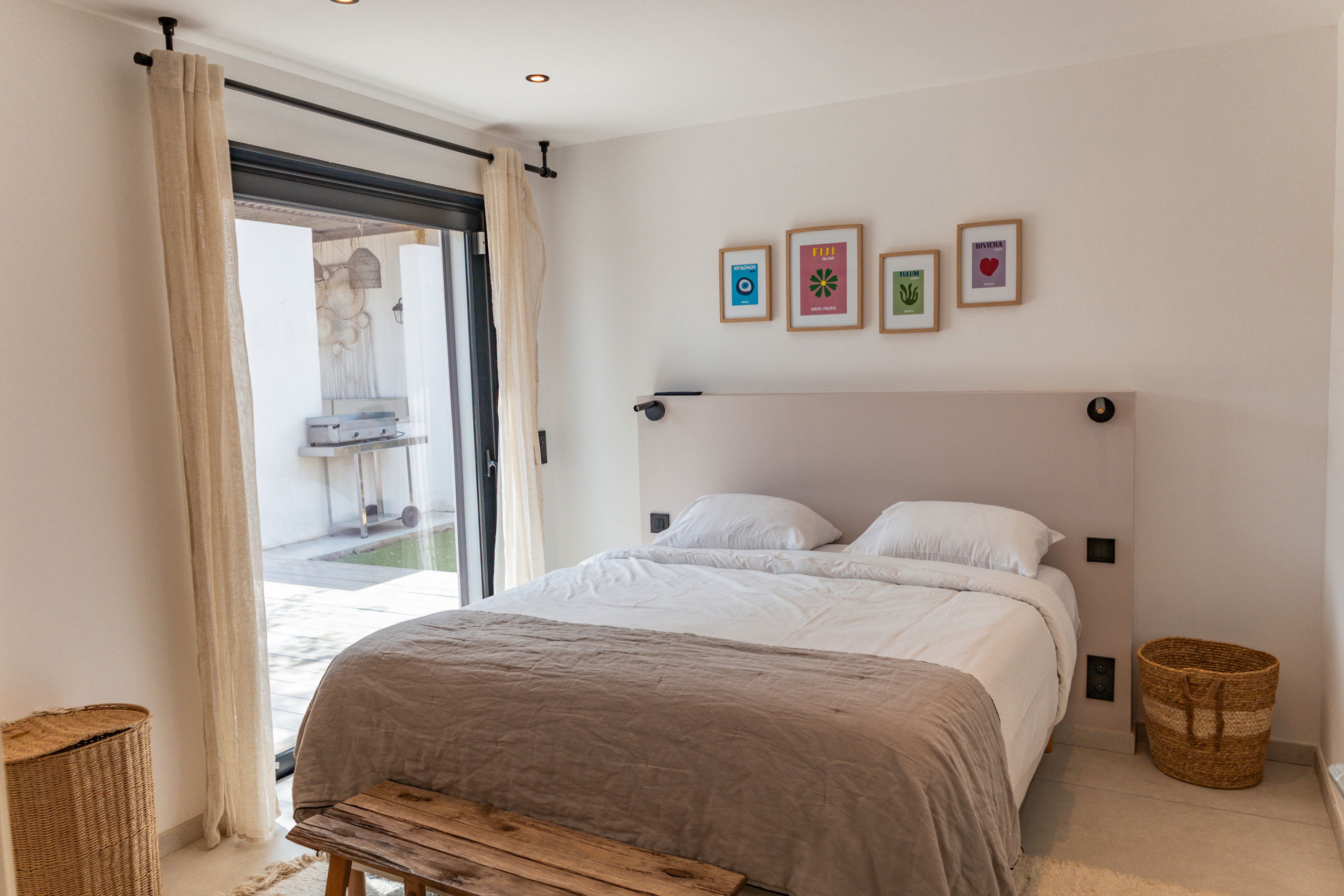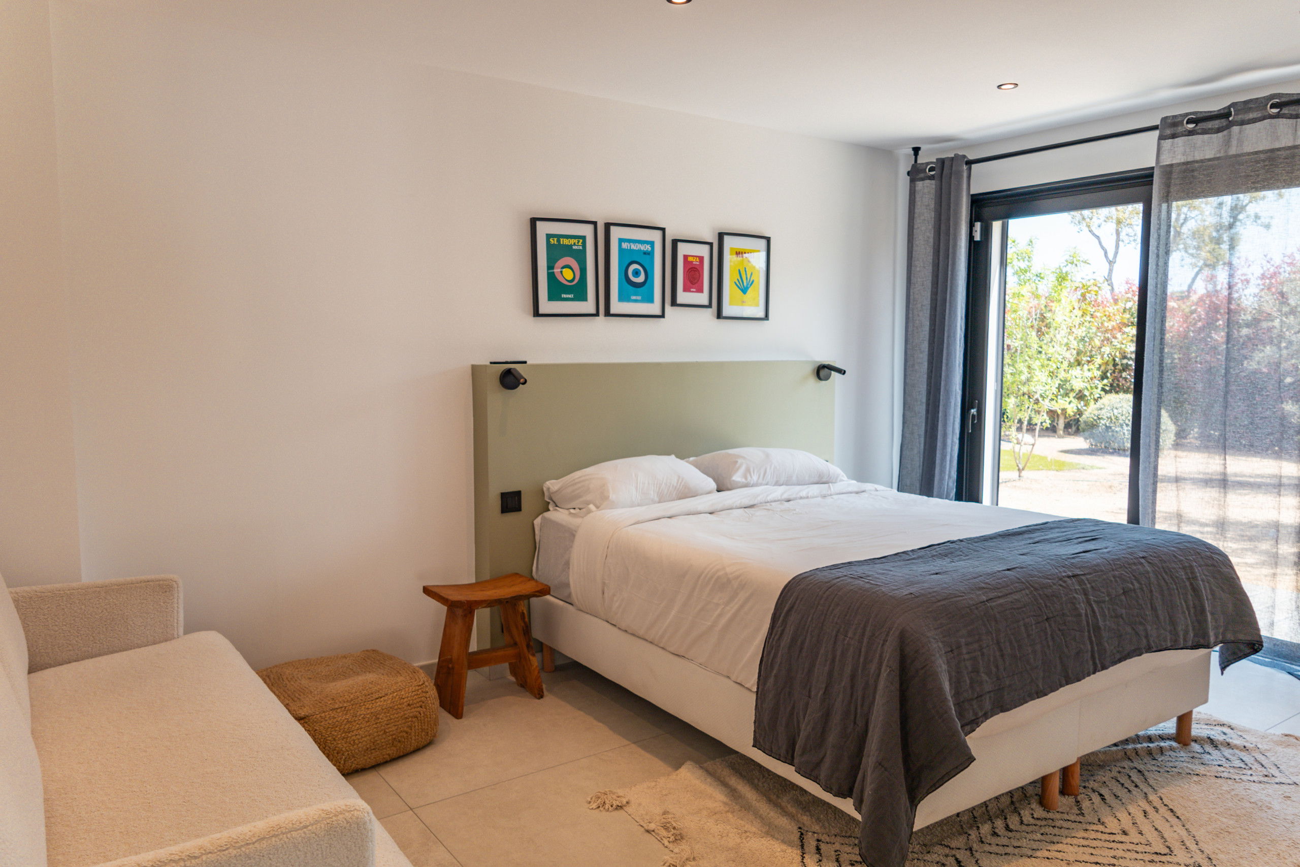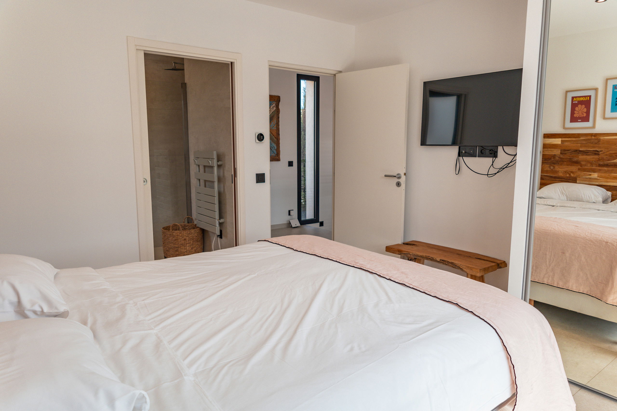 Bedroom 1: Queen Size bed 160* 200 with storage, TV and terrace / pool access.