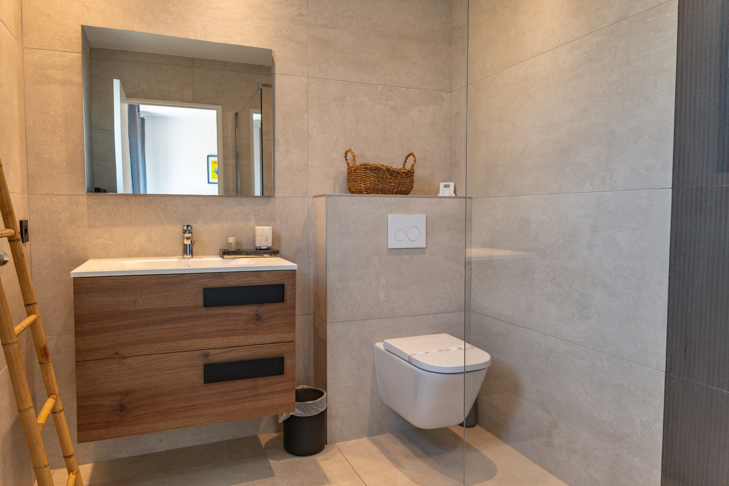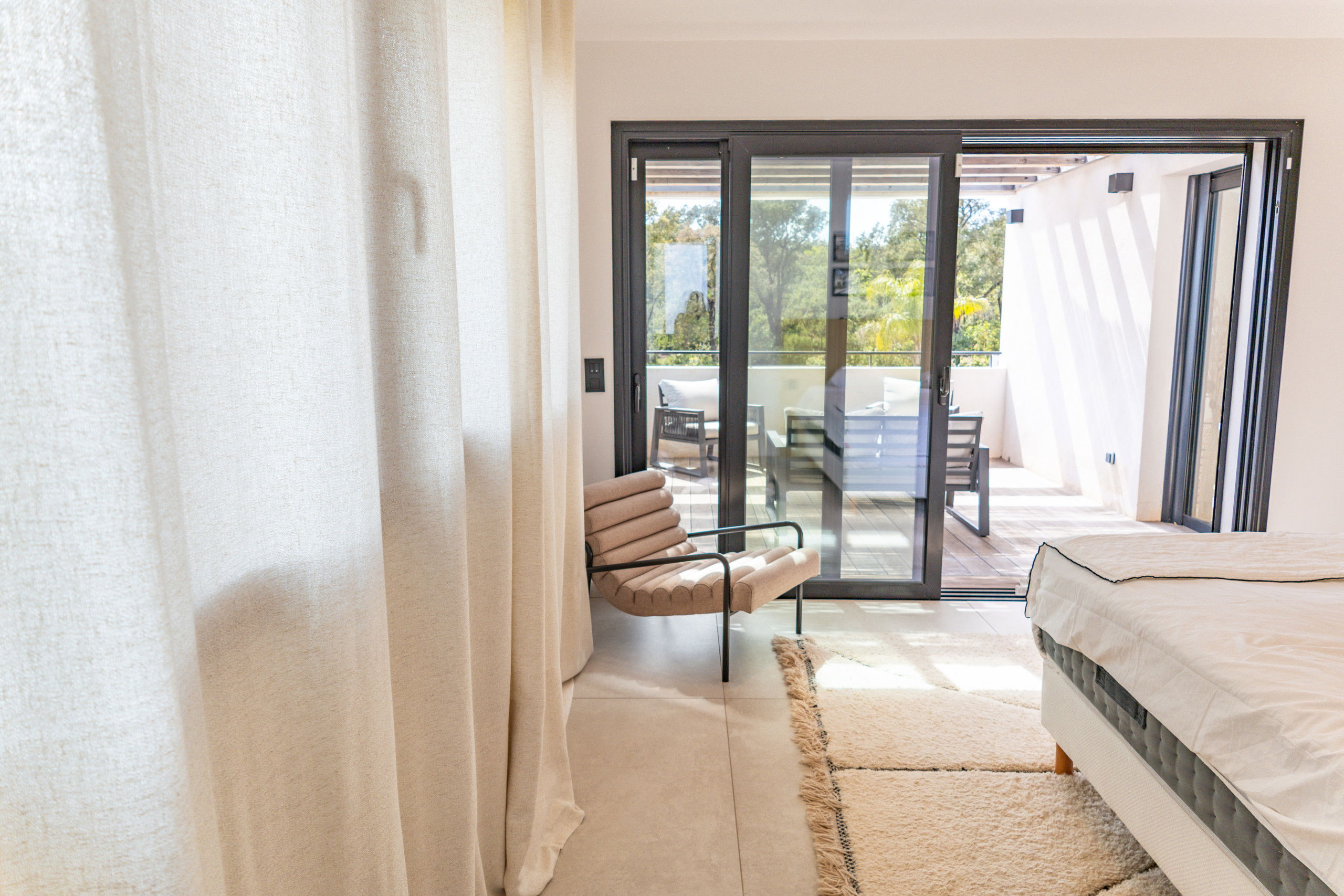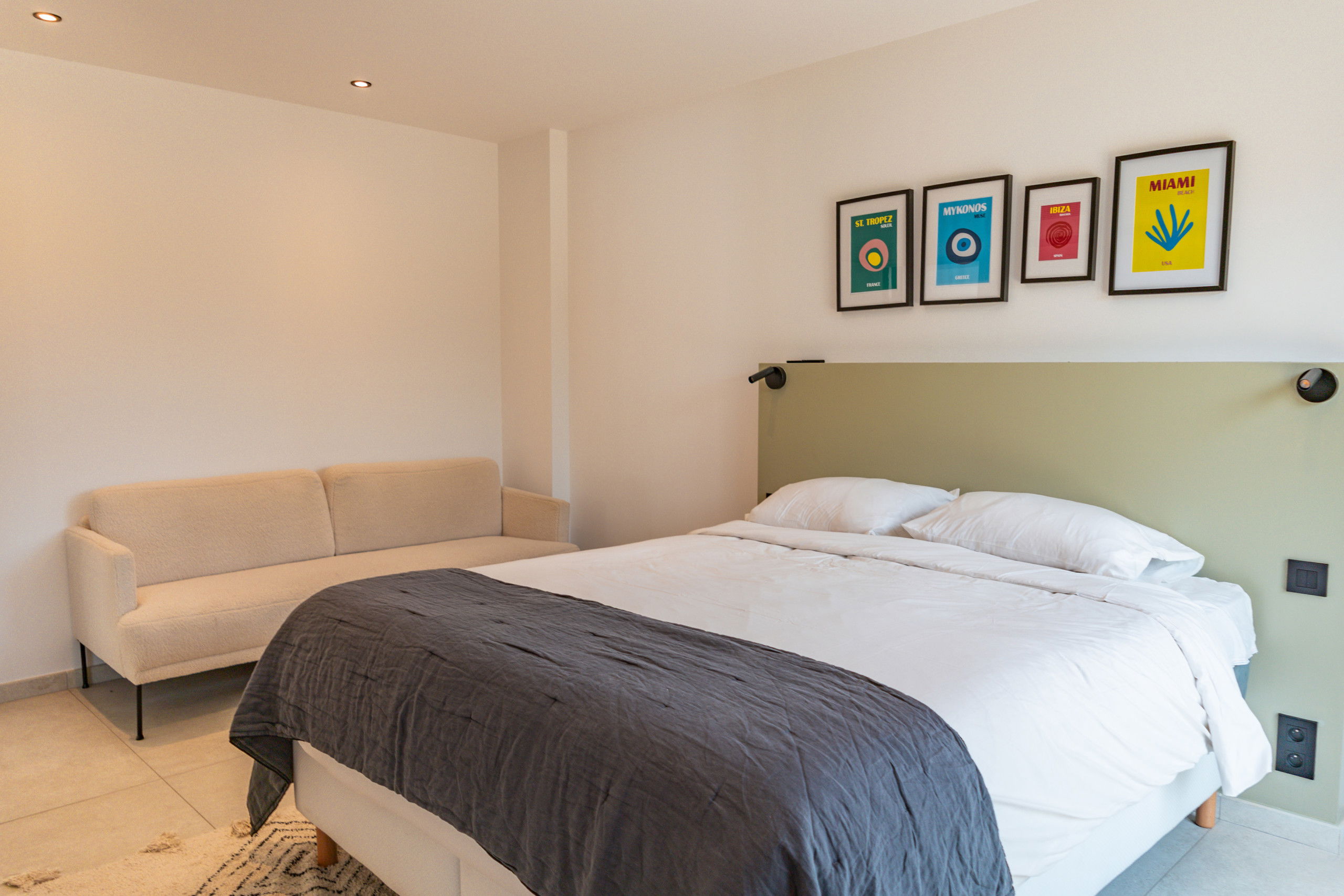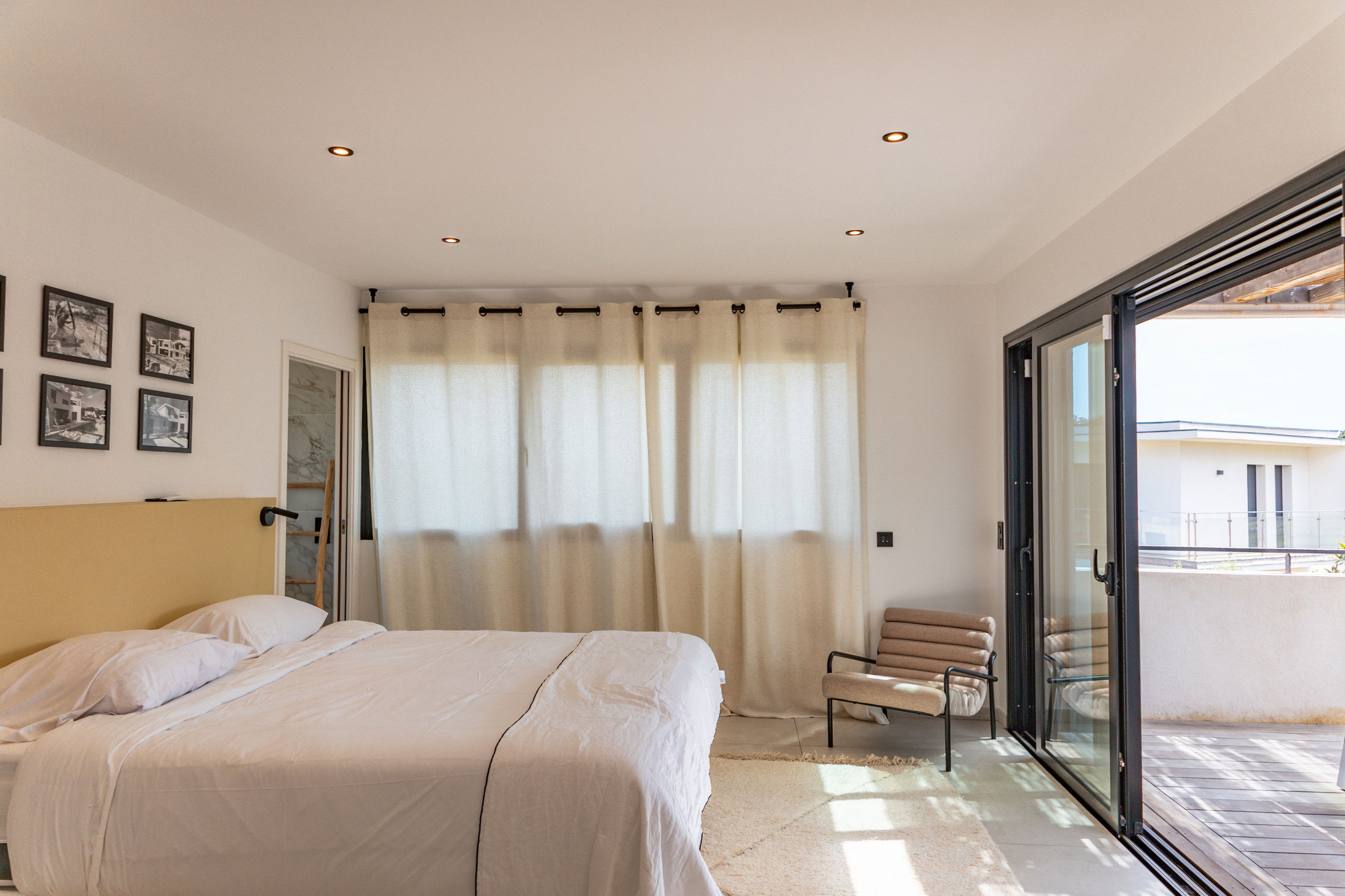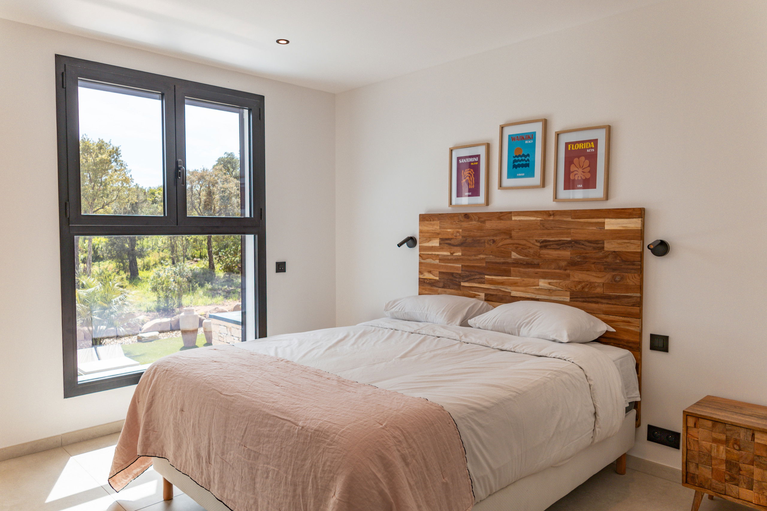 Bedroom 1: Queen Size bed 160* 200 with storage, TV and terrace / pool access.