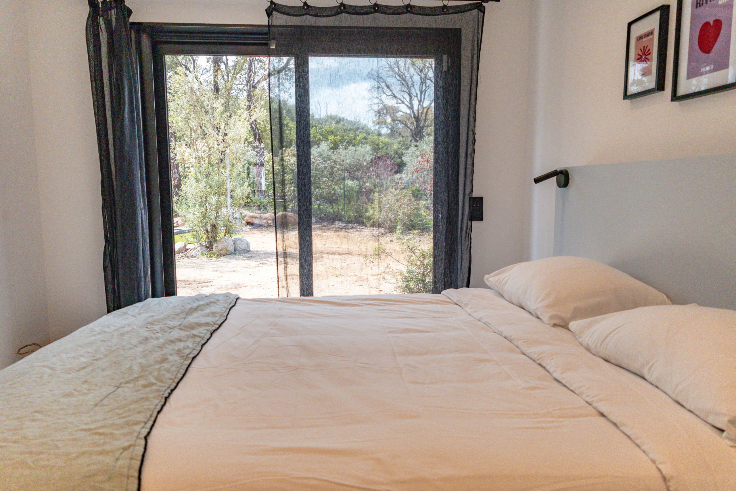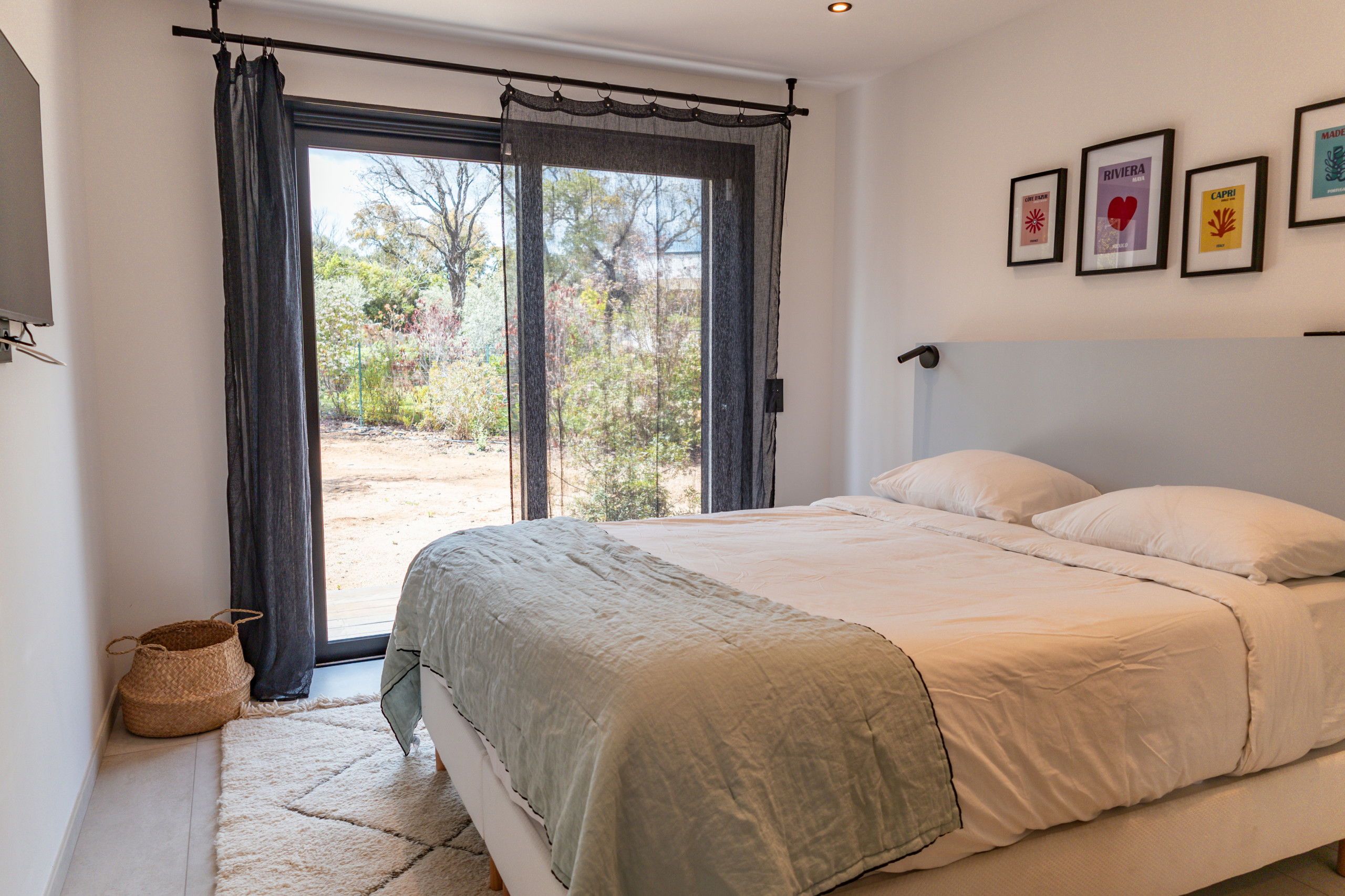 Bedroom 2: Queen Size bed 160 * 200 with storage, TV and garden access.