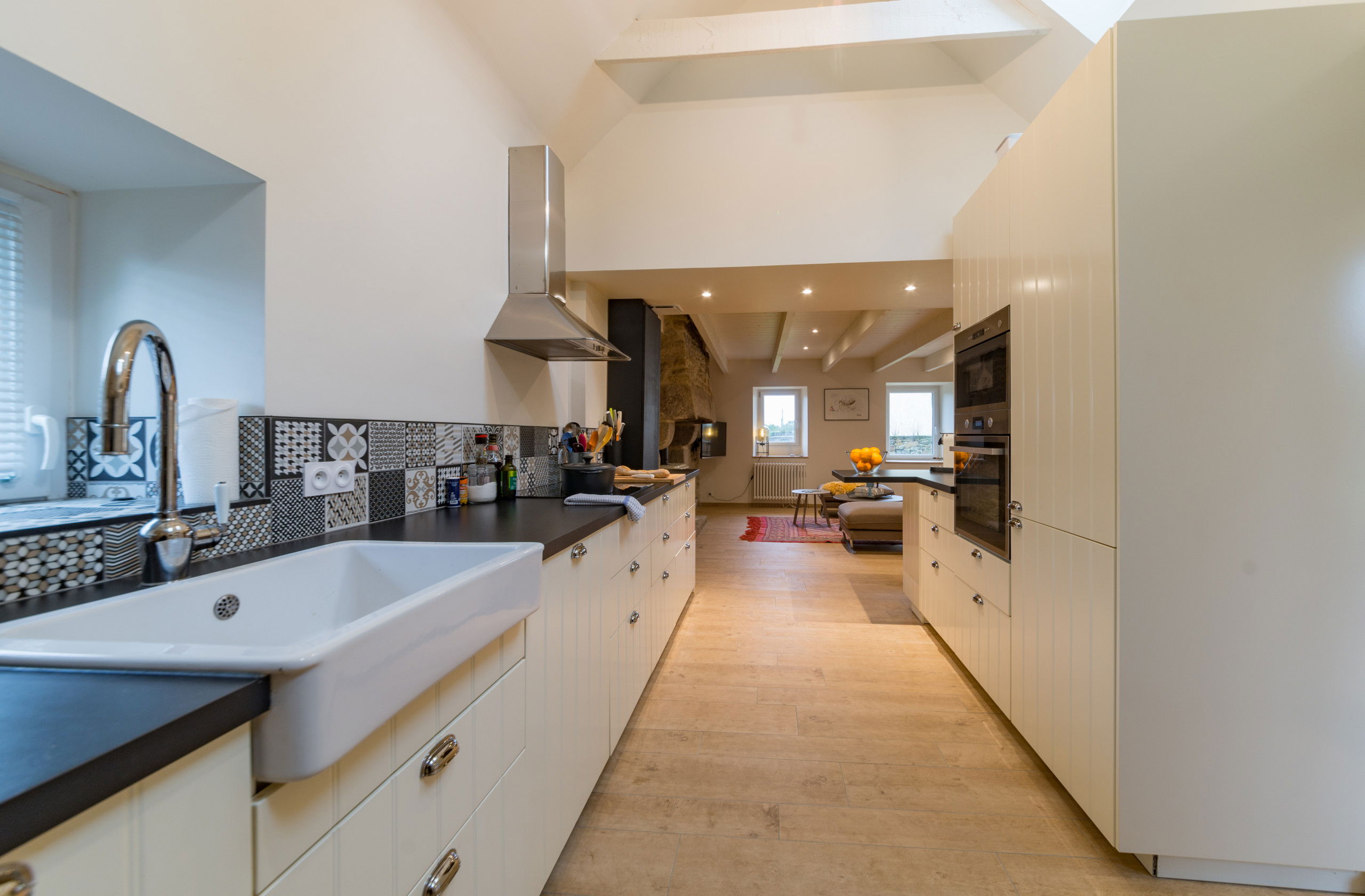 Upon entering the house, you arrive in the entrance hall that leads to the different rooms on the ground floor. This entrance sets the tone for the house: a mix of modernity and old-world charm. You then access the large living area with its old stones around the stove, wooden beams, a comfortable lounge, and dining area. A lovely kitchen full of charm is also open to this living room, where you will find everything necessary to cook in all seasons. From the kitchen, you can again access the entrance hall, which also serves an independent WC and a utility room with a sink and a washer-dryer.