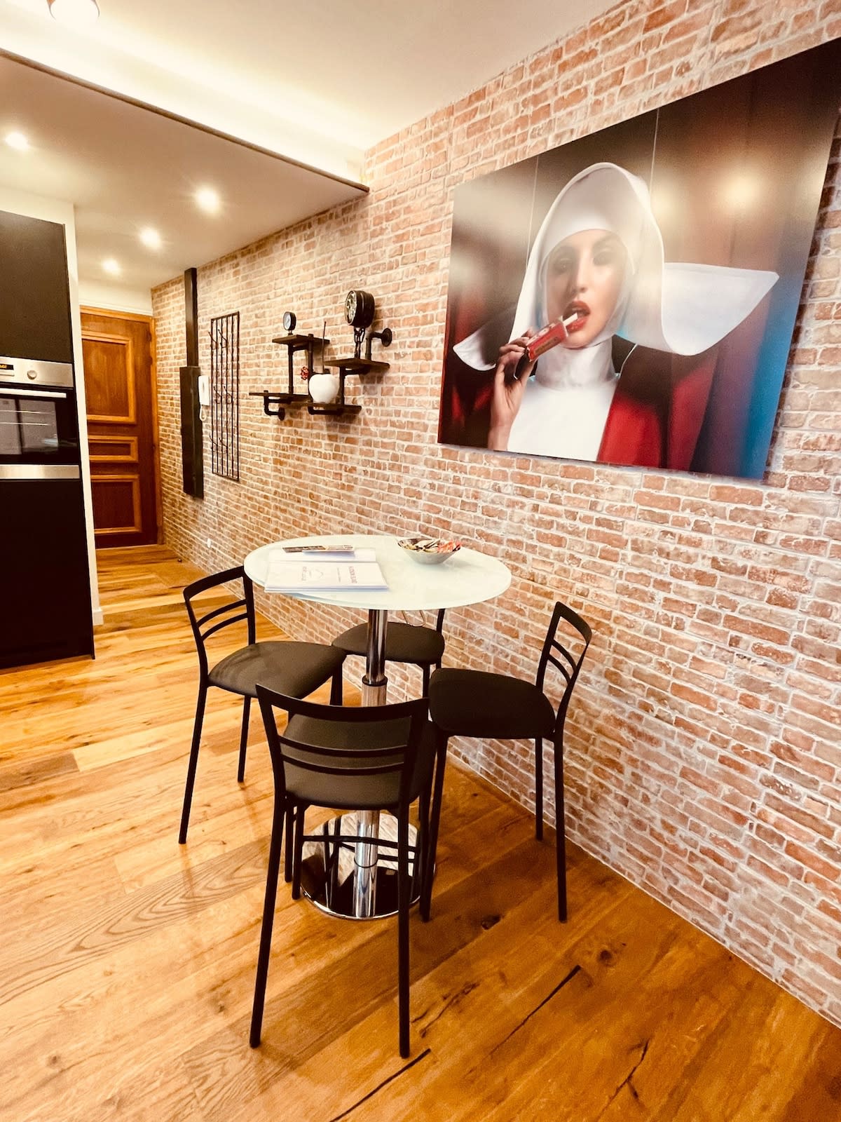 Cet appartement peut accueillir 4 personnes, avec sa chambre double et son canapé convertible. Il donne sur une cour intérieure, très calme, alors qu'il est situé en pleine rue commerçante et animée de la ville.
