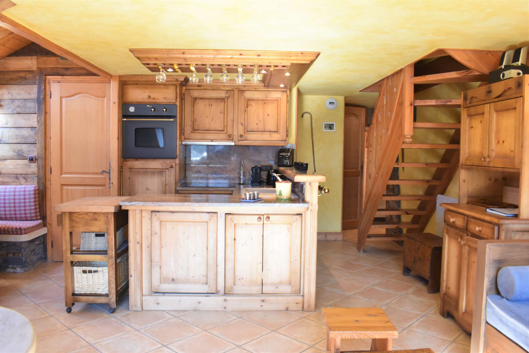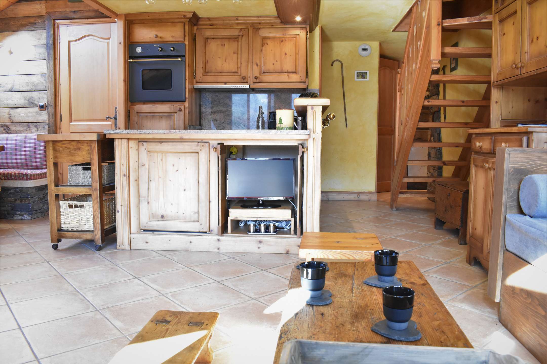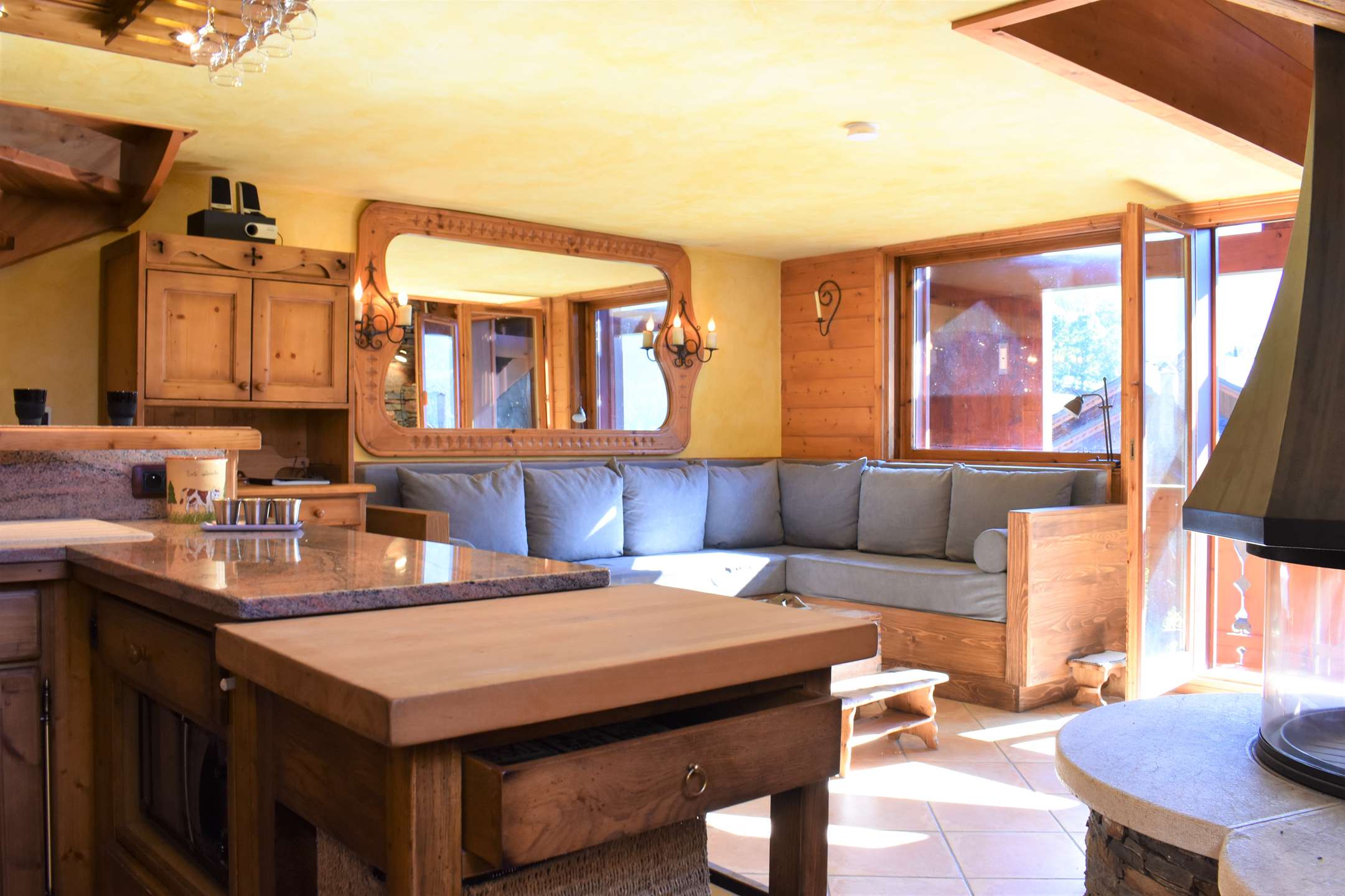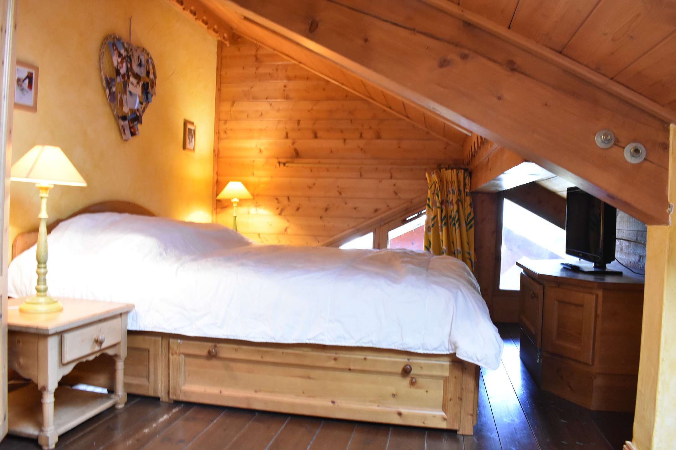 This rental consists of an entrance with an independent toilet with sink and an independent bathroom with double sinks and spa shower, a very pleasant and spacious living room with a kitchen open to the living room with a corner friendly dining and a living room with a corner sofa, a fireplace and a television. It opens onto a south-facing loggia balcony offering you a lovely view of the mountains, the Lapin slope and the village. The kitchen is equipped with 4 induction burners, an extractor hood, a traditional oven, a microwave, a dishwasher, a refrigerator, a washer-dryer, a Nexpresso coffee maker, kettle and toaster. It has a bedroom on the ground floor of the apartment with 1 160 cm double bed and 1 bedroom on the very sloping floor with 1 160 cm double bed, a television, an office area and an adjoining bathroom. with jacuzzi bath, double sinks and toilet.
