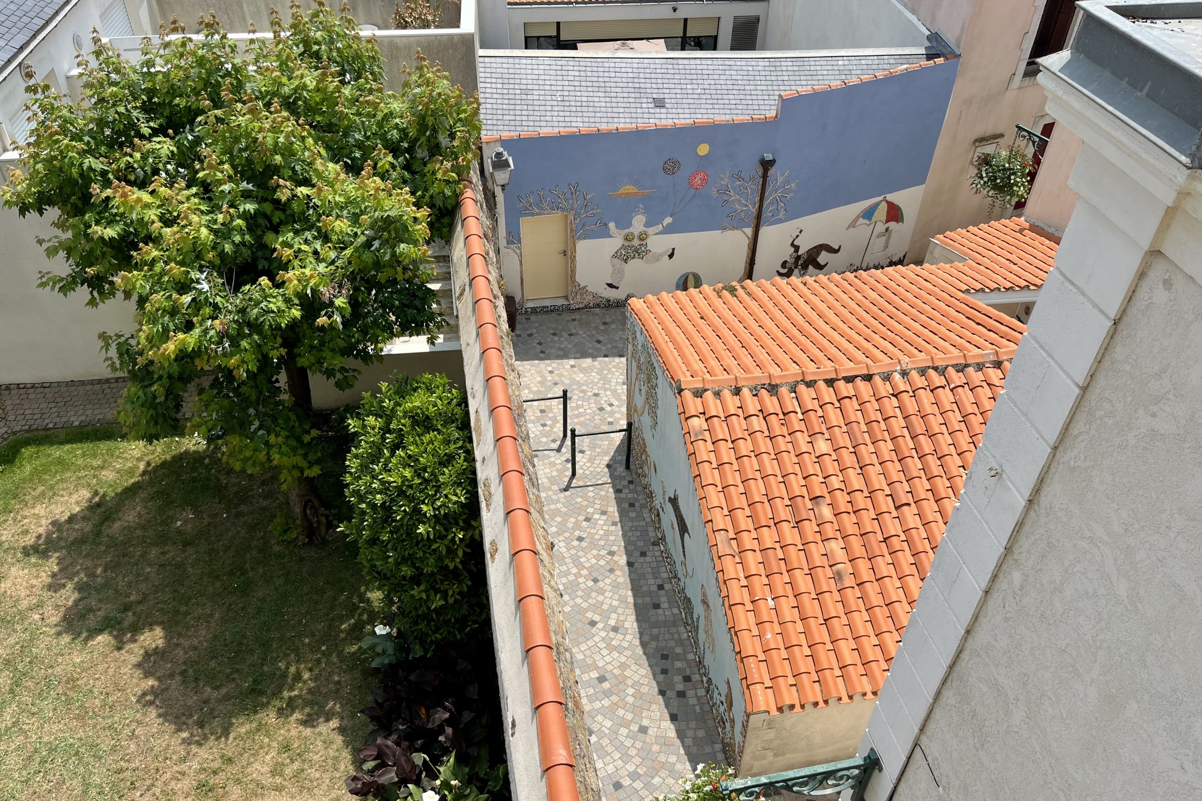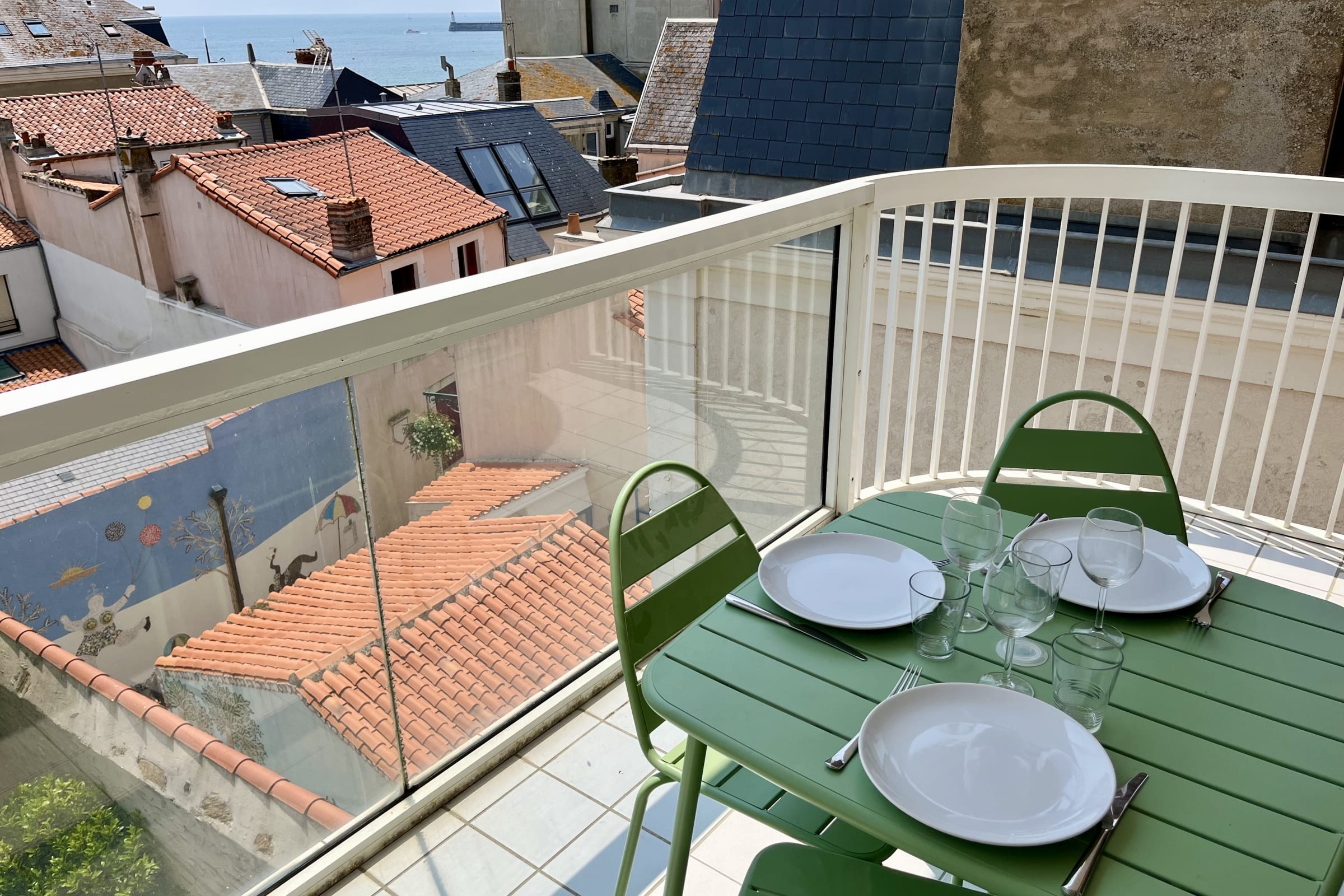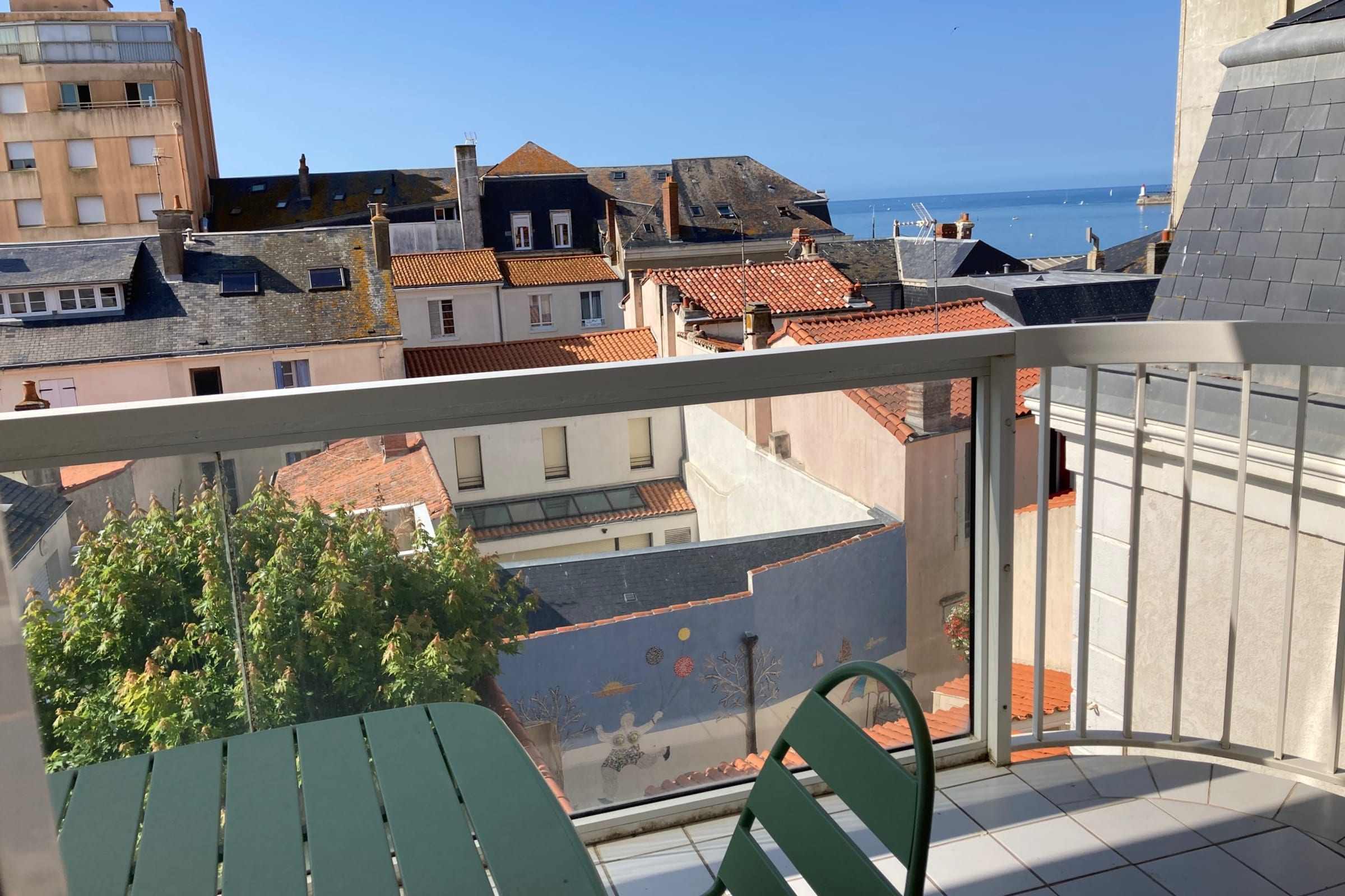 Depuis le balcon, vous pourrez vous détendre ou déjeuner face à une vue sur les ruelles du Quartier de l'Ile Penotte, d'un jardin commun à l'immeuble et même y apercevoir la mer.