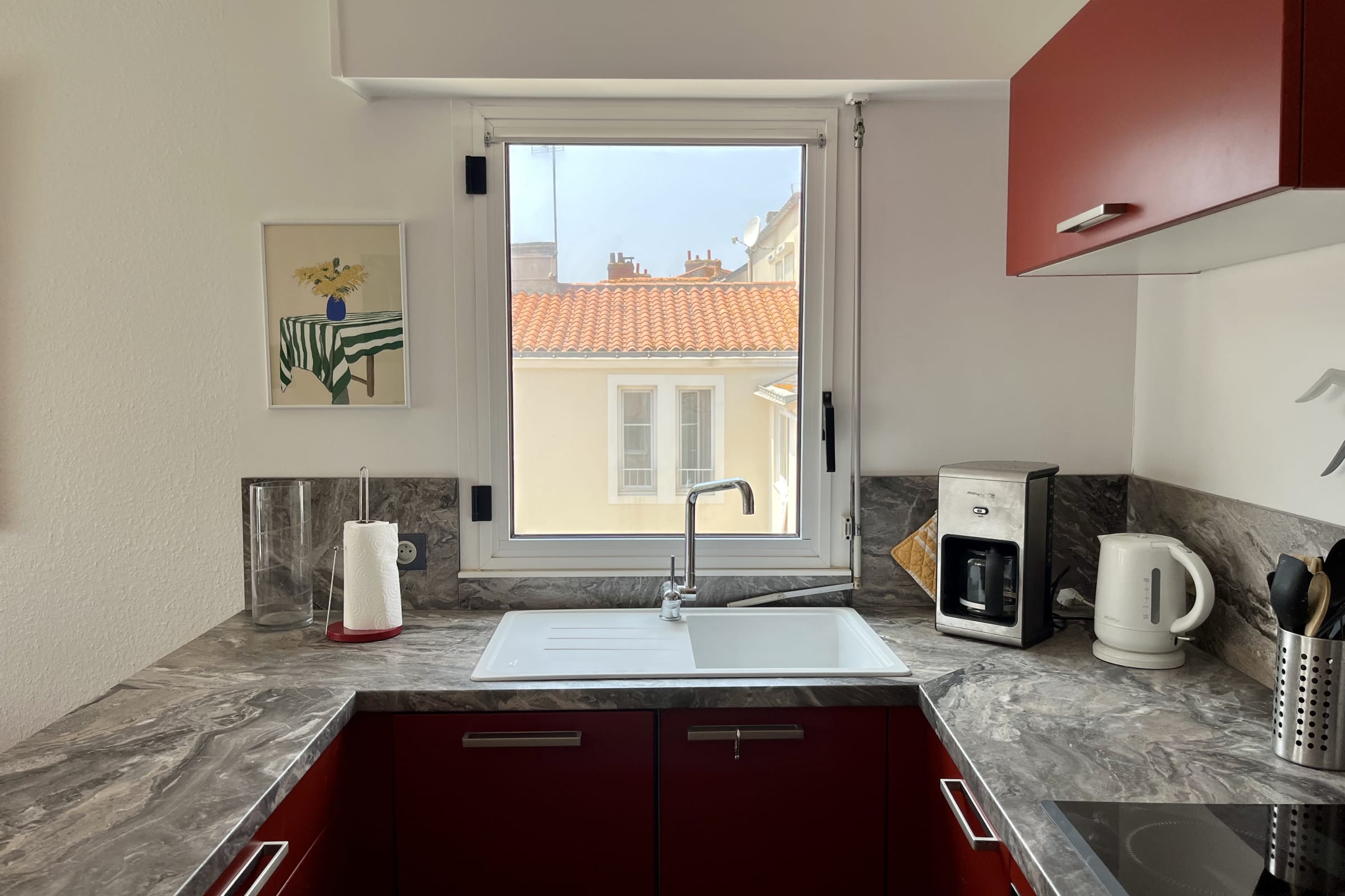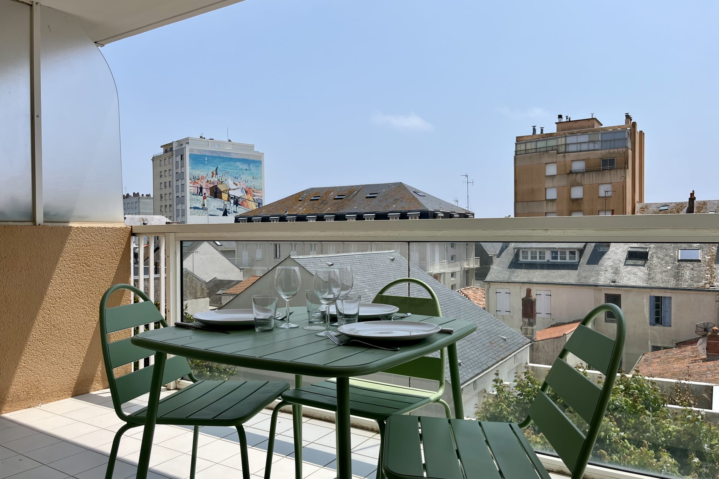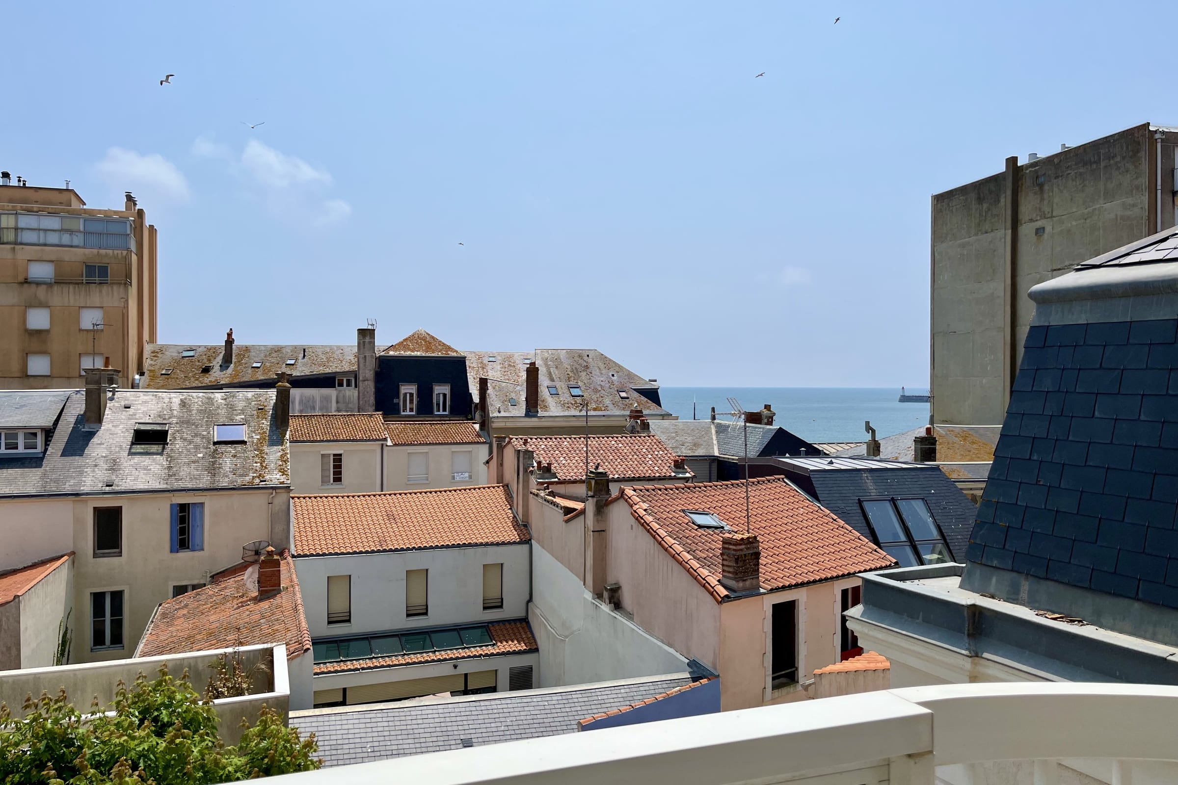 Depuis le balcon, vous pourrez vous détendre ou déjeuner face à une vue sur les ruelles du Quartier de l'Ile Penotte, d'un jardin commun à l'immeuble et même y apercevoir la mer.