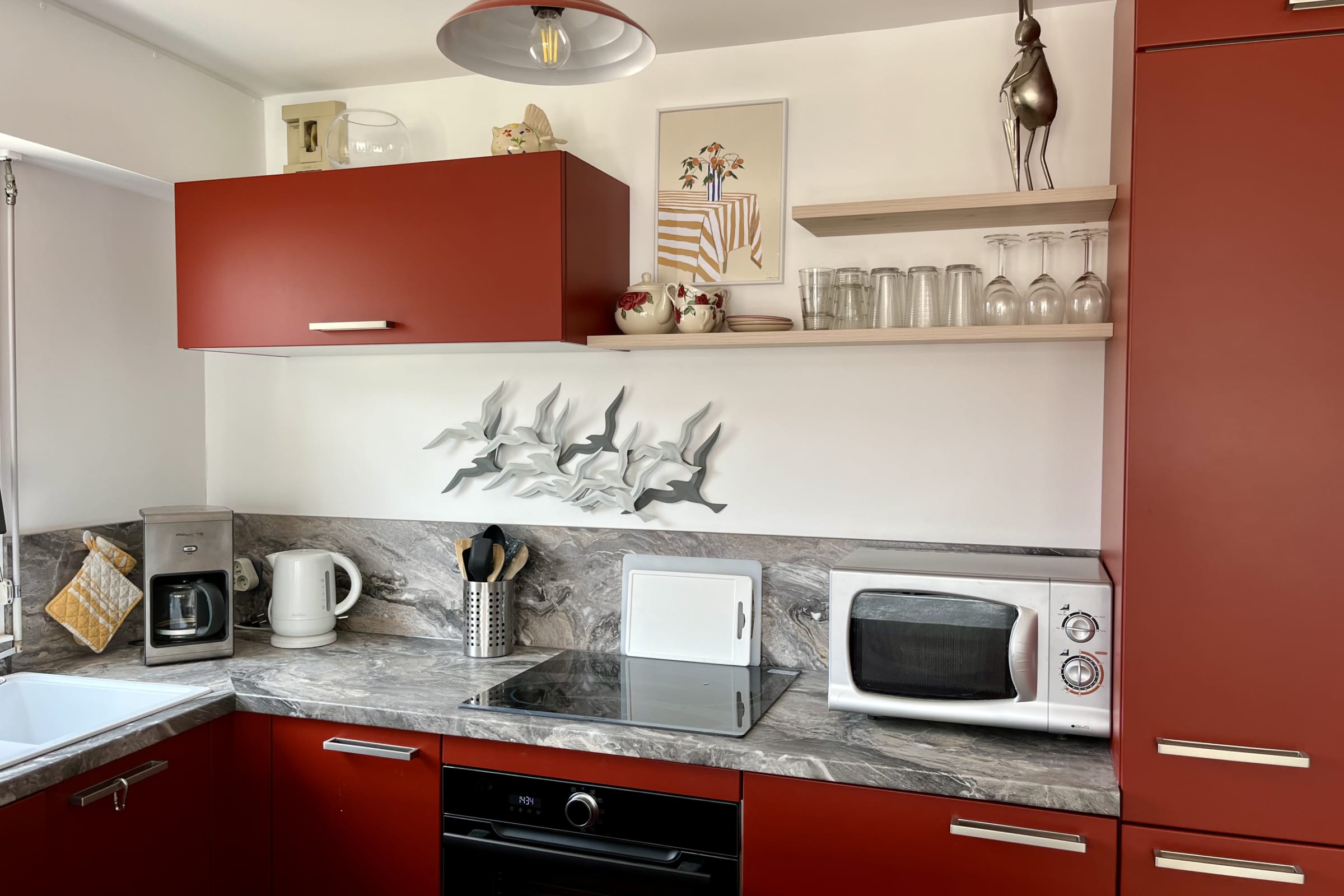 Il se compose d'une cuisine aménagée et équipée d'un four, micro-ondes, lave-vaisselle, d'un réfrigérateur-congélateur et d'une cafetière à filtre.