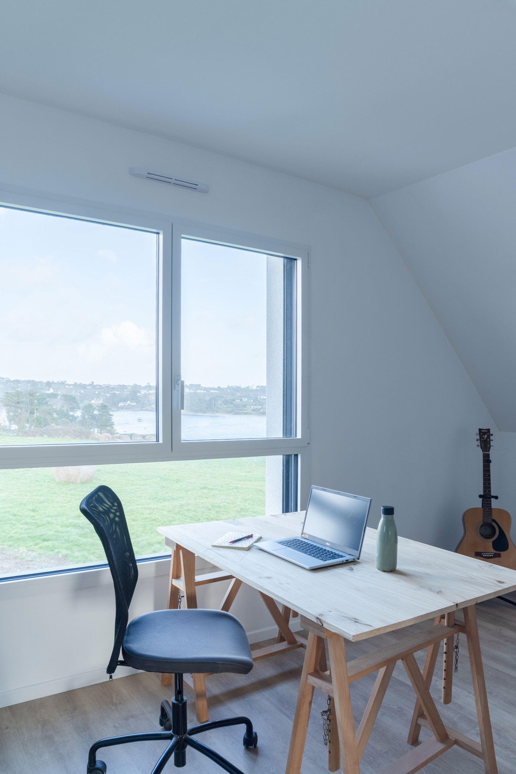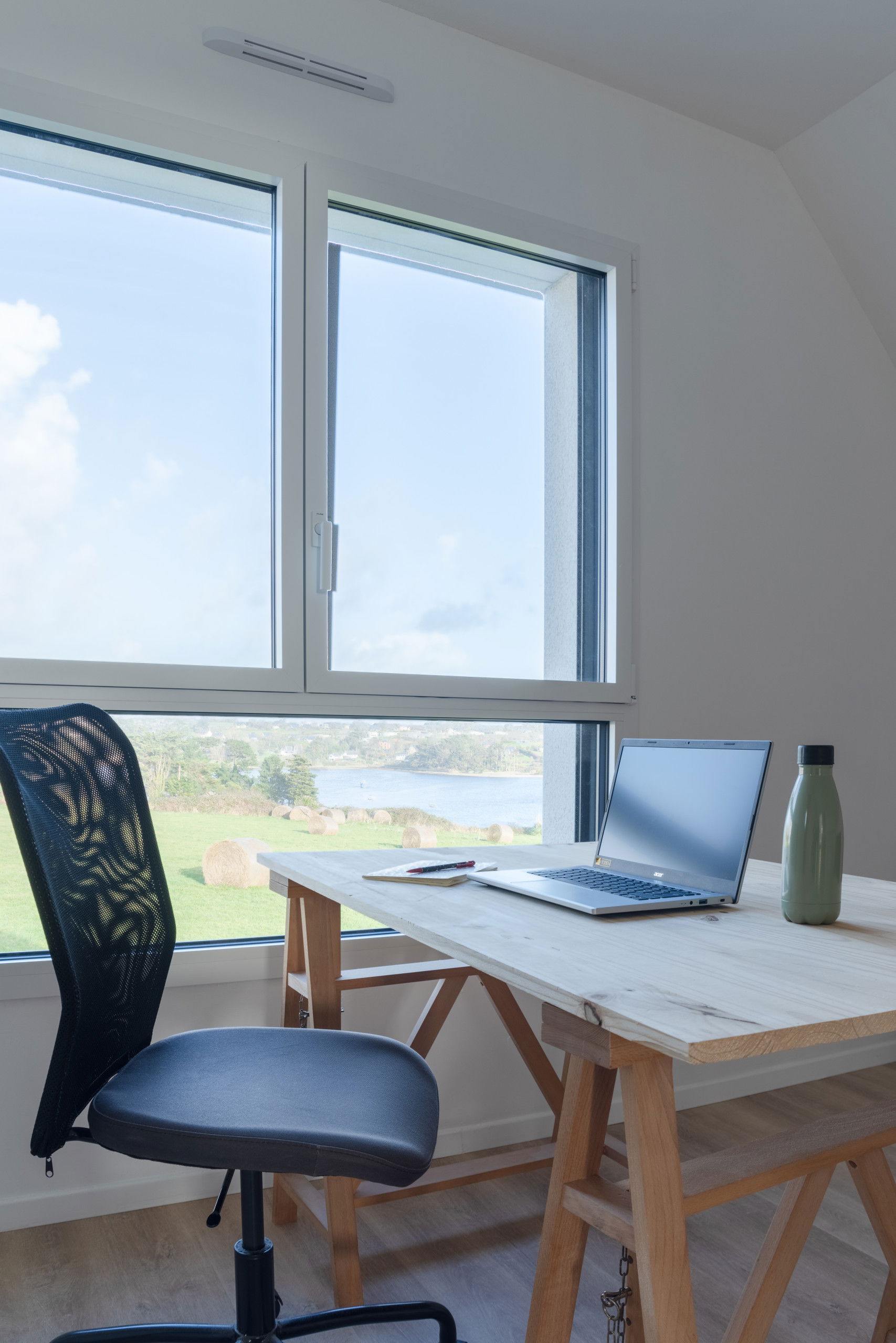 It features a welcoming living room with its charming view of the Aber Benoit, perfect for relaxing after a sunny day on the beach. The fully equipped kitchen opens onto the living room, allowing you to prepare delicious meals to enjoy together.