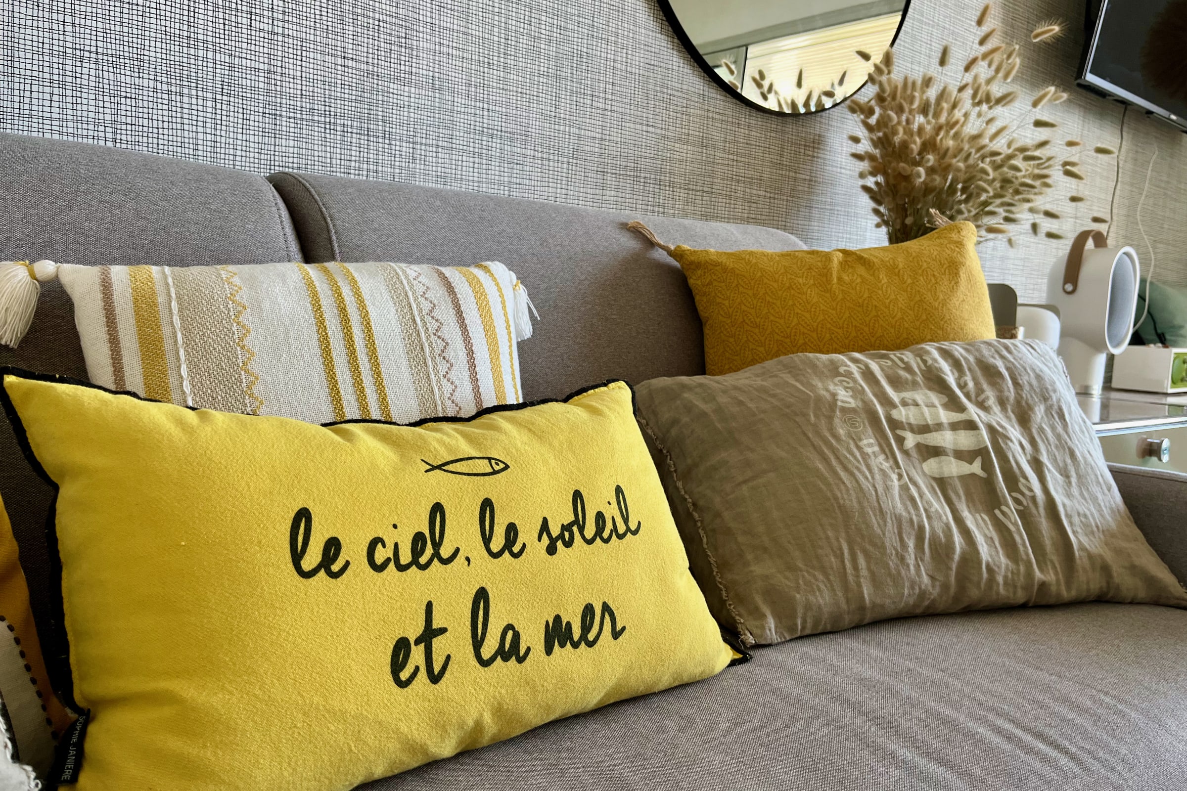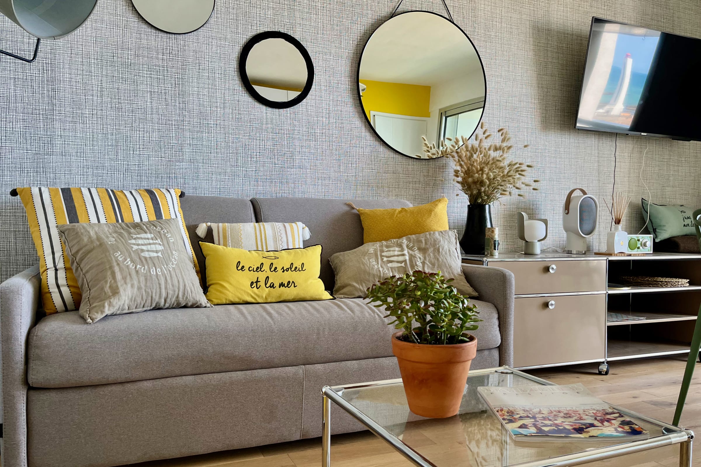 Vous trouverez dans la pièce de vie un canapé confortable et convertible en 140x190, une grande TV amovible et une enceinte bluetooth.