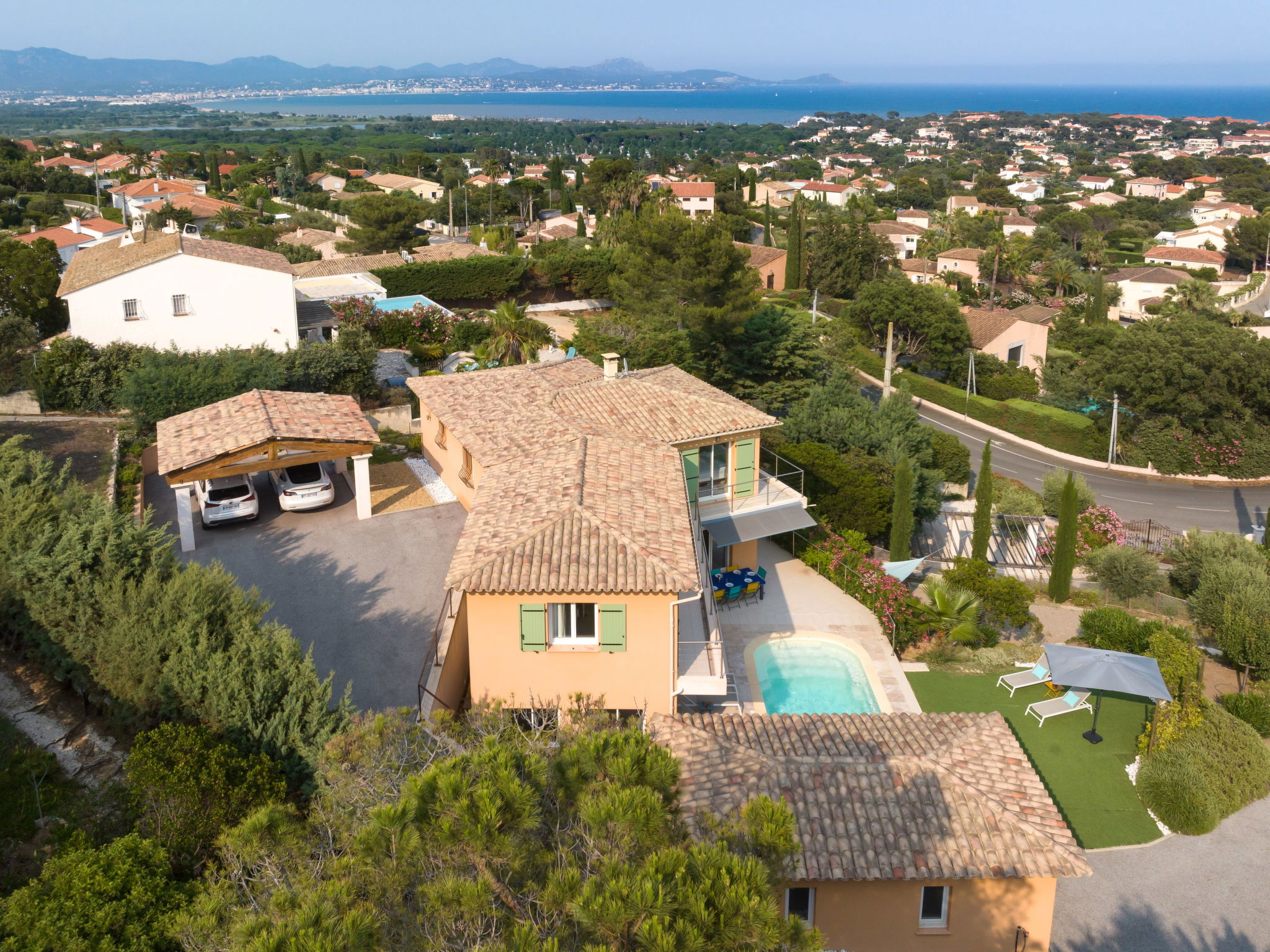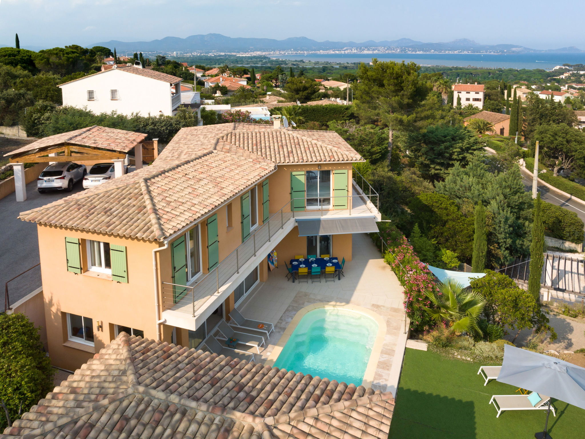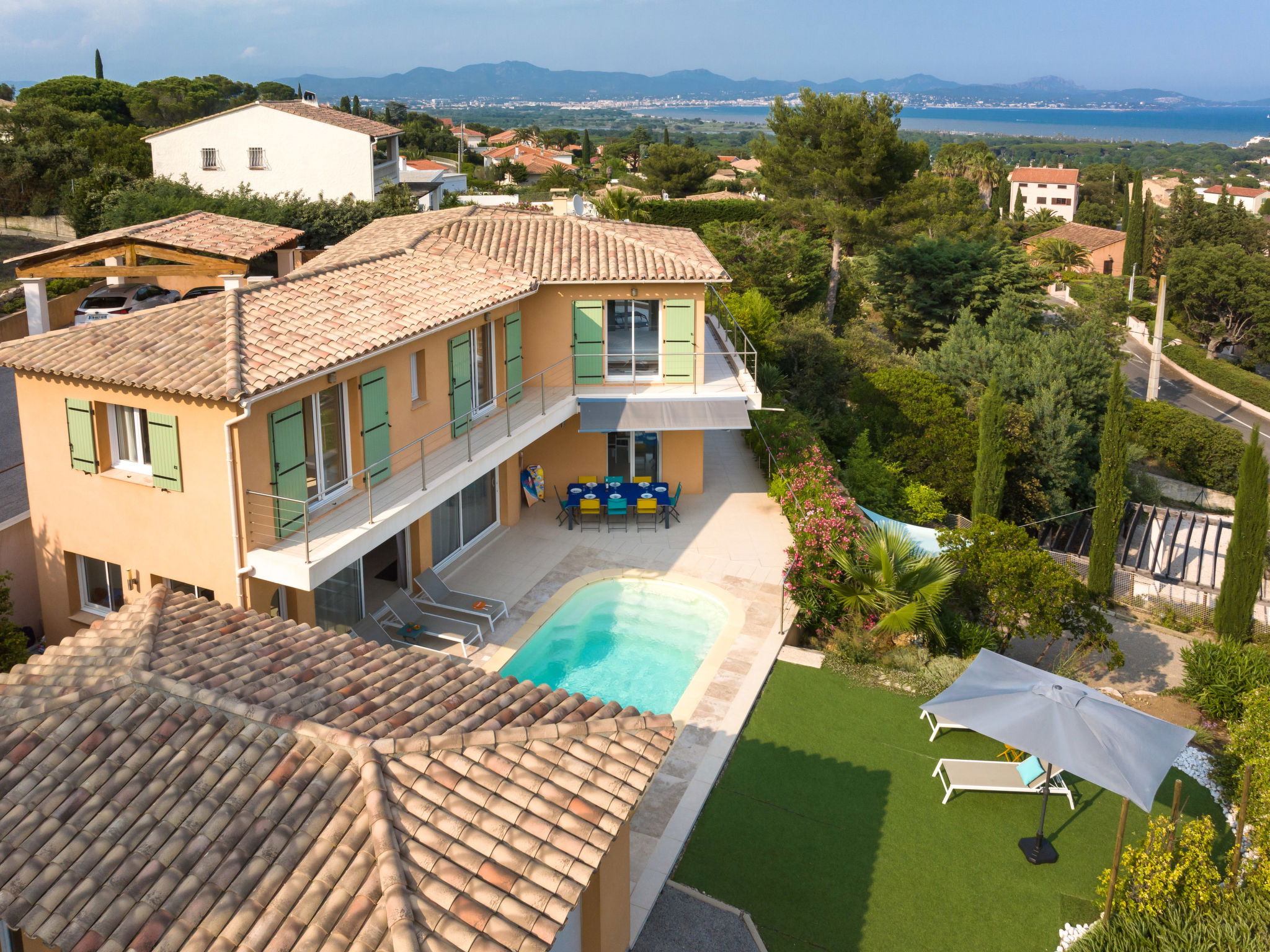 1.5 km from the centre of Saint Aygulf, 9 km from the centre of Fréjus, 47 km from the centre of Cannes, on a slope, in the residential district, 2 km from the sea. Private: property 1'700 m2 (fenced), wildlife garden, swimming pool (6 x 3 m, depth 150 cm, seasonal availability: 01.Apr. - 30.Oct.) with shutter cover and salt-electrolysis pool-cleaning system. Outdoor shower, boules, terrace (30 m2), garden furniture. In the house: billiard table. Steep motor access. Roofed, parking (for 2 cars) on the premises. Shop 1.5 km, sandy beach "Plage de la Galiote" 2.5 km.