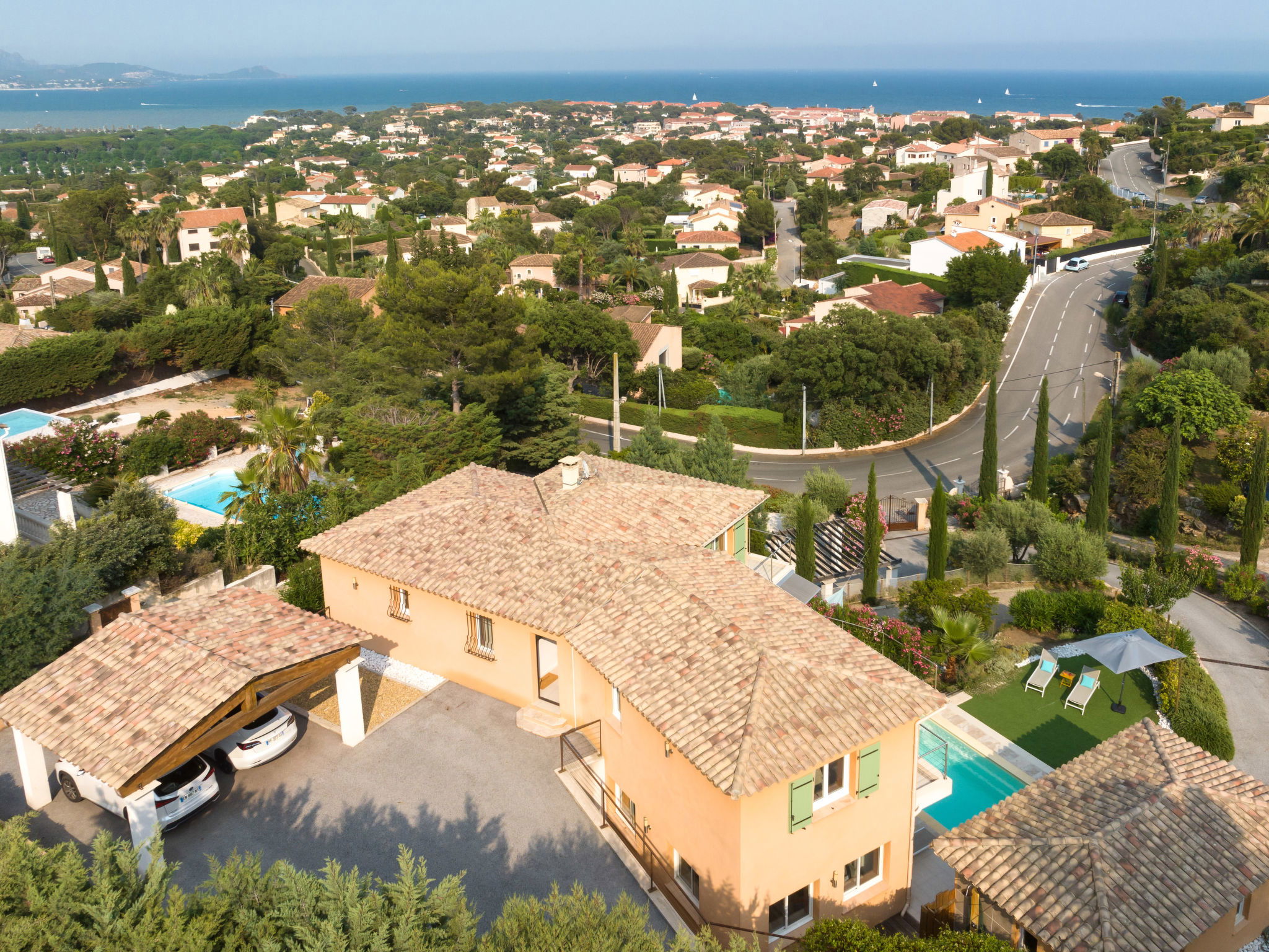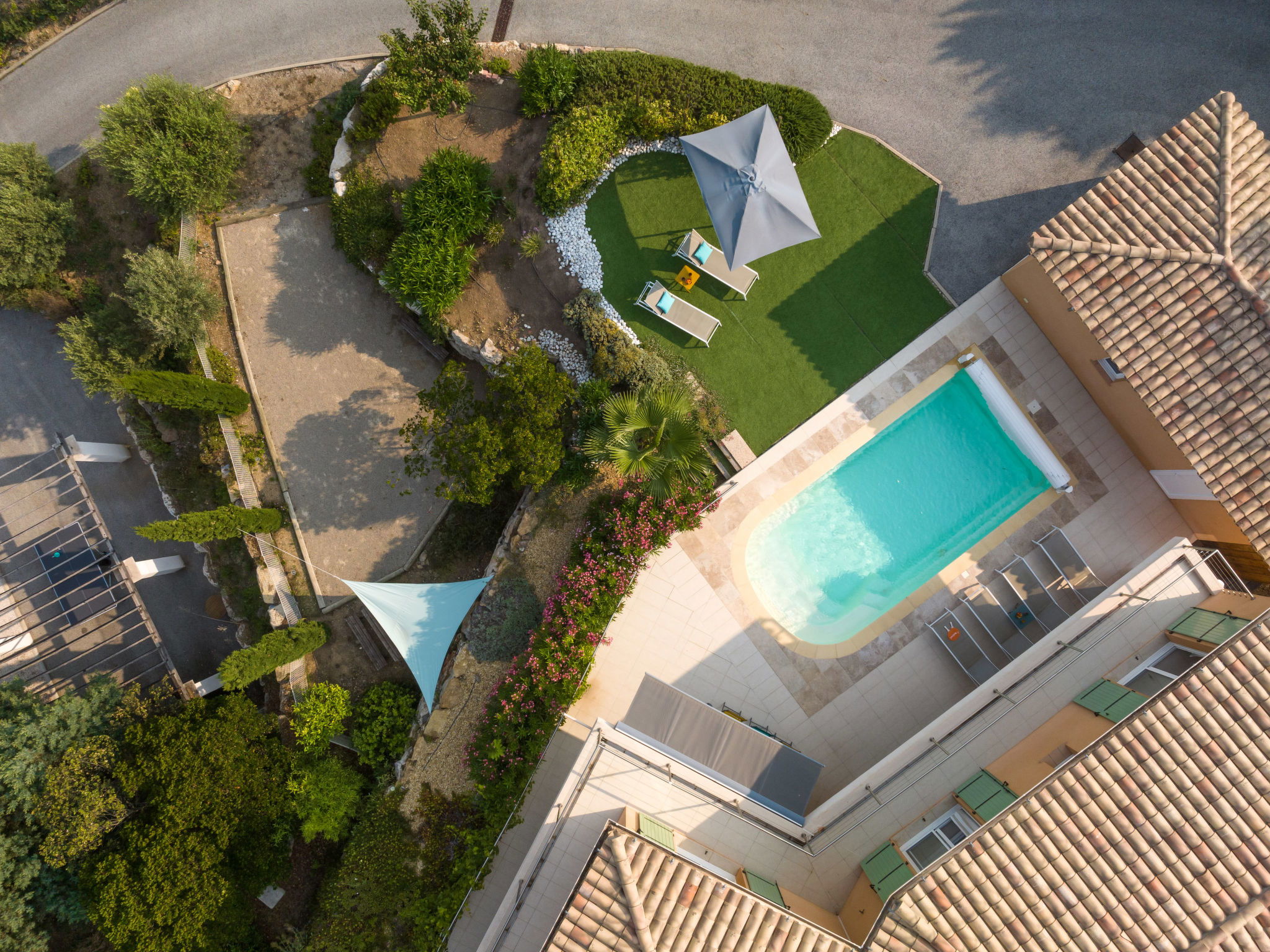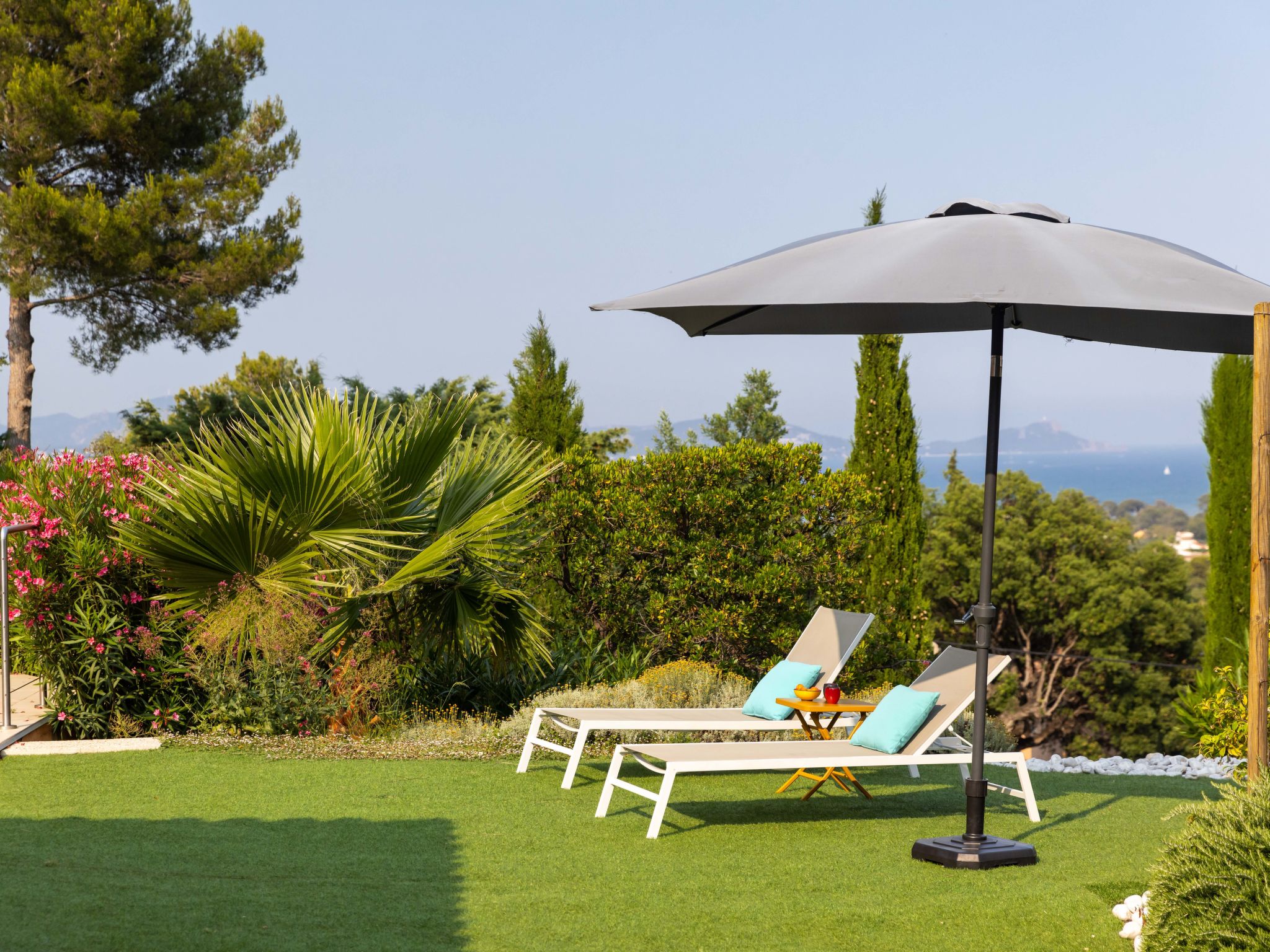 1.5 km from the centre of Saint Aygulf, 9 km from the centre of Fréjus, 47 km from the centre of Cannes, on a slope, in the residential district, 2 km from the sea. Private: property 1'700 m2 (fenced), wildlife garden, swimming pool (6 x 3 m, depth 150 cm, seasonal availability: 01.Apr. - 30.Oct.) with shutter cover and salt-electrolysis pool-cleaning system. Outdoor shower, boules, terrace (30 m2), garden furniture. In the house: billiard table. Steep motor access. Roofed, parking (for 2 cars) on the premises. Shop 1.5 km, sandy beach "Plage de la Galiote" 2.5 km.