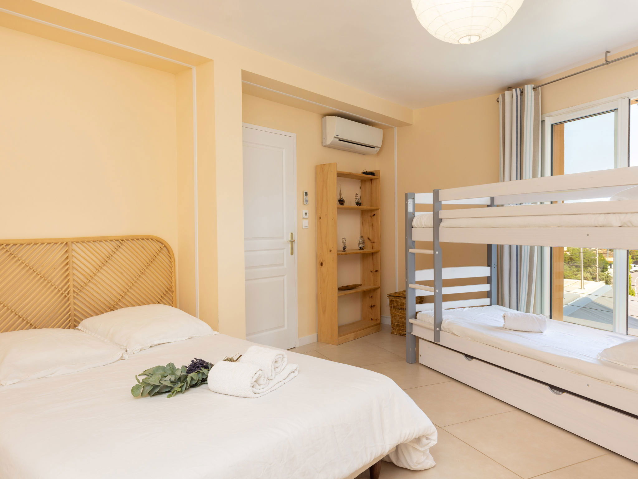 1 children's room with 1 x 2 bunk beds (90 cm, length 190 cm), 1 french bed (140 cm, length 190 cm), shower and air conditioning.