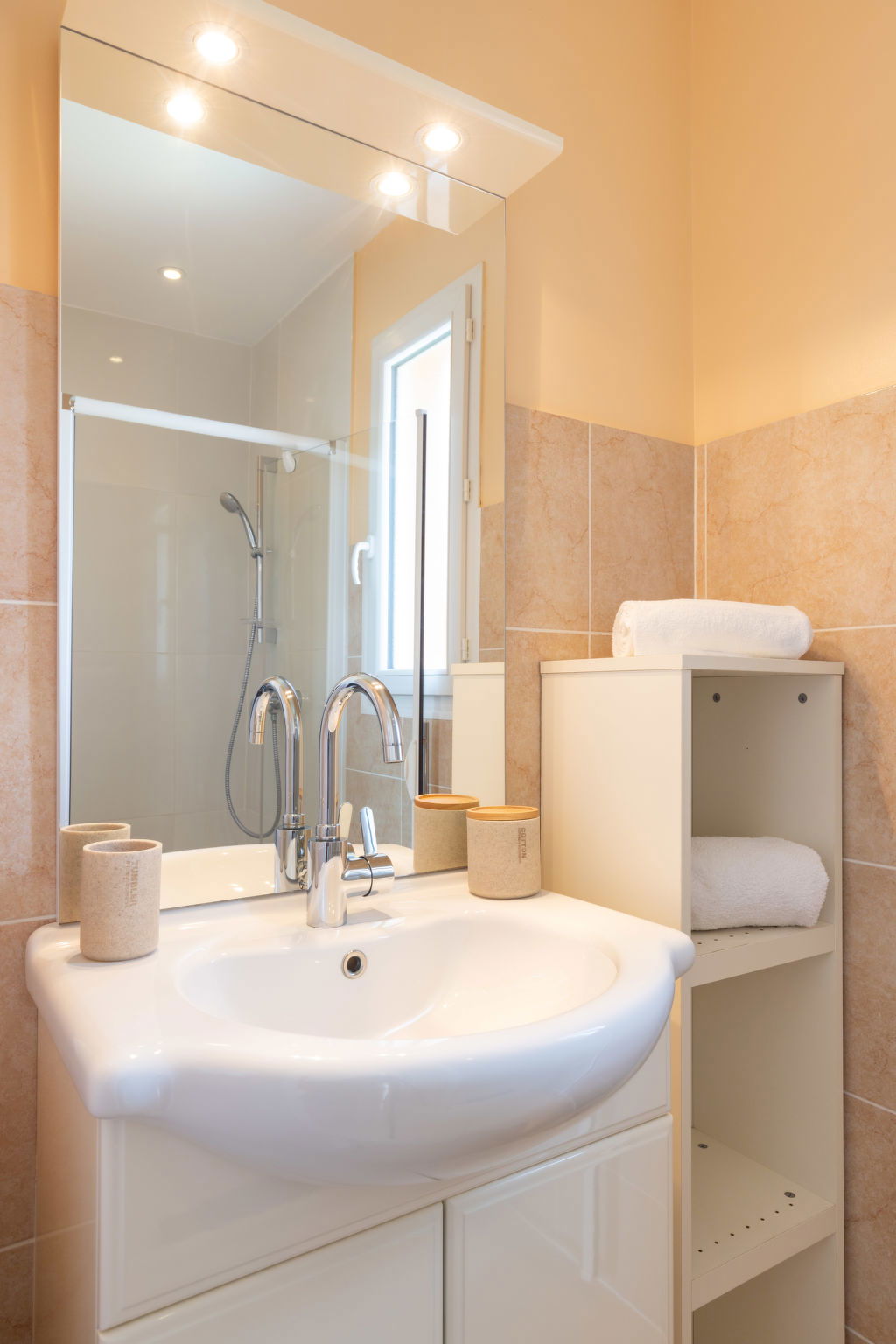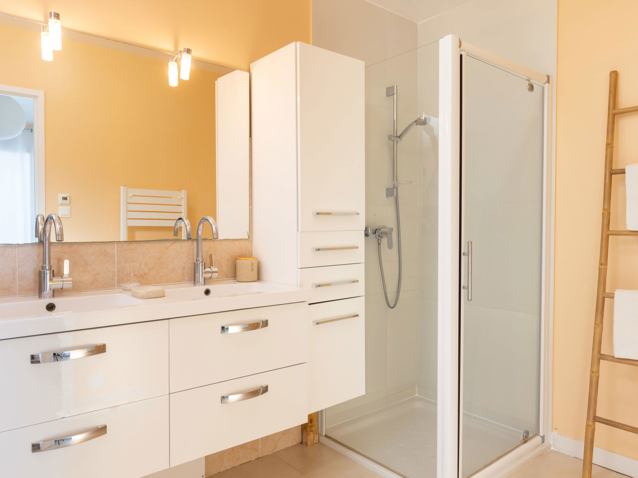 1 room with 1 french bed (160 cm, length 200 cm), shower/WC, double hand-basin and air conditioning. Exit to the balcony.