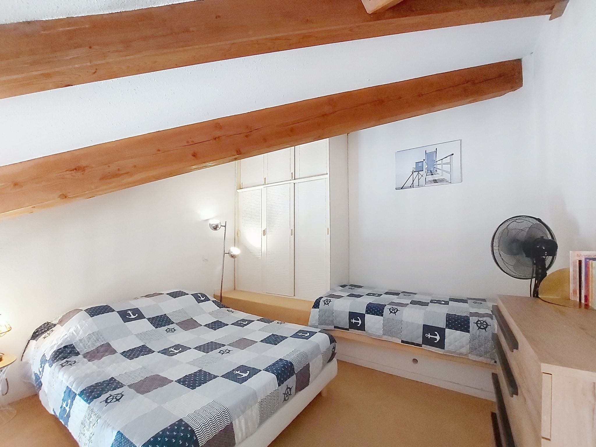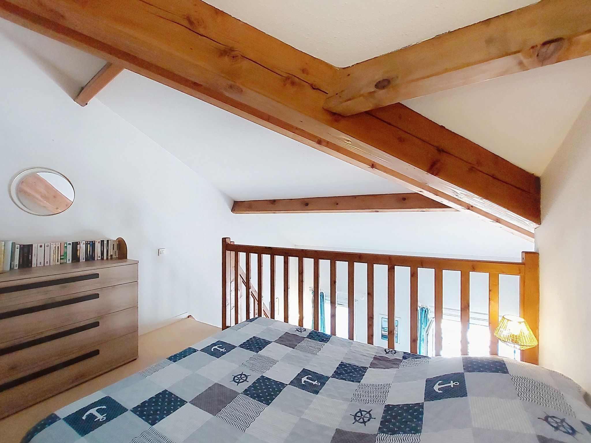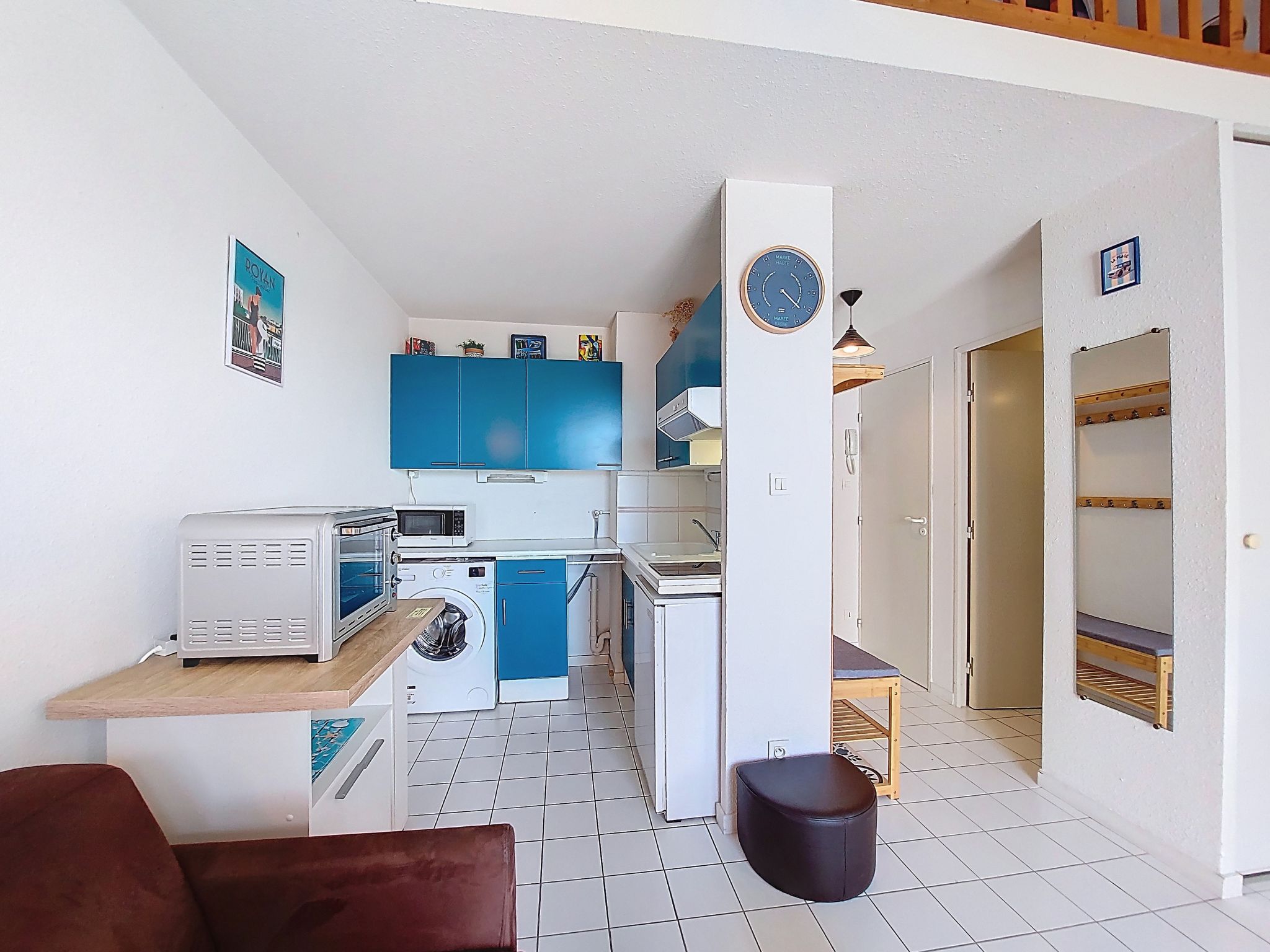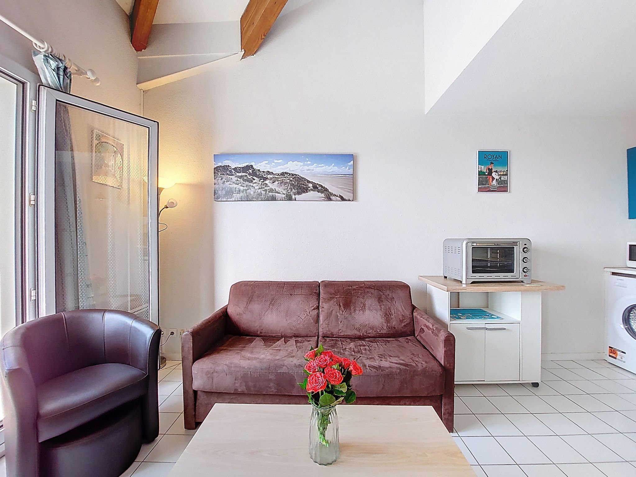 1-room studio 32 m2 on 2 levels on 4th floor, south-west facing position. Living room with 1 double sofabed (1 x 140 cm, length 190 cm), TV (flat screen). Exit to the balcony. Kitchenette (2 hot plates, oven, microwave, electric coffee machine). Bathroom, sep. WC. Electric heating. Upper floor: (steep stair) gallery with 1 french bed (1 x 140 cm, length 190 cm). Balcony 5 m2, south facing position and west facing position. Balcony furniture. Facilities: washing machine, hair dryer. Internet (WiFi, extra). Please note: not suitable for small children. Non-smokers only. Smoke alarm. Accomodation not suitable for young children : There is no safety barrier for the stairs. Instead of an enclosed bedroom, some sleeping areas are located in an open-plan area (gallery, alcove, etc.). Offer by a private individual according to Art. 155, IV of CGI.