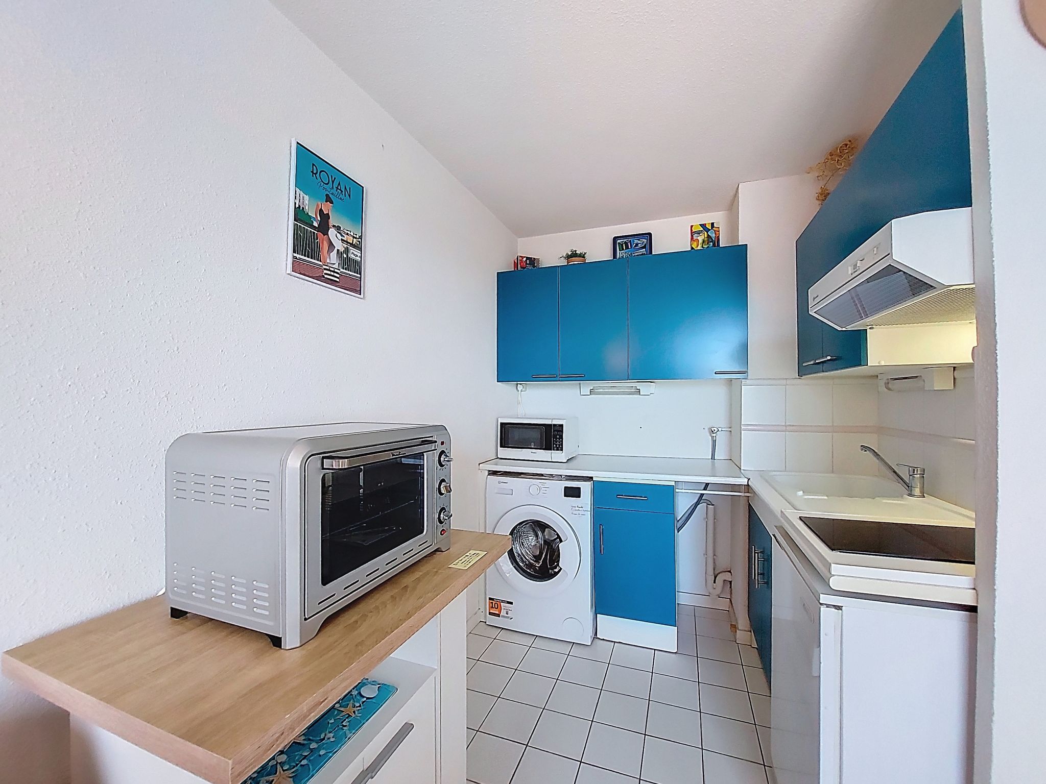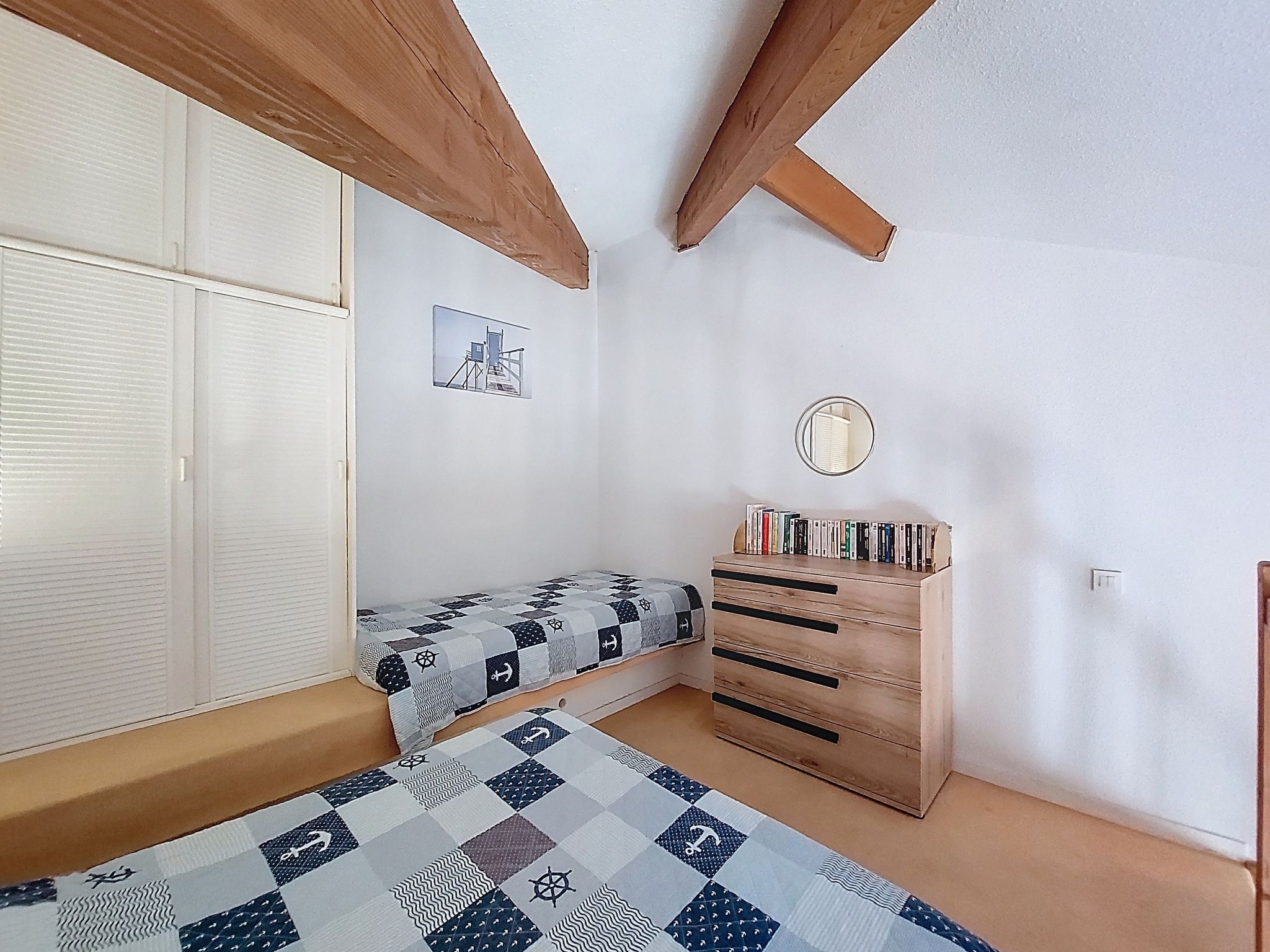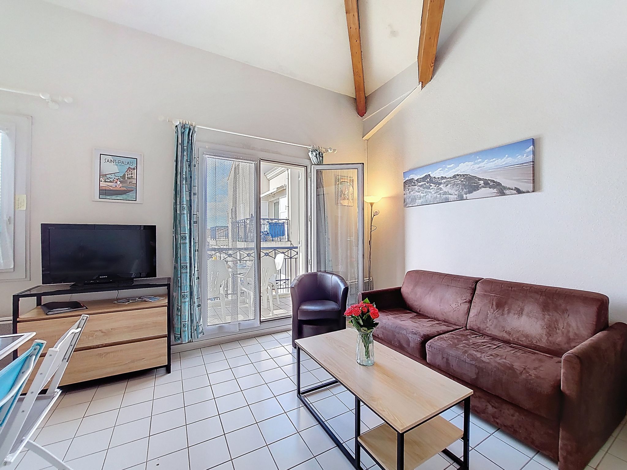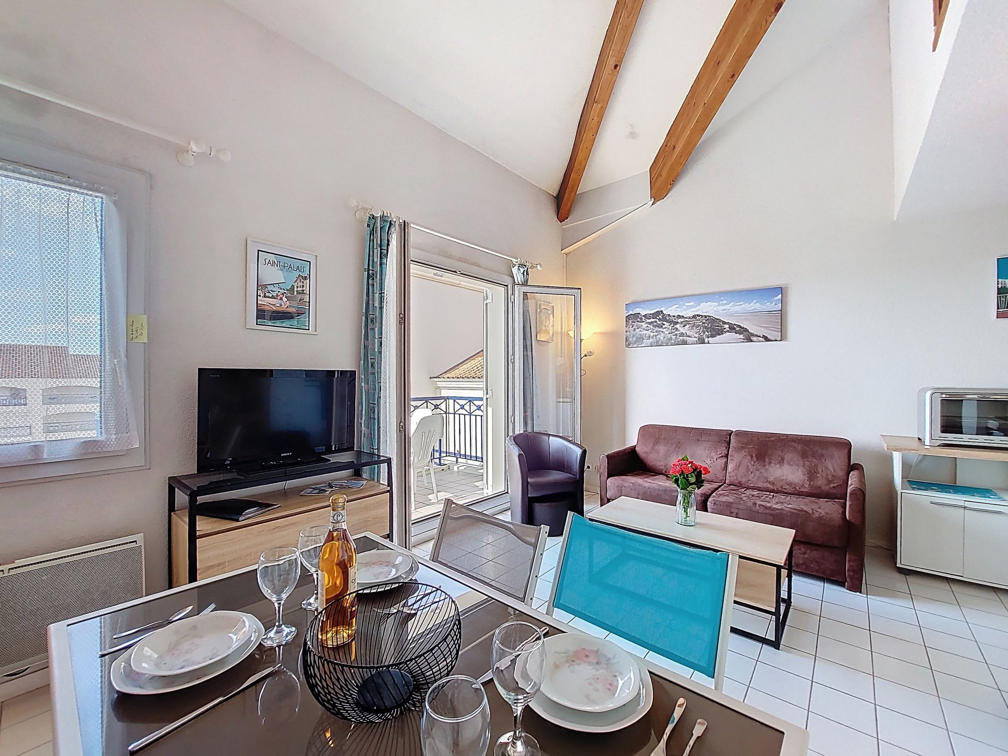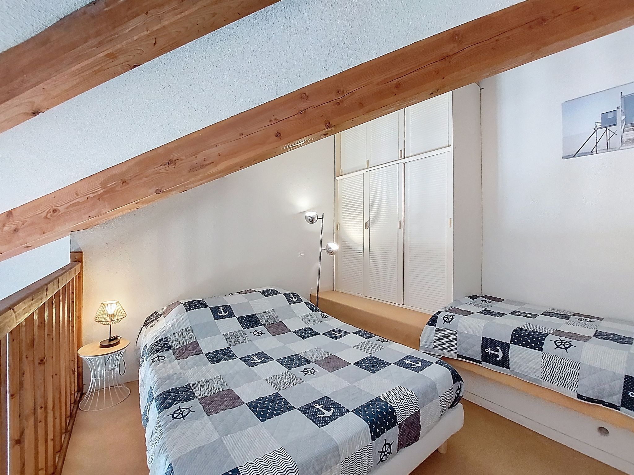 1-room studio 32 m2 on 2 levels on 4th floor, south-west facing position. Living room with 1 double sofabed (1 x 140 cm, length 190 cm), TV (flat screen). Exit to the balcony. Kitchenette (2 hot plates, oven, microwave, electric coffee machine). Bathroom, sep. WC. Electric heating. Upper floor: (steep stair) gallery with 1 french bed (1 x 140 cm, length 190 cm). Balcony 5 m2, south facing position and west facing position. Balcony furniture. Facilities: washing machine, hair dryer. Internet (WiFi, extra). Please note: not suitable for small children. Non-smokers only. Smoke alarm. Accomodation not suitable for young children : There is no safety barrier for the stairs. Instead of an enclosed bedroom, some sleeping areas are located in an open-plan area (gallery, alcove, etc.). Offer by a private individual according to Art. 155, IV of CGI.