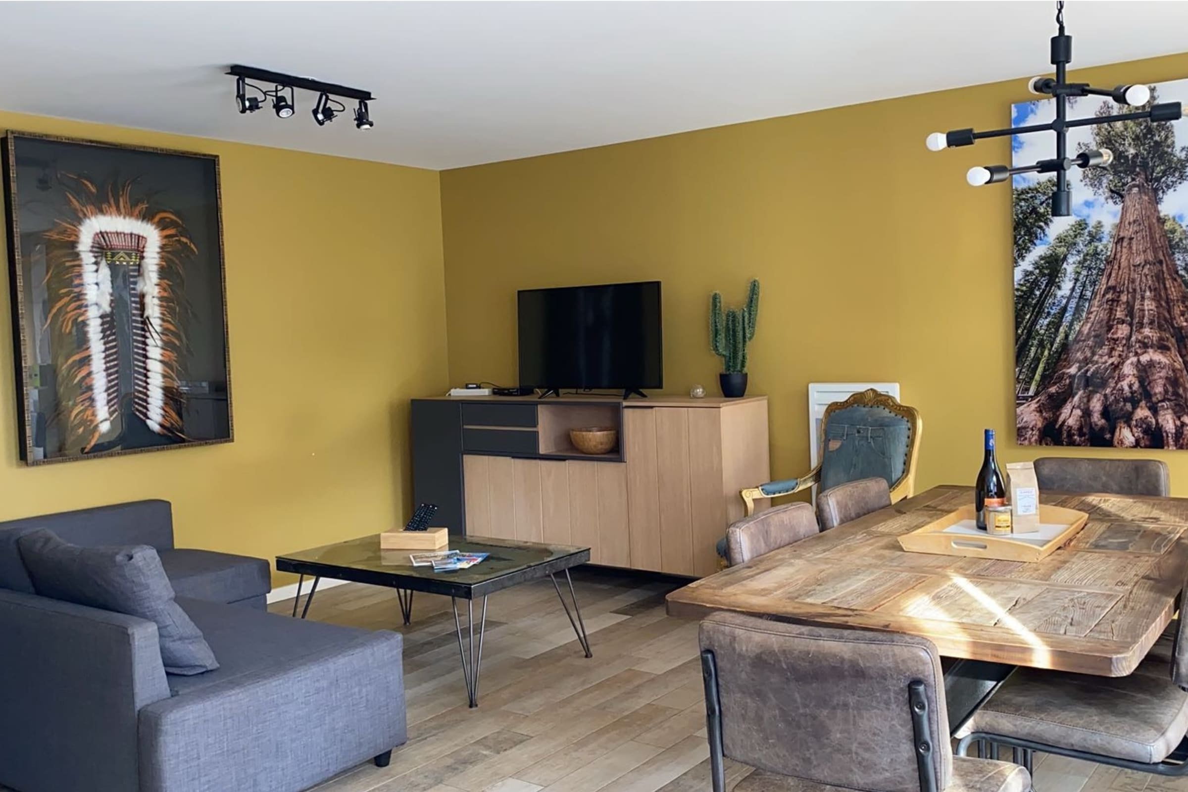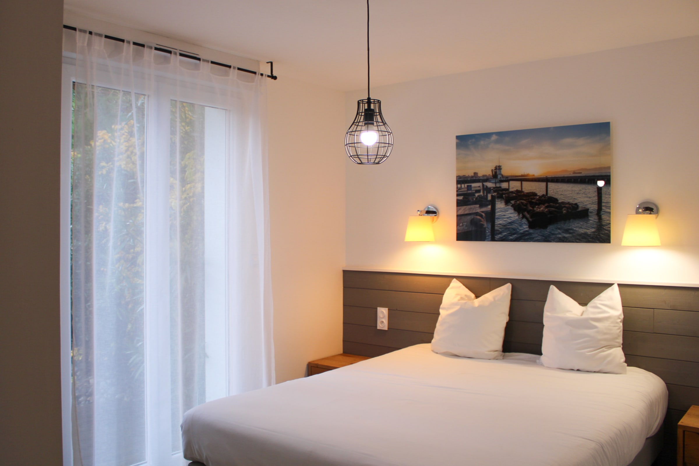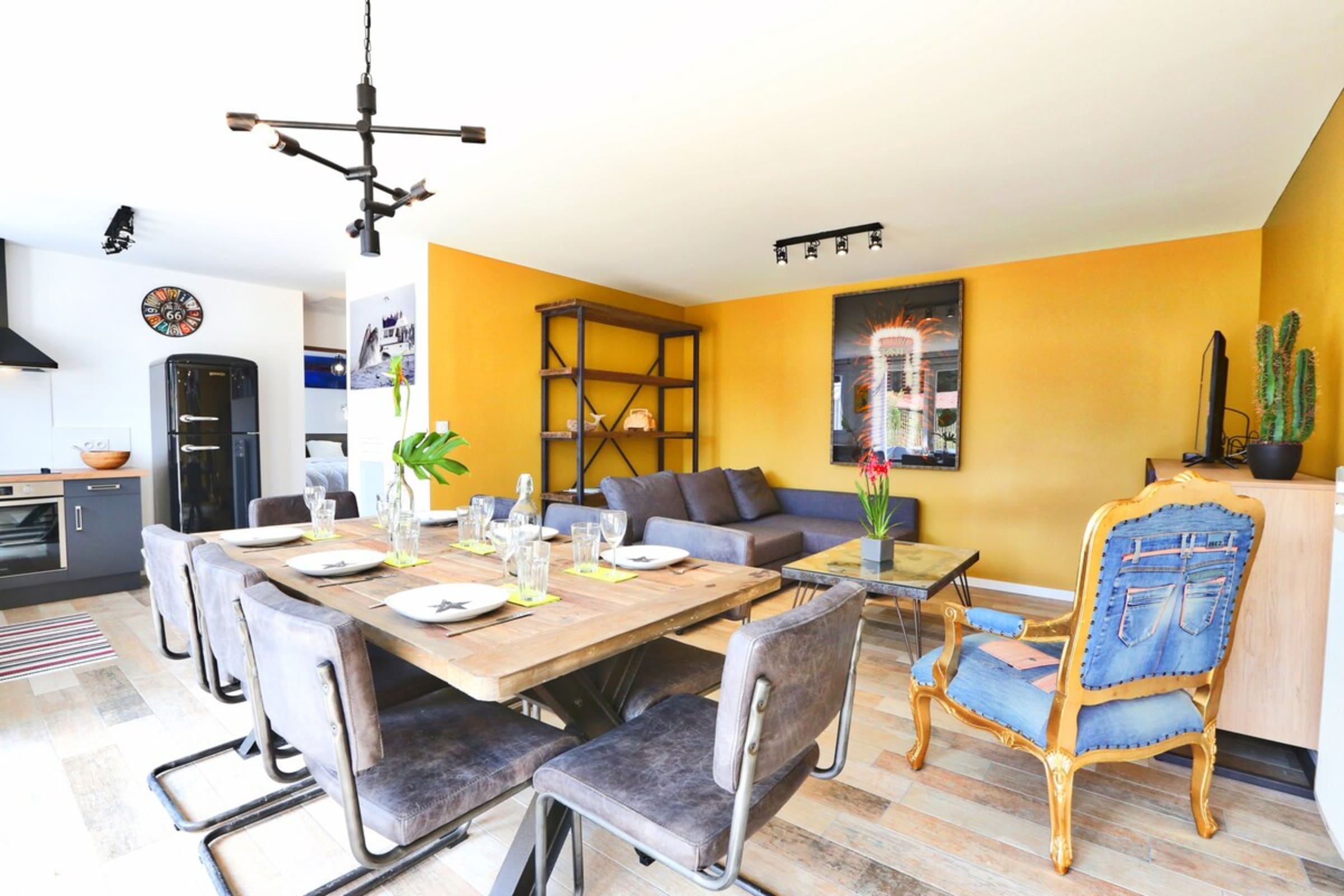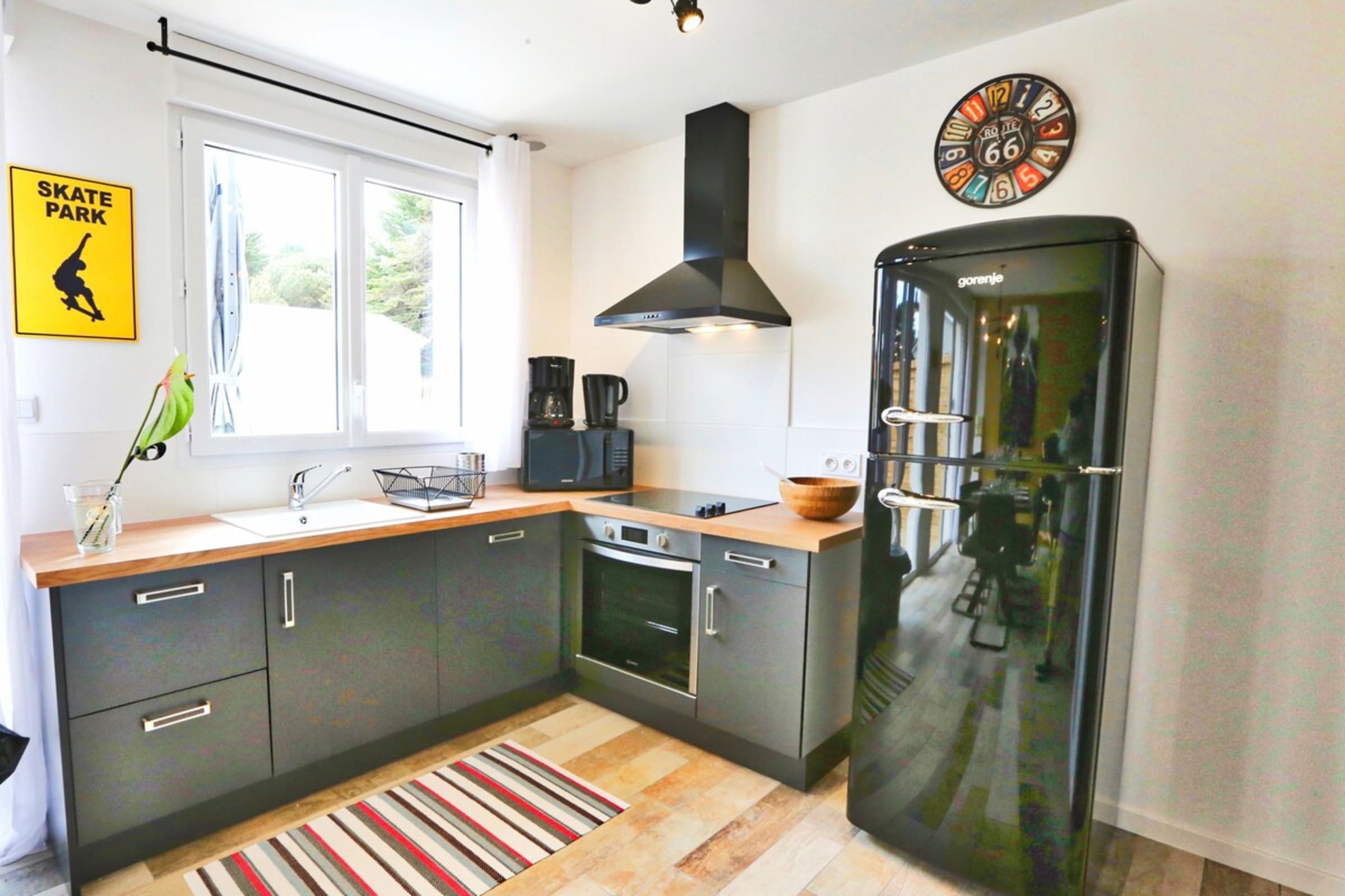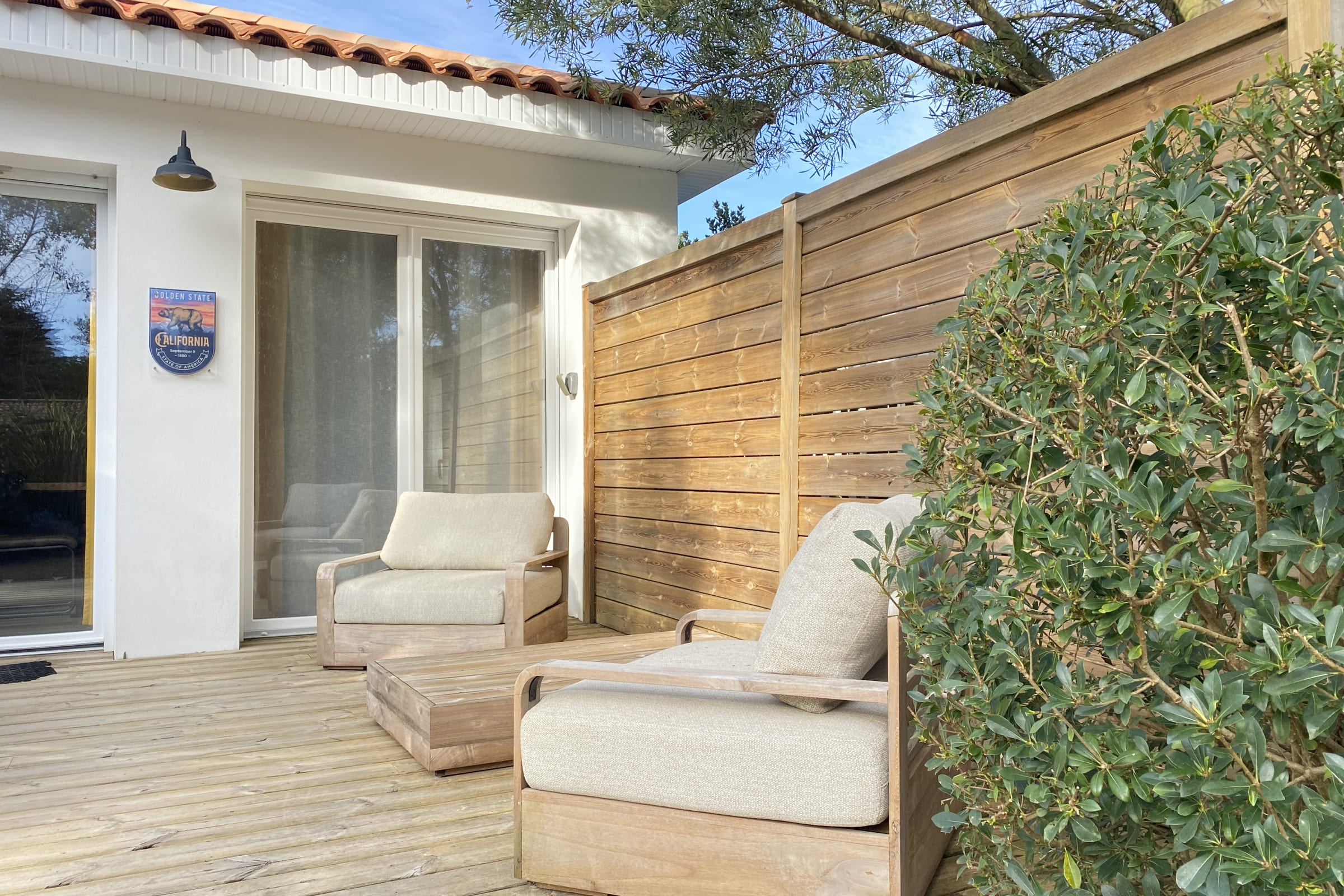 Decorated with a California theme, this 60m² house can accommodate up to 6 people. It has a living room and a fitted and fully equipped kitchen (oven, fridge-freezer, dishwasher, microwave, oven, filter coffee maker, toaster, Nespresso, kettle, microwave, ceramic hob, all necessary crockery, television (TNT channels), hair dryer, washing machine, iron and ironing board).