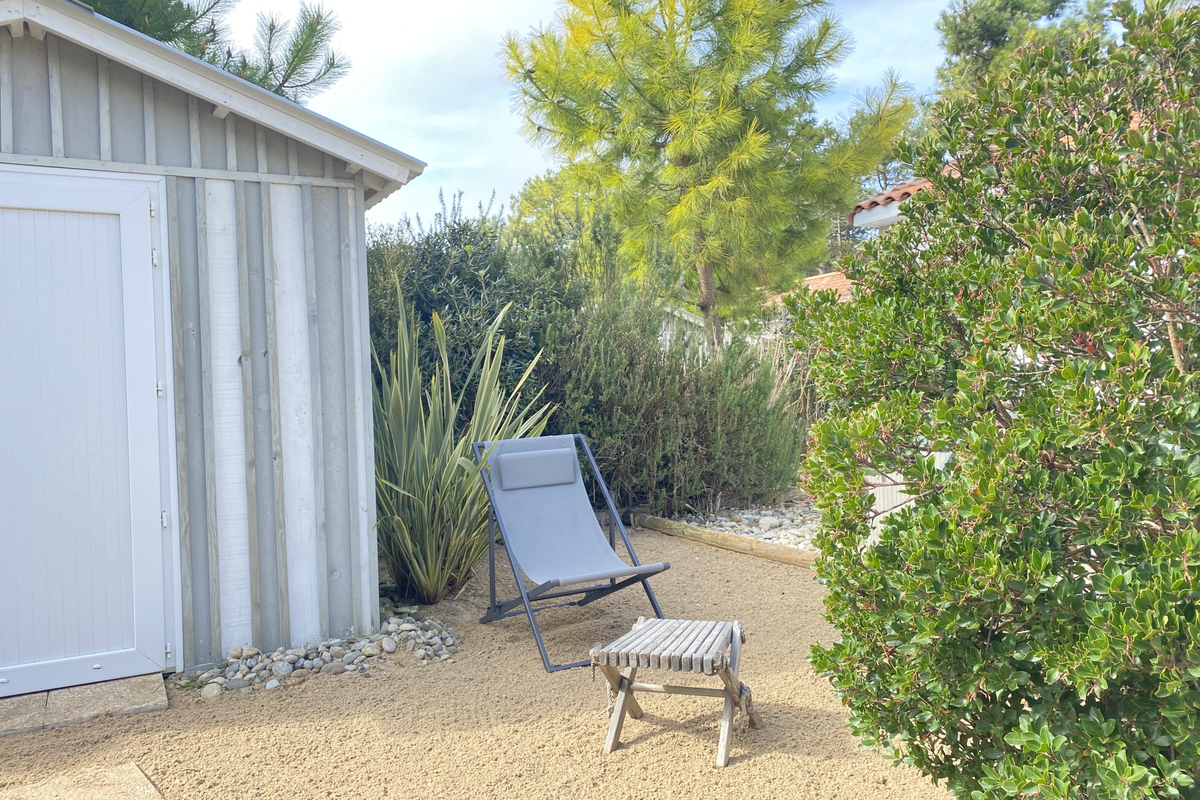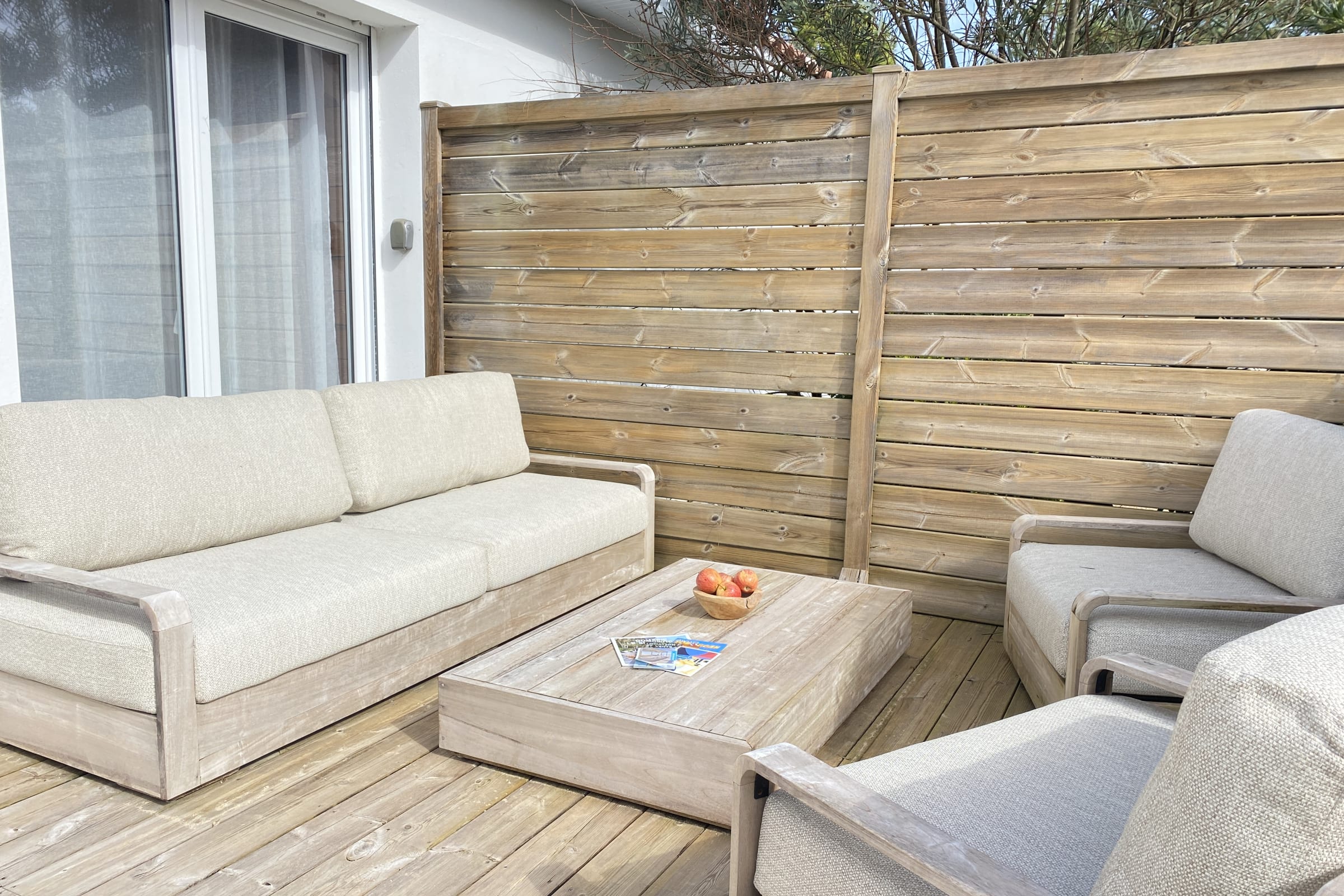 The sleeping area has two bedrooms with double beds and the convertible double sofa bed in the living room offers an additional bed for 2 people. Outside, you can enjoy a beautiful wooden terrace with all the garden furniture for a successful holiday (outdoor table and chairs, parasol, barbecue or electric plancha ...).