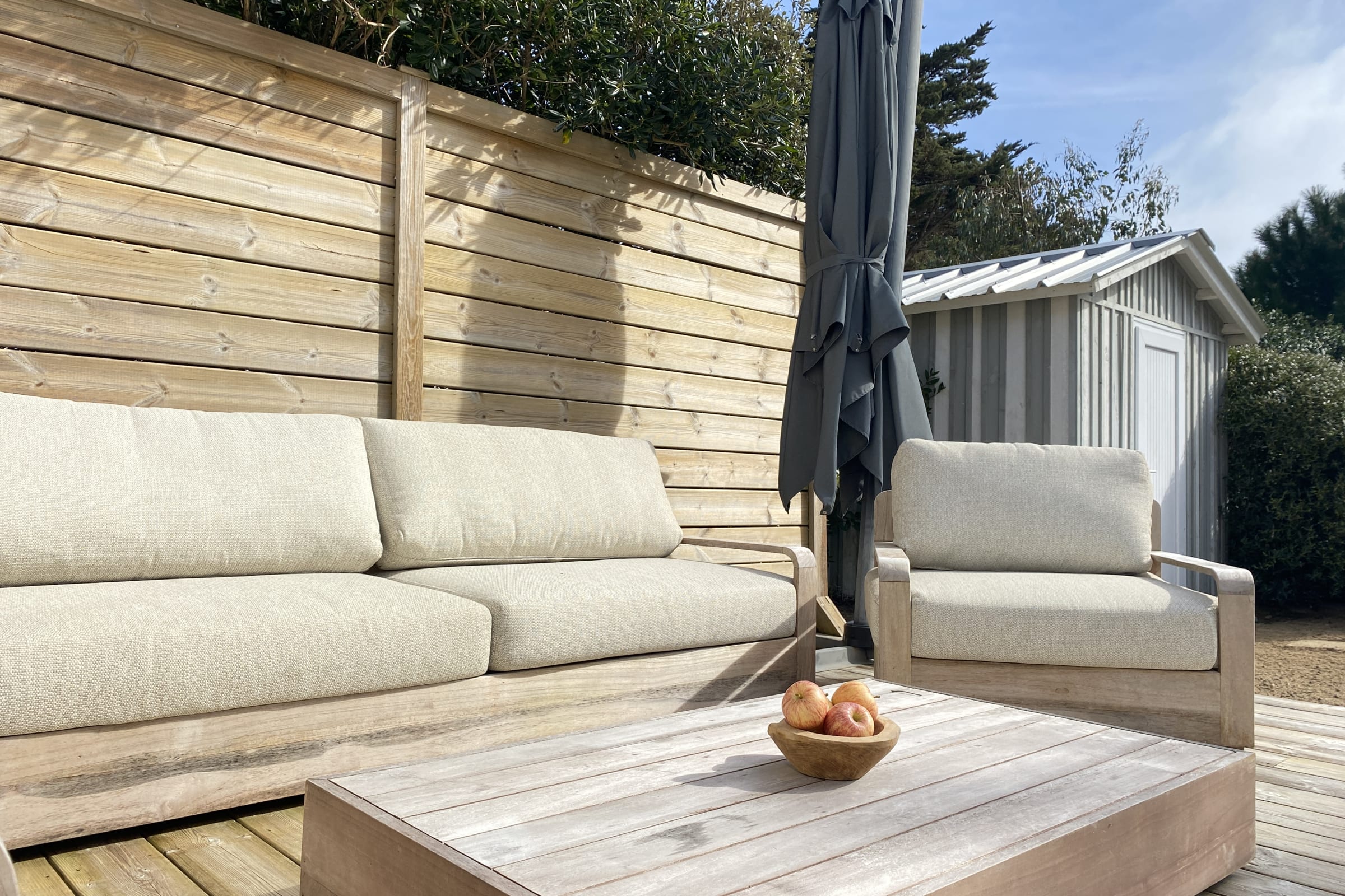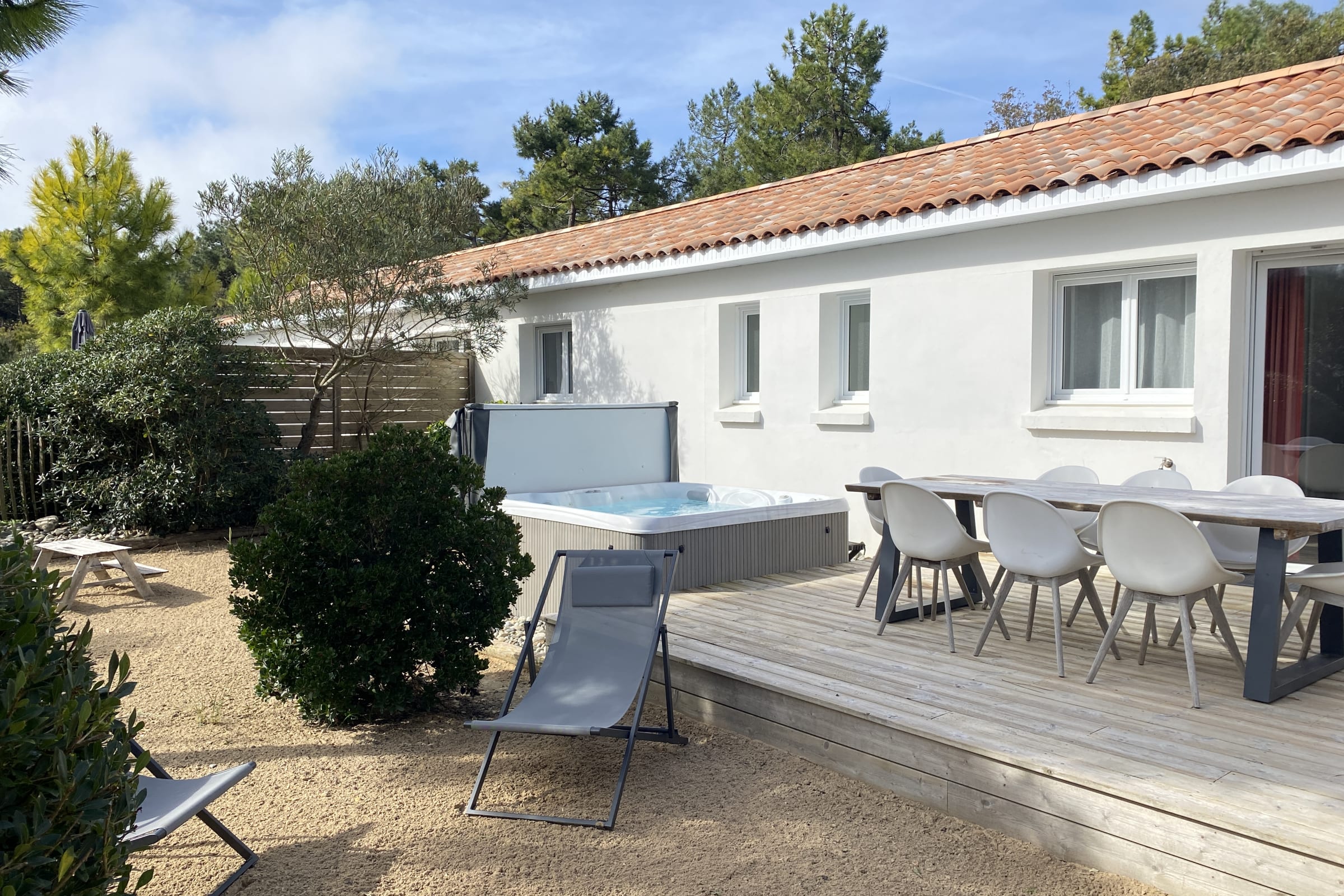 The sleeping area has three bedrooms with double beds and the living room's convertible double sofa bed offers an additional bed for 2 people. Outside, you can enjoy a beautiful wooden terrace with all the garden furniture for a successful holiday (outdoor table and chairs, parasol, barbecue or electric plancha ...).