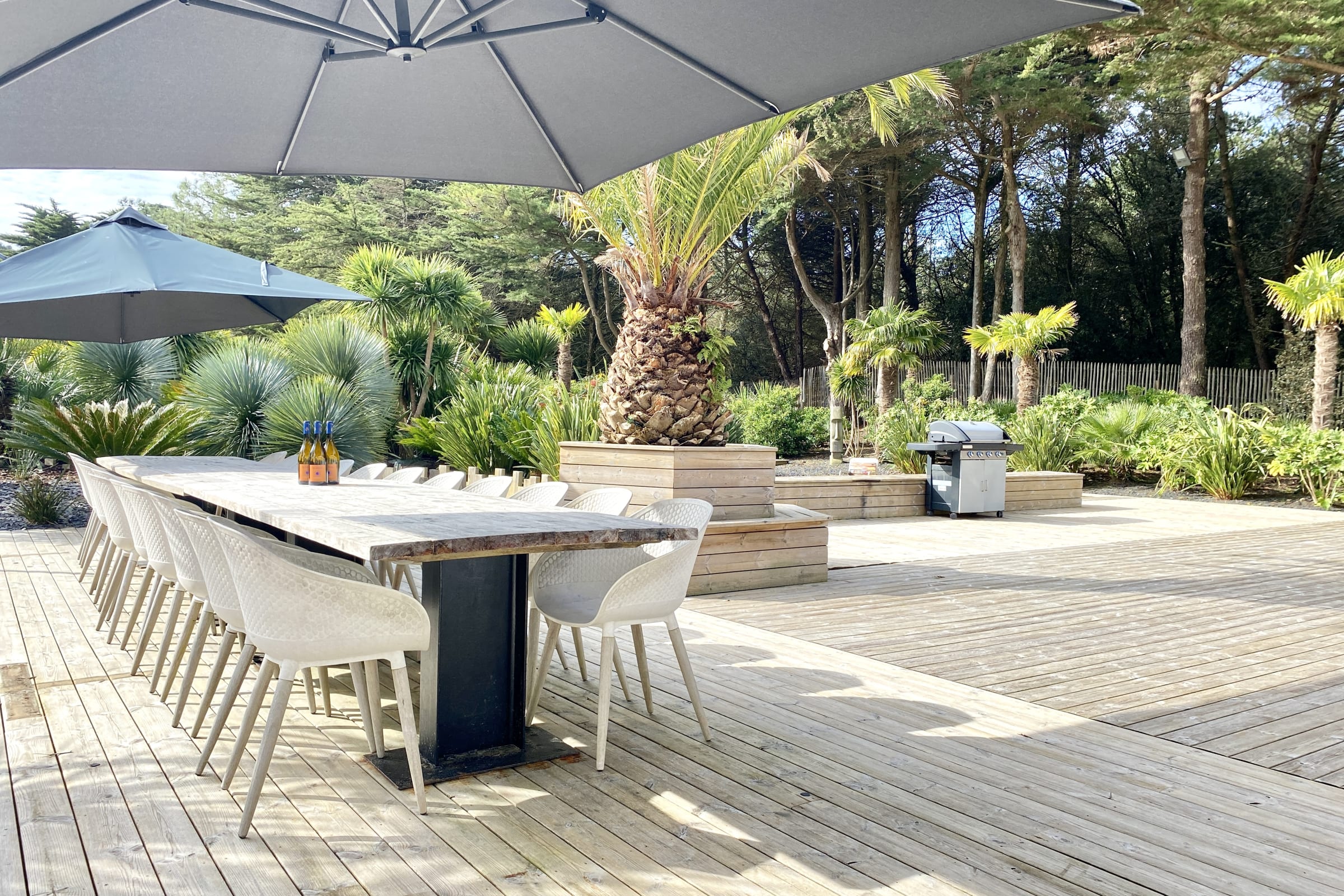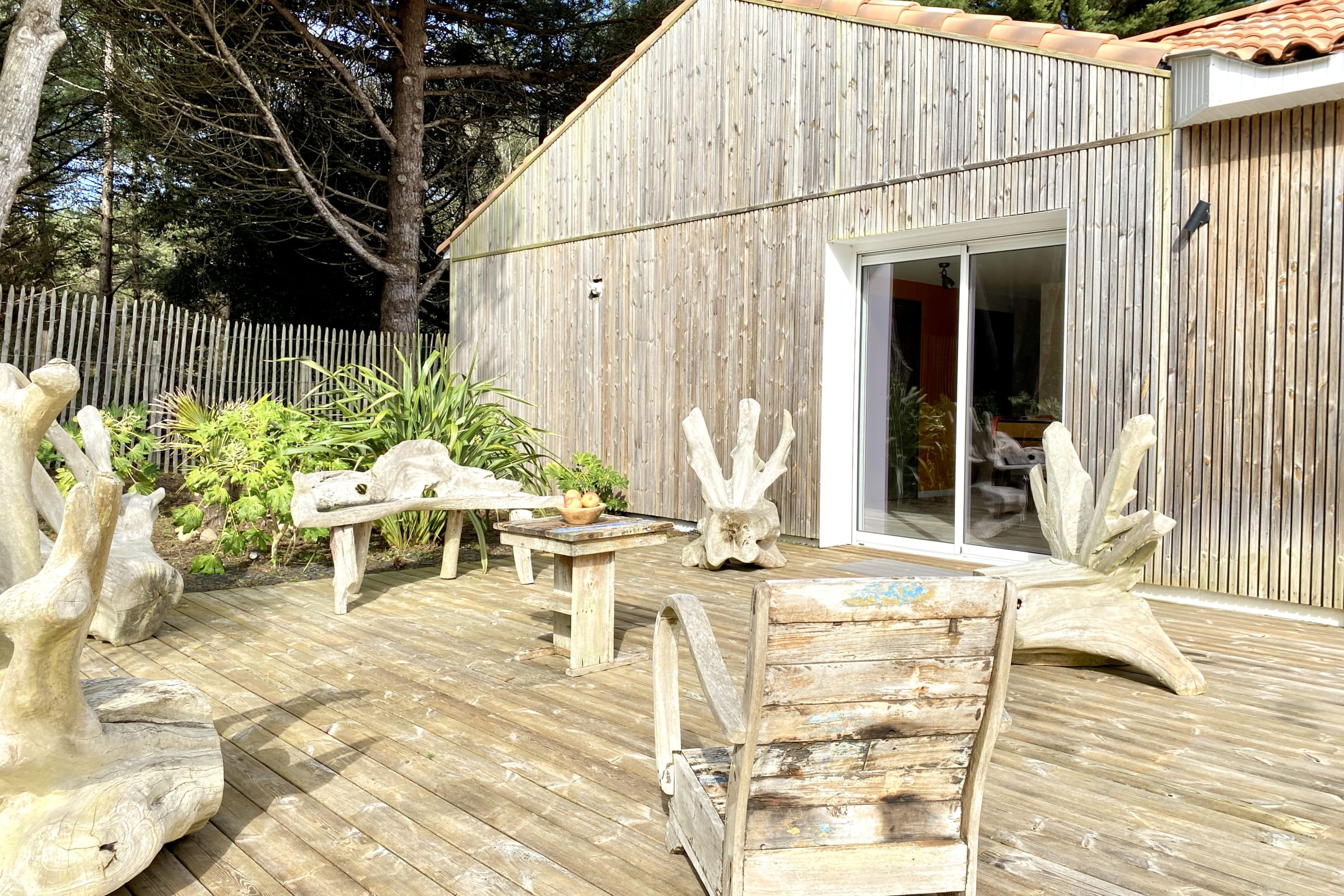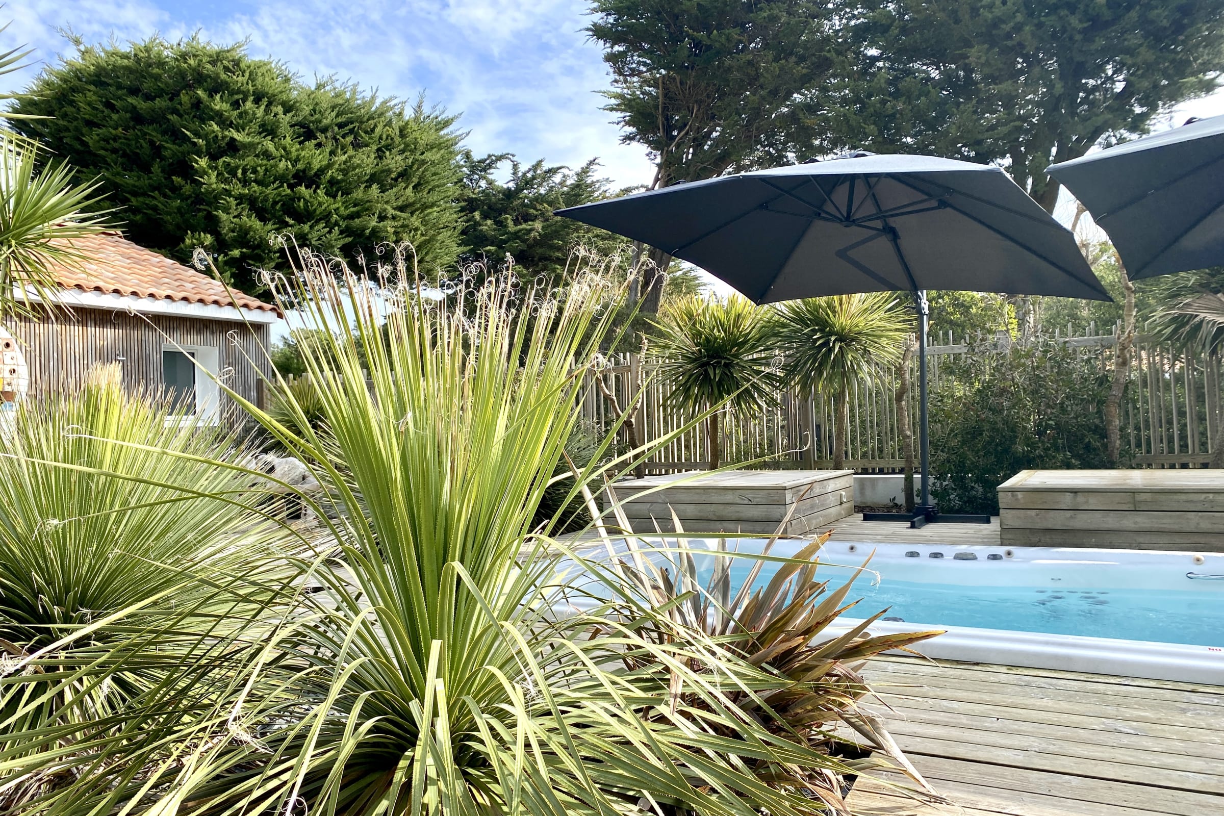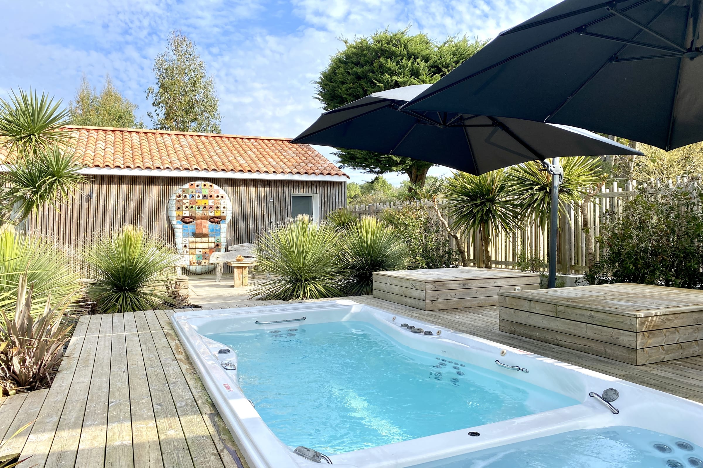 Outside, you will find a large private terrace with beautiful garden furniture, barbecue and gas plancha, hammocks, as well as a swim spa (optional). An aquabike is at your disposal.