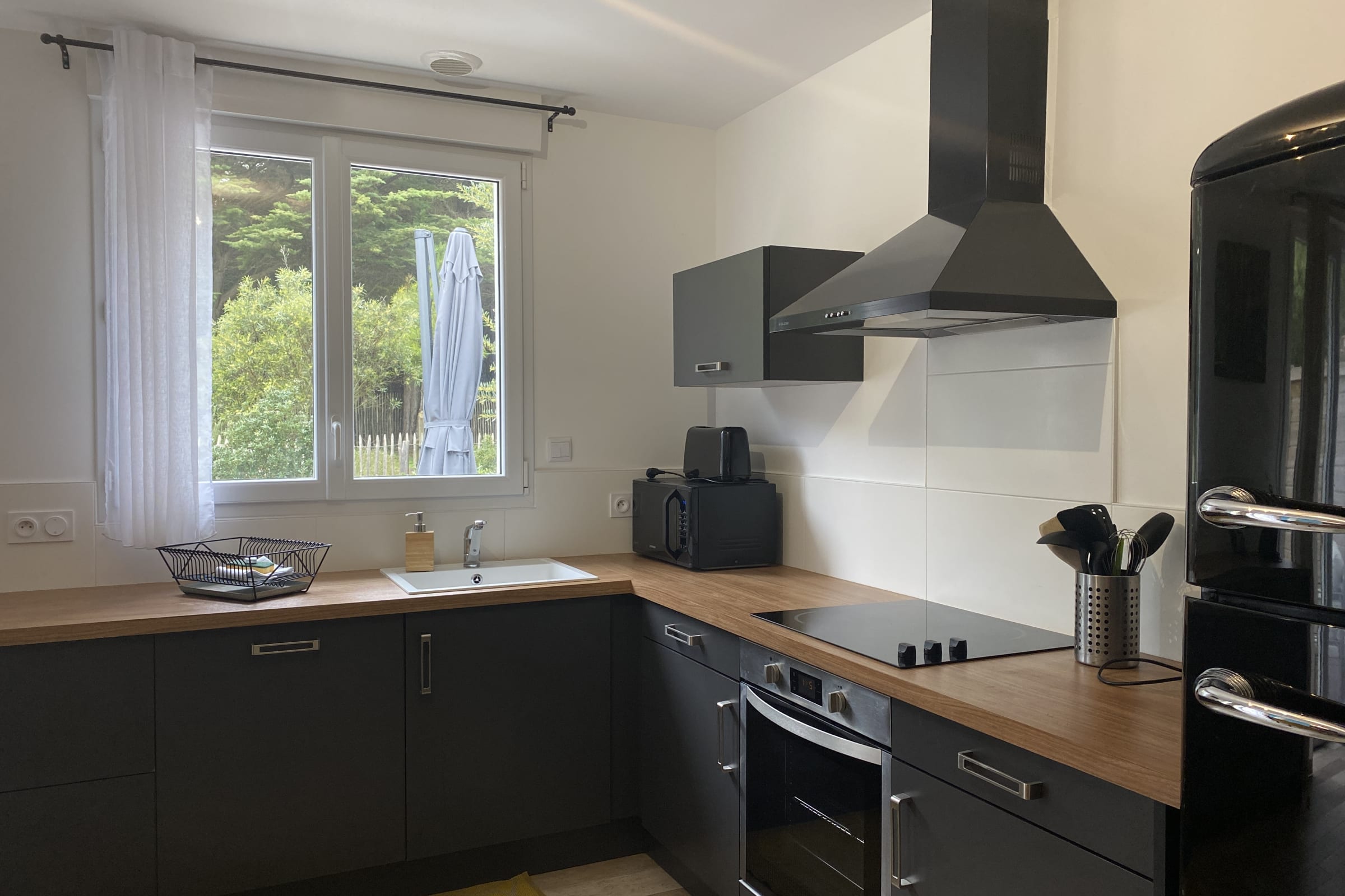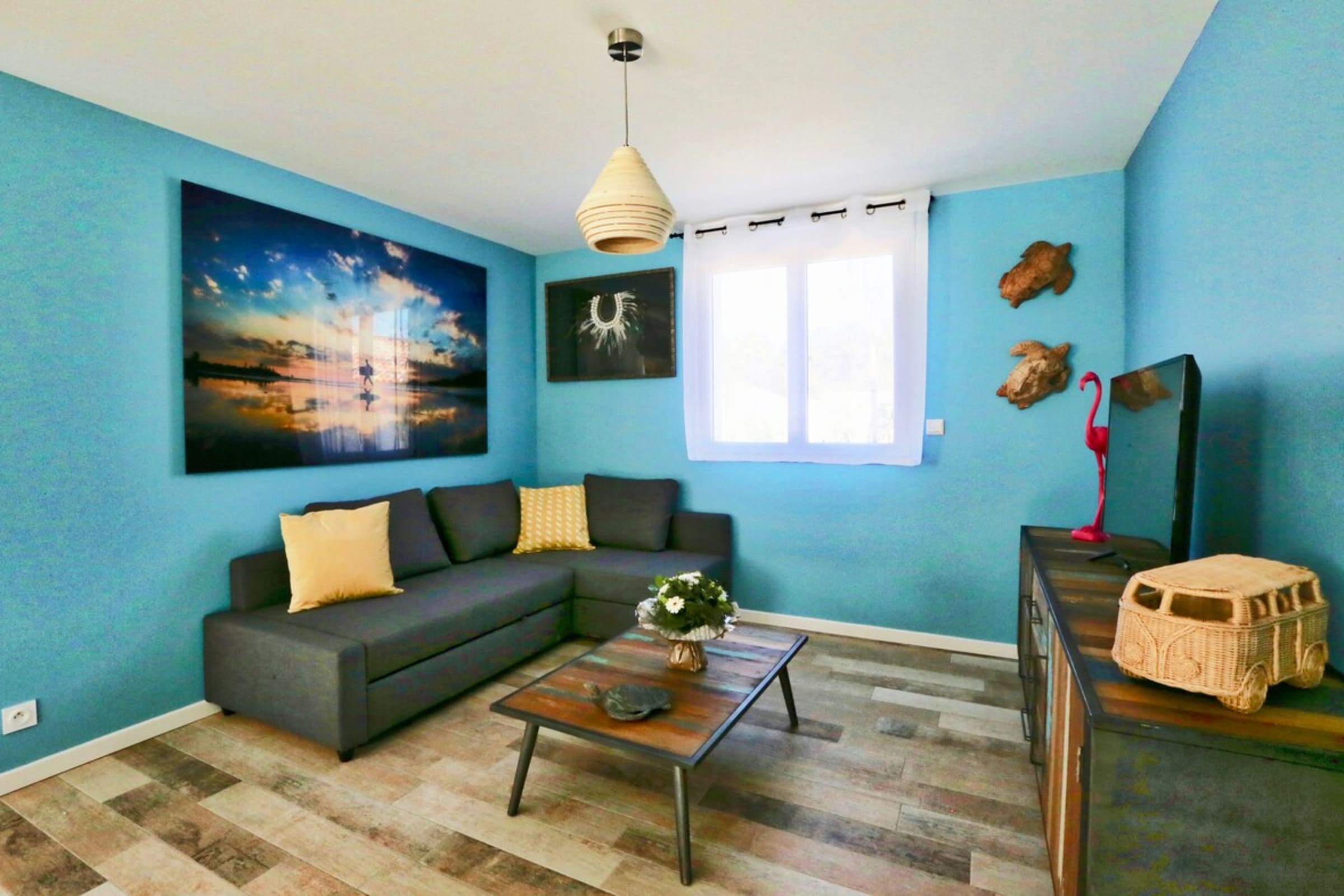 Decorated with a Hawaiian theme, this 70m² house can accommodate up to 8 people. It has a living room and a fitted and fully equipped kitchen (oven, fridge-freezer, dishwasher, microwave, oven, filter coffee maker, toaster, Nespresso, kettle, microwave, ceramic hob, all necessary crockery, television (TNT channels), hair dryer, washing machine, iron and ironing board).