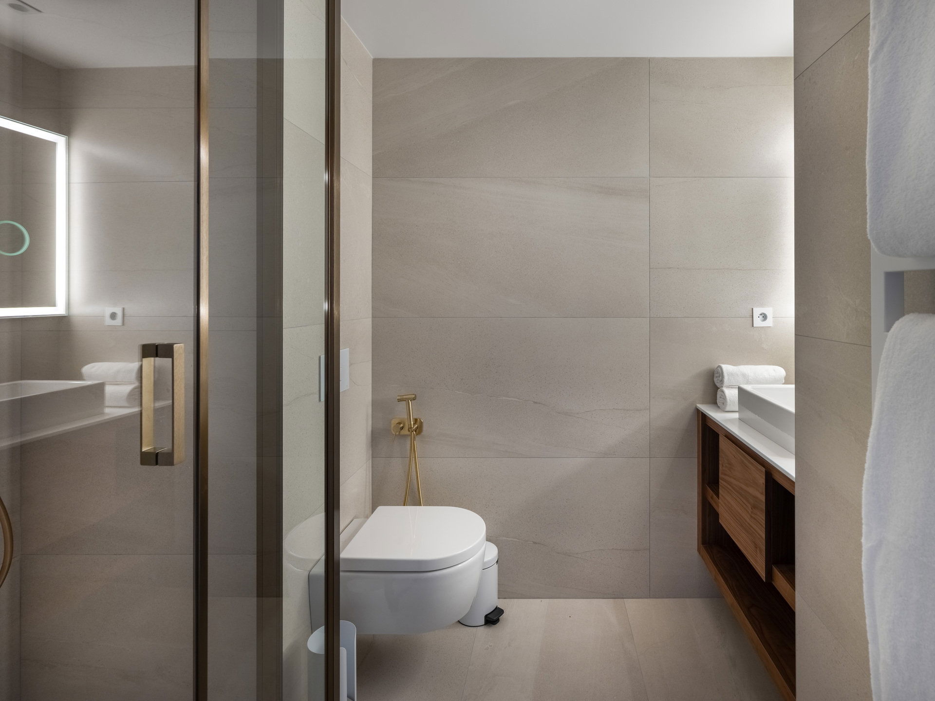 - Double bedroom (180x200 cm) with TV, closet and balcony en suite with a shower room and toilets,