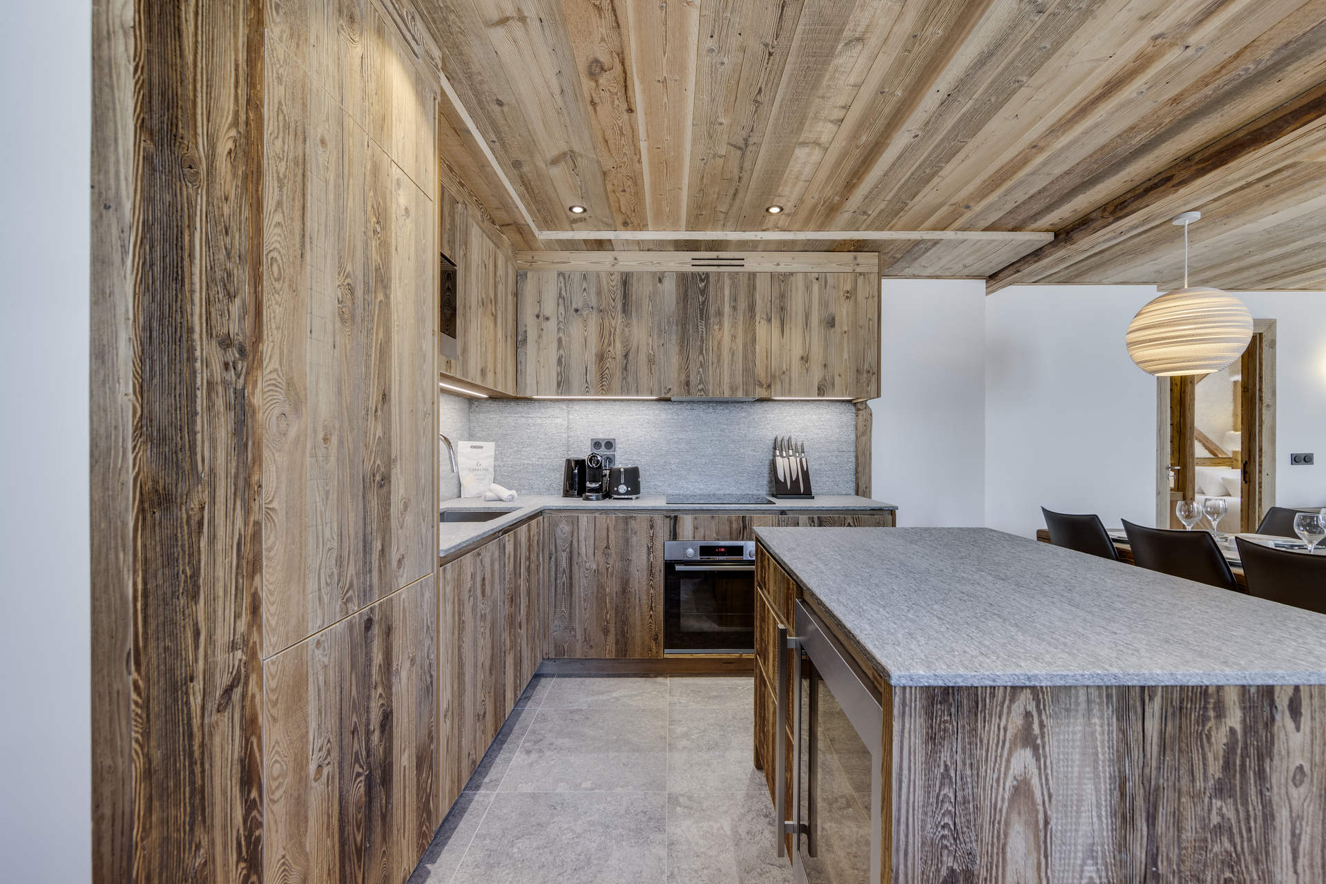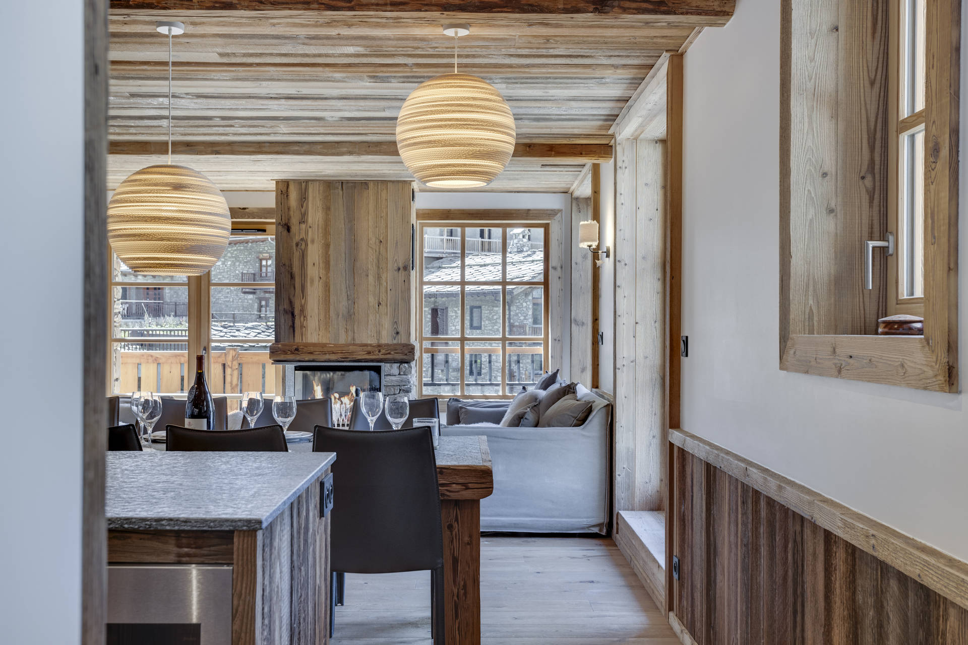 - Living room with fireplace, connected TV, fully equipped kitchen area with central island
