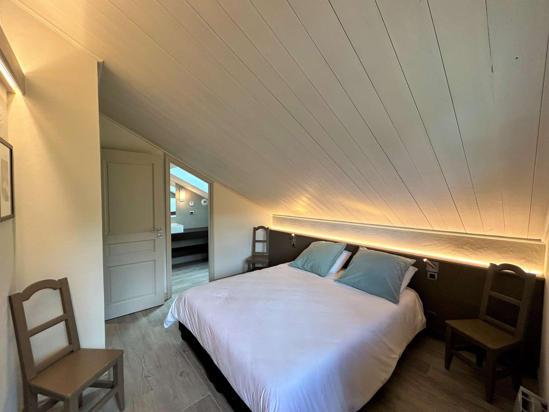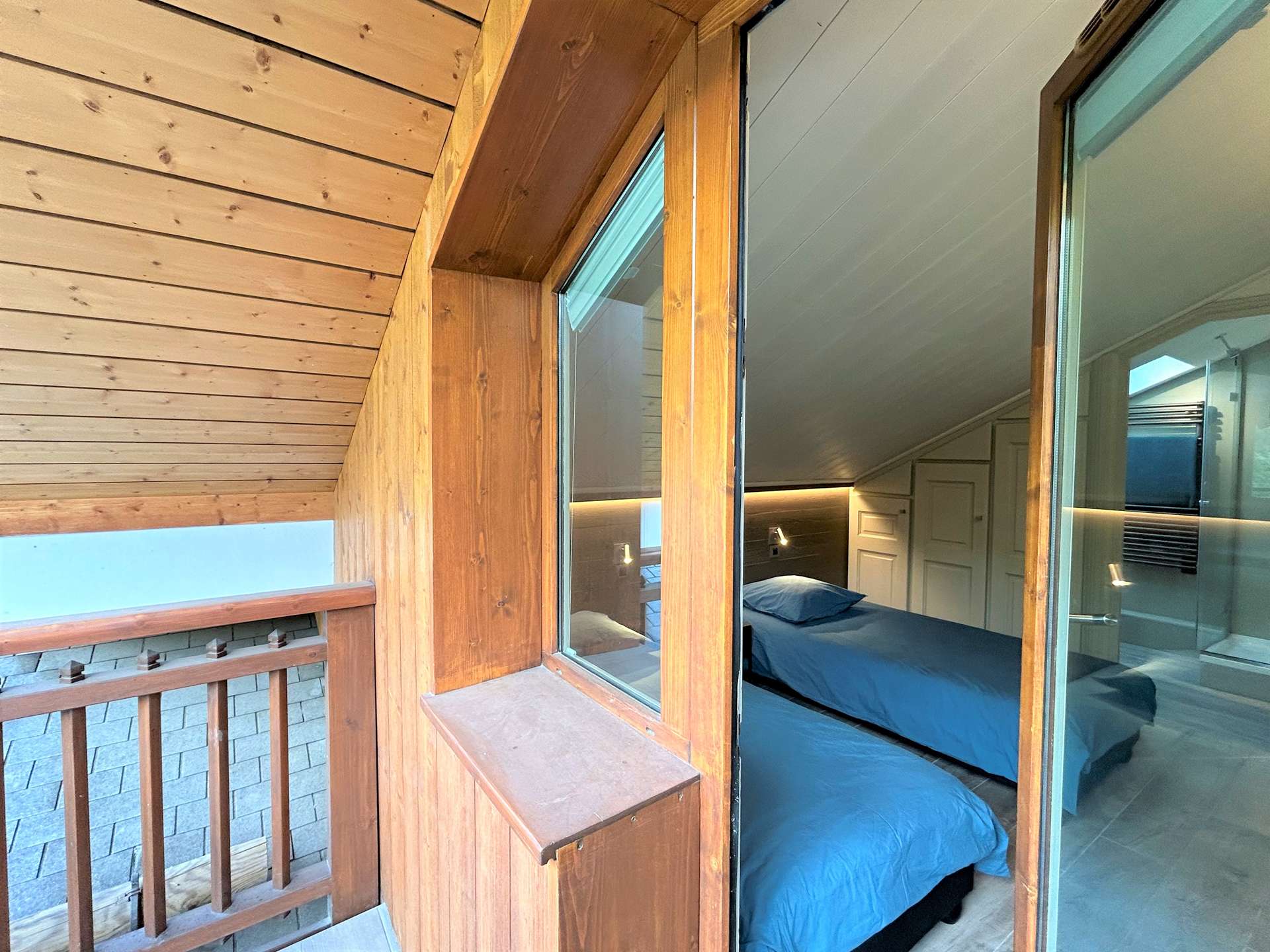 It also includes on the floor an en-suite bedroom with double bed, shower room and balcony, 1 separate toilet. Upstairs you have a bedroom en suite with double bed (160), shower room, toilet and balcony, a bedroom en suite with 2 single beds (90), shower room, toilet and balcony.